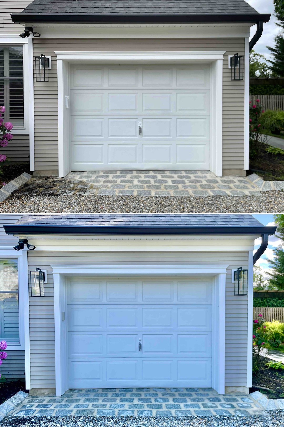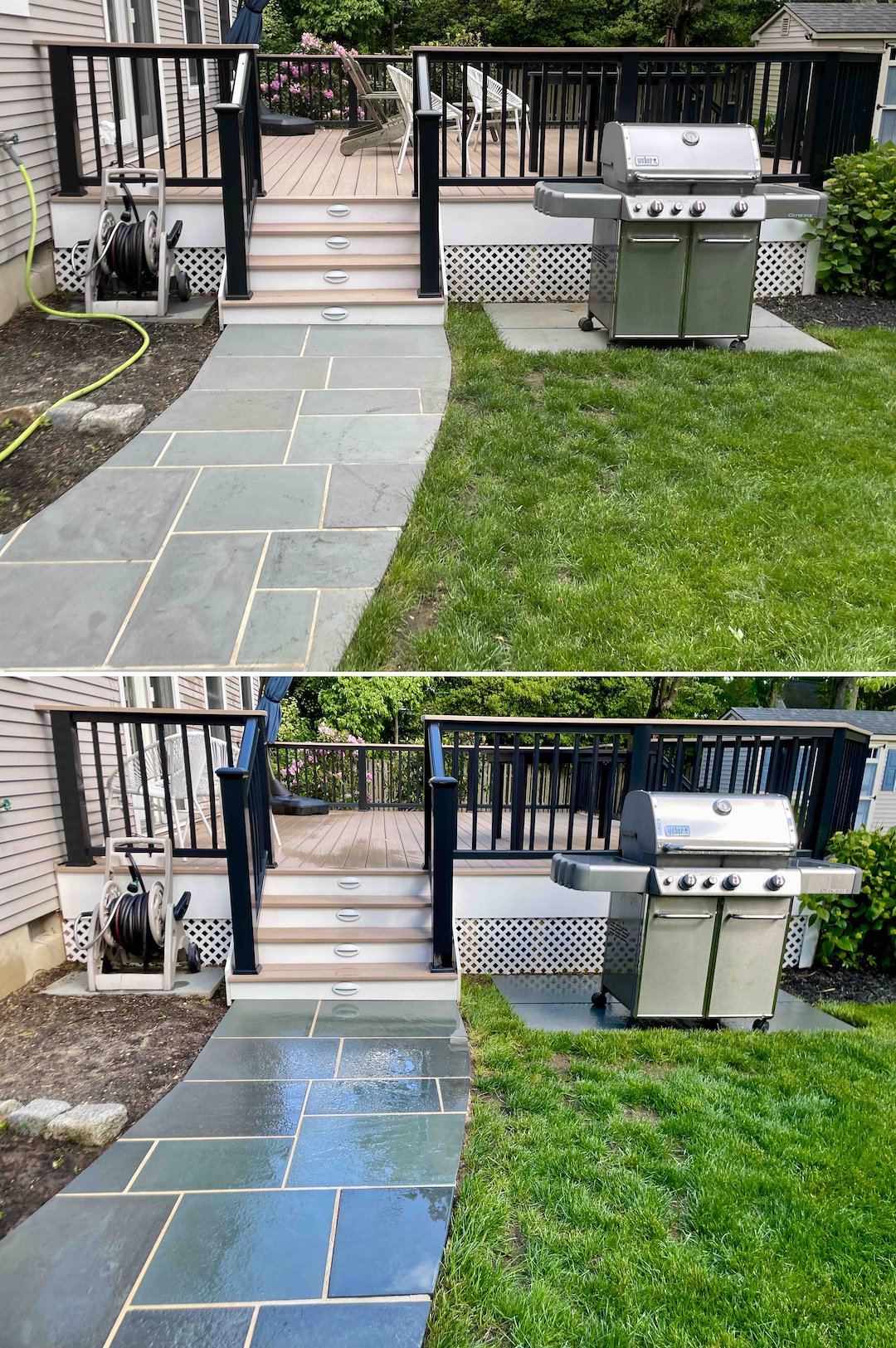 Masonry work followed the deck. Rust stains on bluestone are hard to remove with a garden hose, so we performed a targeted, surgical rust treatment on the affected stones. We also deep-cleaned the Belgian block in the driveway, restoring its high-end curb appeal without using overly harsh methods. This focused cleaning brought the natural color and texture of the stone back to life.