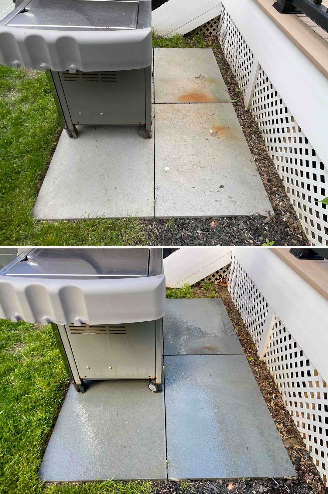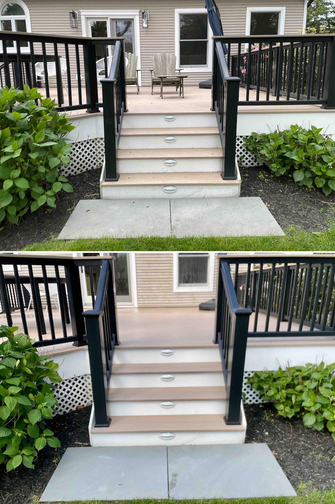 The composite deck and stairs were the real pain point. Composite materials can hold deep-seated mold that makes steps and landings risky, and standard pressure washing can cause damage. We soft washed the entire rear deck, the stairs, and the lattice, removing the mold and grime so the surfaces are safe and barefoot-ready again. The family could tell the difference immediately, with cleaner, non-slippery steps and a deck that feels cared for instead of neglected.