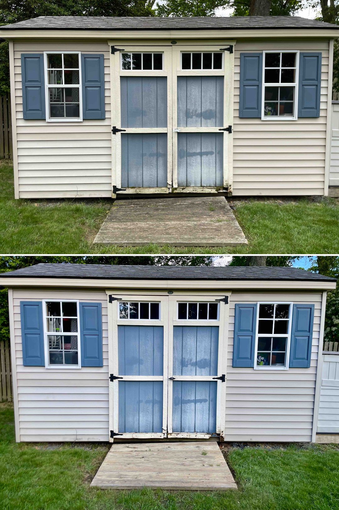 We began with a full-scale Soft Wash House Cleaning. Using low-pressure chemistry rather than destructive high pressure, we sterilized the siding, which kills the root of the problem and helps slow regrowth. That same gentle approach allowed us to clean out-of-reach skylights and a detached shed safely, work many contractors avoid because of access and fragility. Low pressure protects window seals and trim while still delivering a thorough clean.