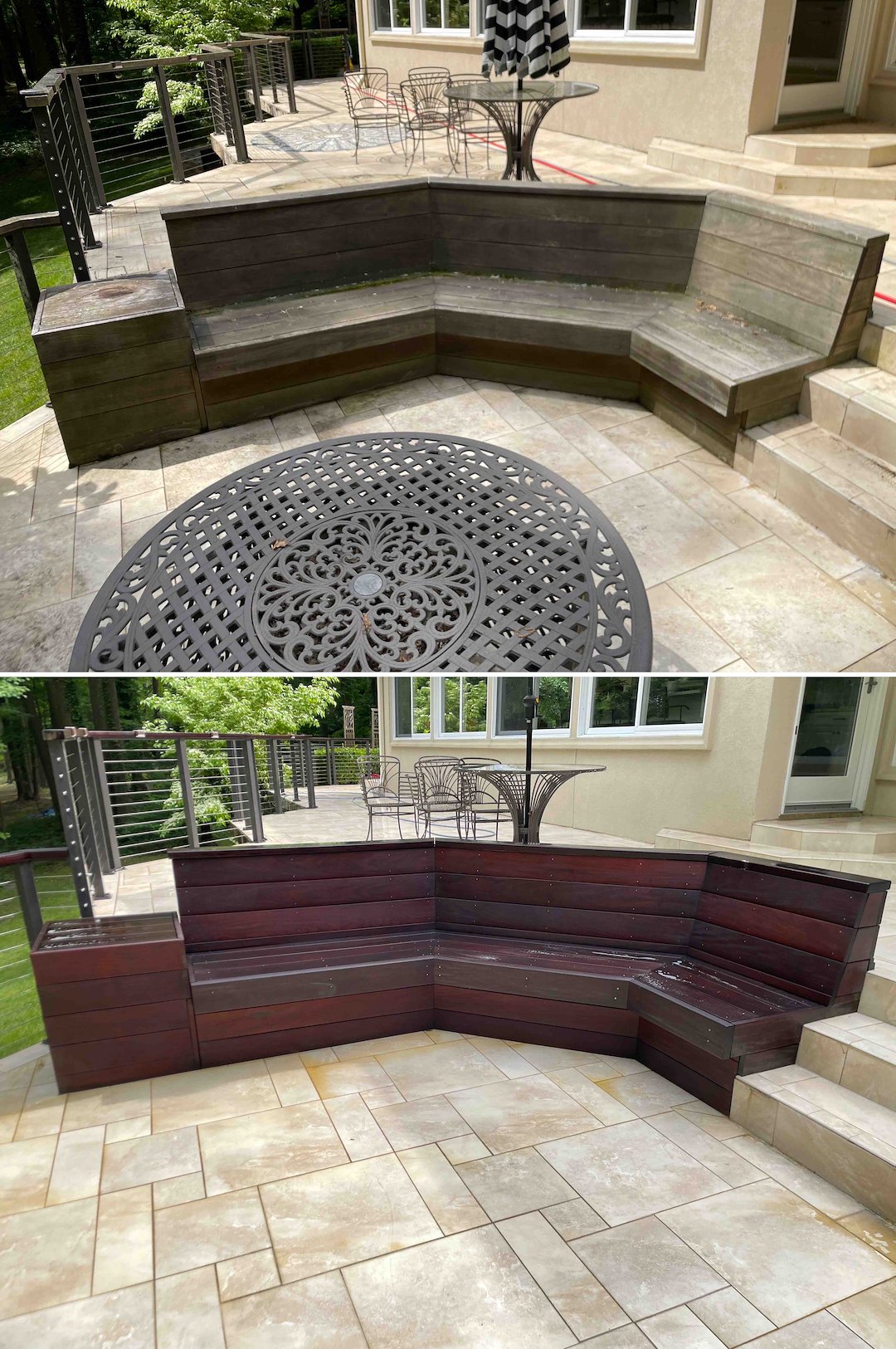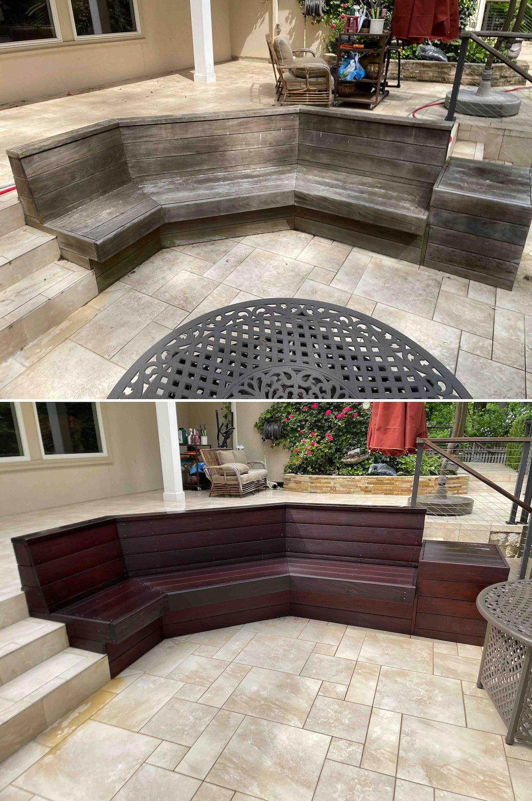 Our restoration process carefully removed the biological buildup while preserving the integrity of the wood. Because we did not subject the Ipe to damaging pressure, the finish regained its natural beauty and strength, effectively saving the homeowner thousands of dollars in premature replacement costs. The result was restored benches and railings that look healthy and are structurally sound again.