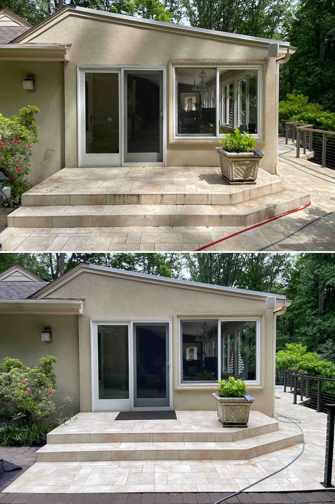 To complete the exterior package, we performed a targeted stucco soft wash on the rear of the home. That work removed unsightly algae stains and also eliminated active wasp nests that were plaguing the patio area. The soft wash removed surface staining safely and addressed pest hazards at the same time, improving both appearance and usability of the patio.