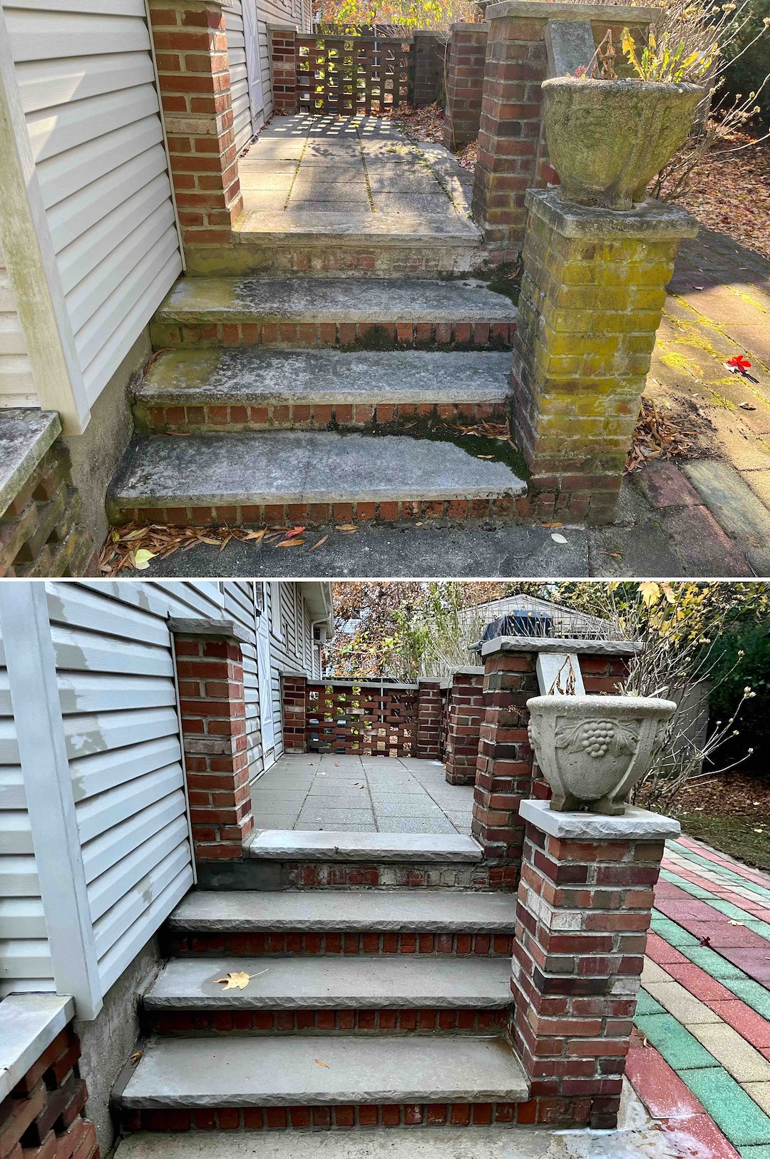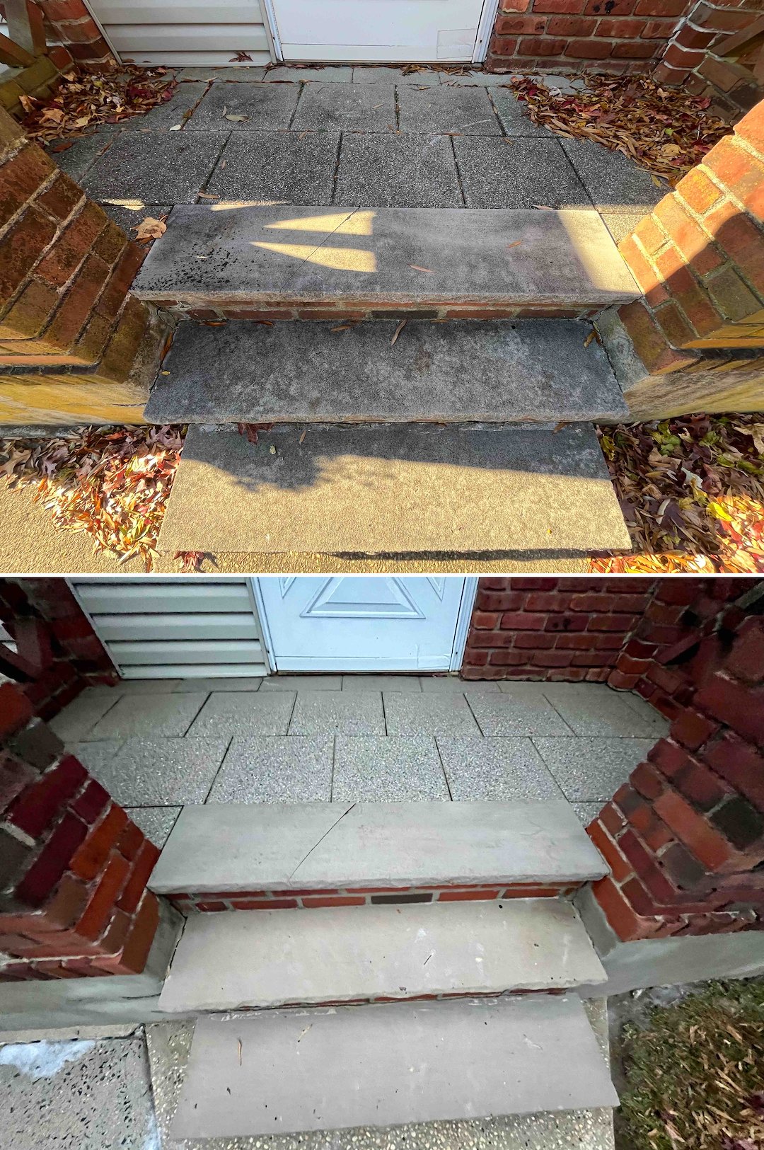 Concrete and brick trim, including the driveway and front stairs, were a dark, slippery mess from black mold and grime. We pretreated the concrete with our soft wash solution to break the biological bond, then followed with a professional rinse that pulls grime out of the concrete pores. The surface is no longer a slip hazard, and the entry now presents a clean, safer approach to the house.