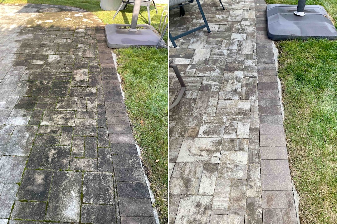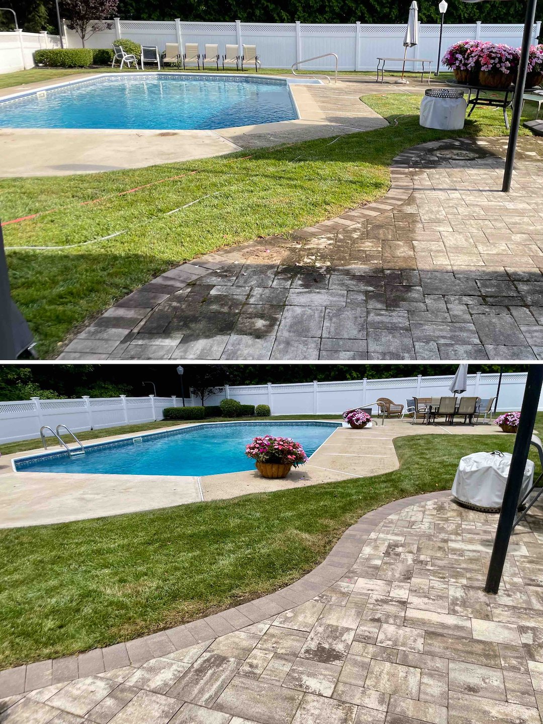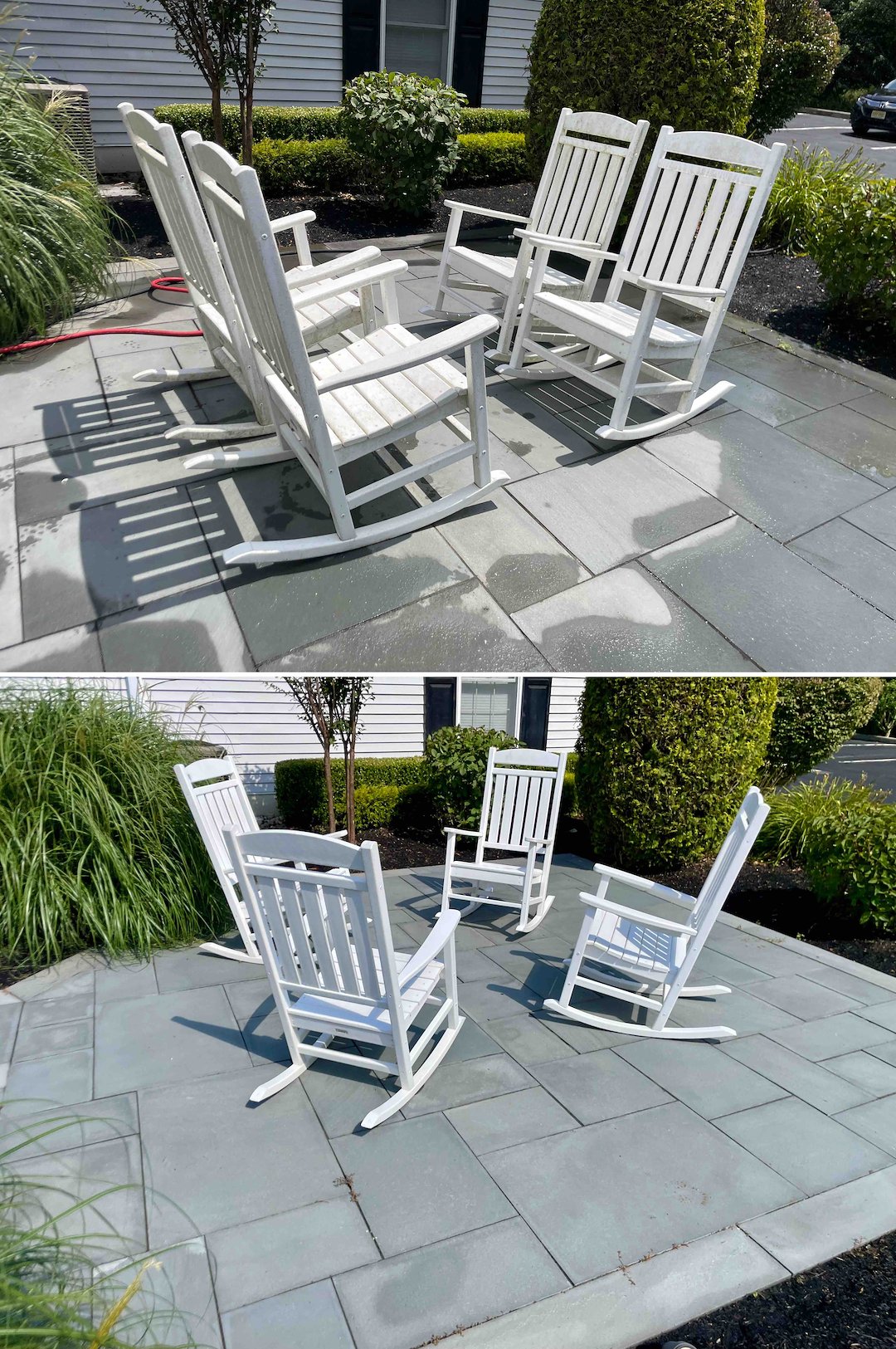 The standout transformation was the rear bluestone patio. Bluestone is porous and will darken as mold and lichen settle into the pores. High pressure would etch and ruin the stone, so we applied a specialized soft wash treatment that lifts the mold from the pores without scratching the surface. The patio's natural blue-grey tones returned, giving the area a like-new look without any surface damage.