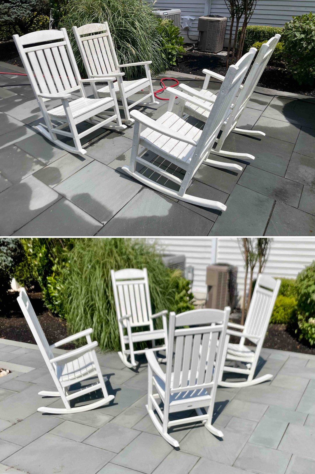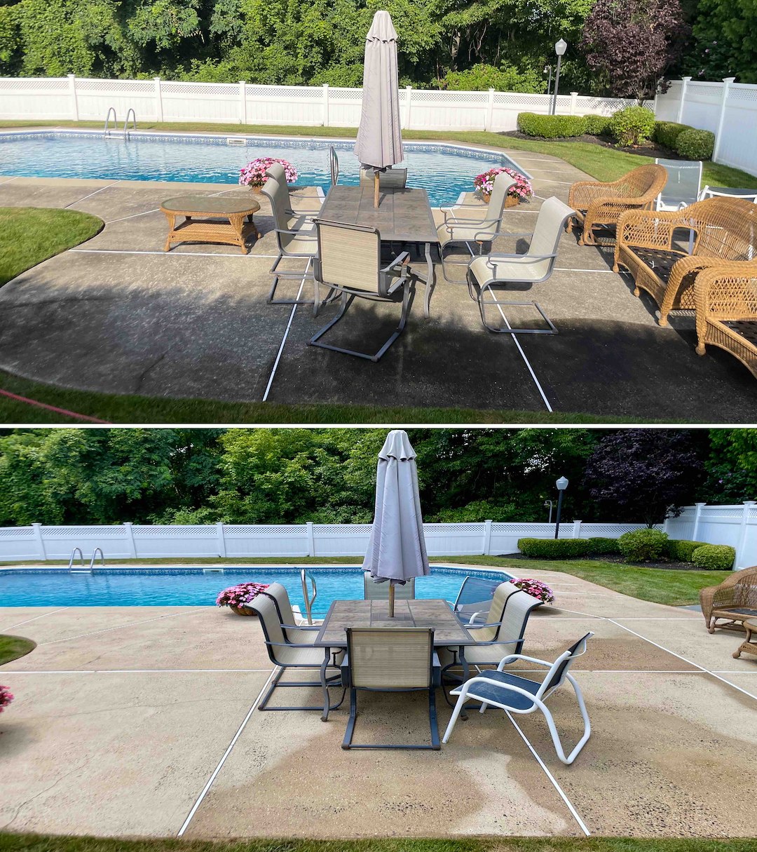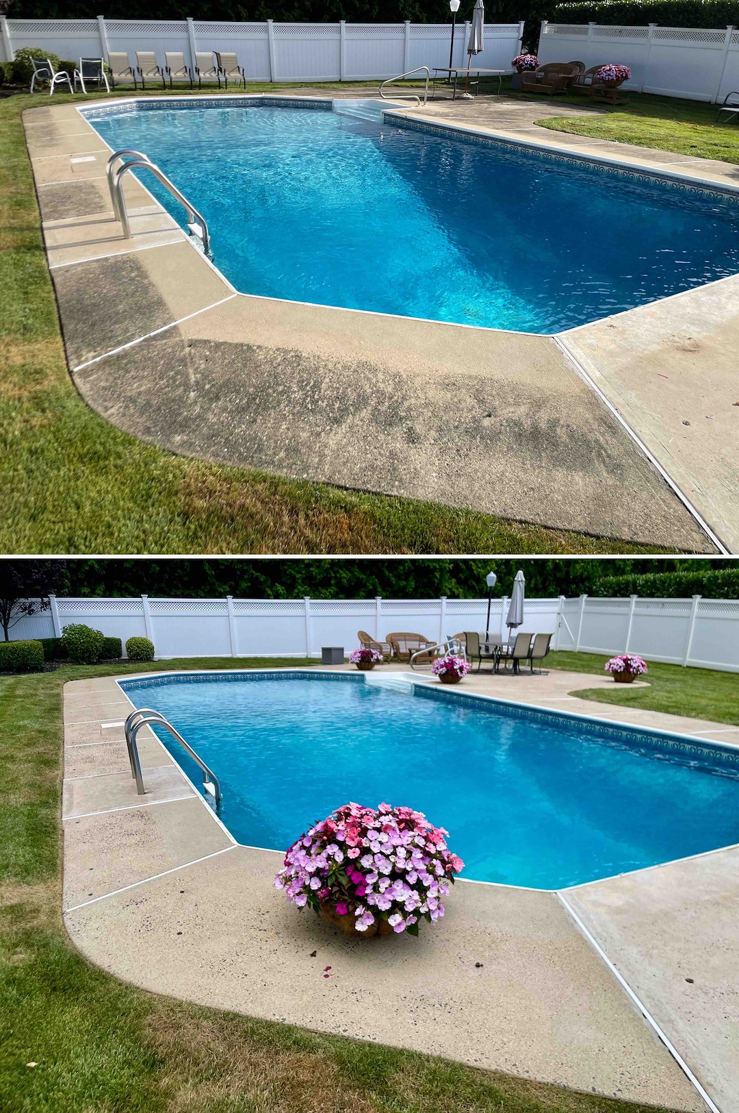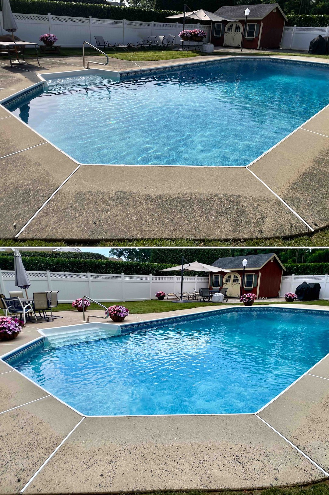 We also soft washed the two-story vinyl siding with a soap-based solution that kills algae spores rather than forcing them off with pressure. The concrete walkways and pool deck received treatments to remove slick black biofilm, improving safety by reducing slip hazards. The elevated fiberglass balcony, Adirondack chairs, white vinyl fencing around the pool, and the main sign were all restored so the business looked impeccable from the road.