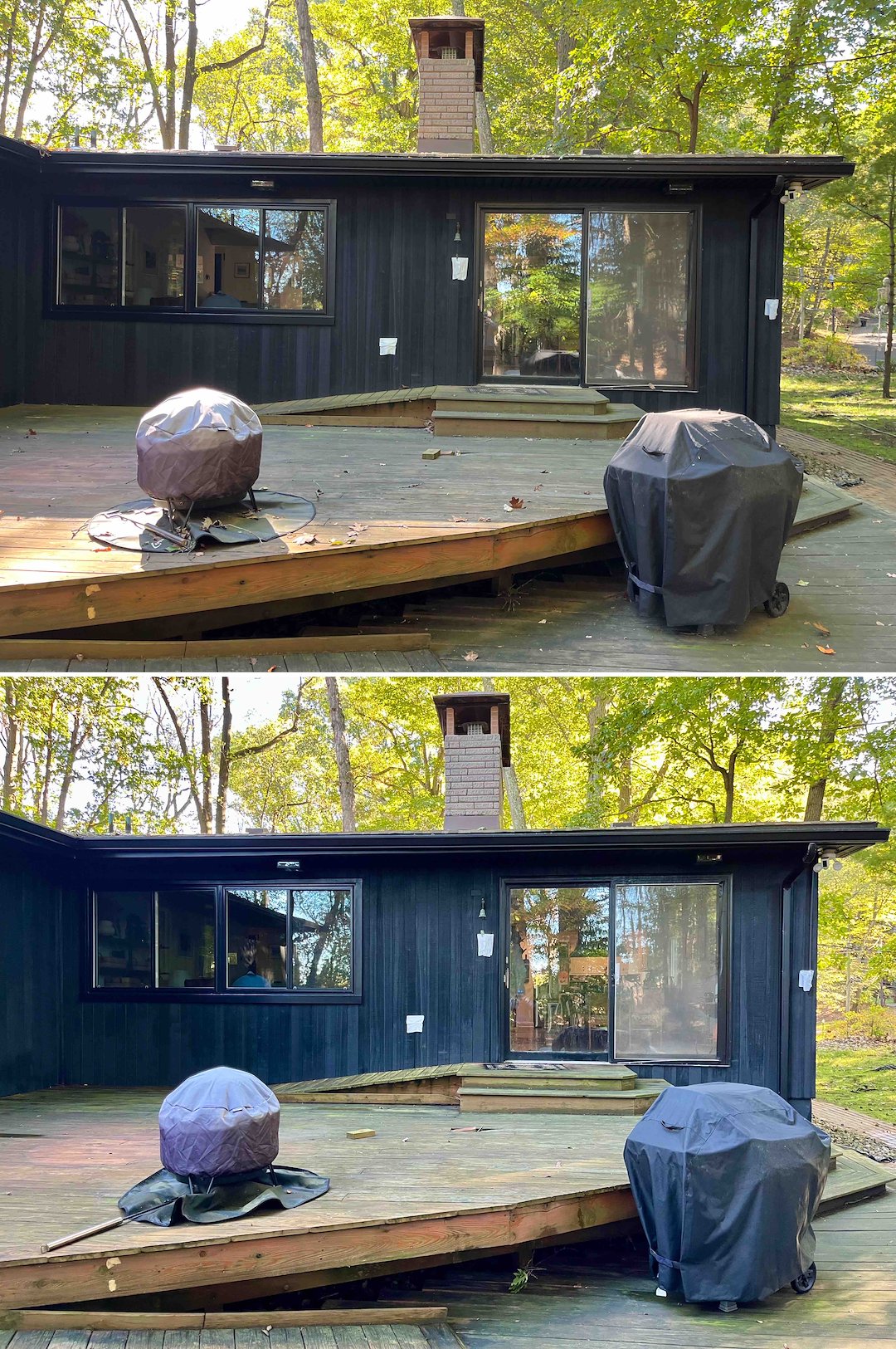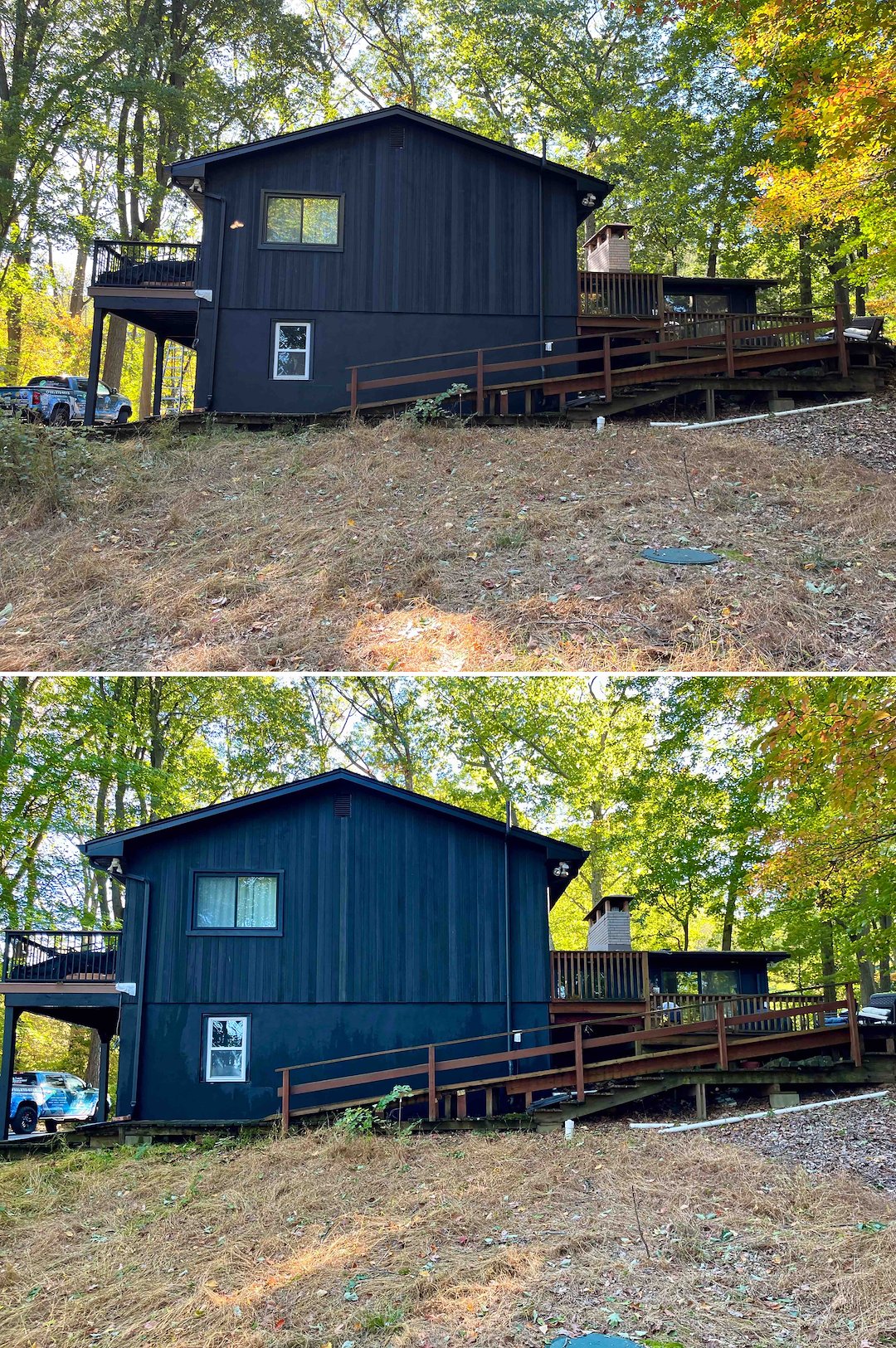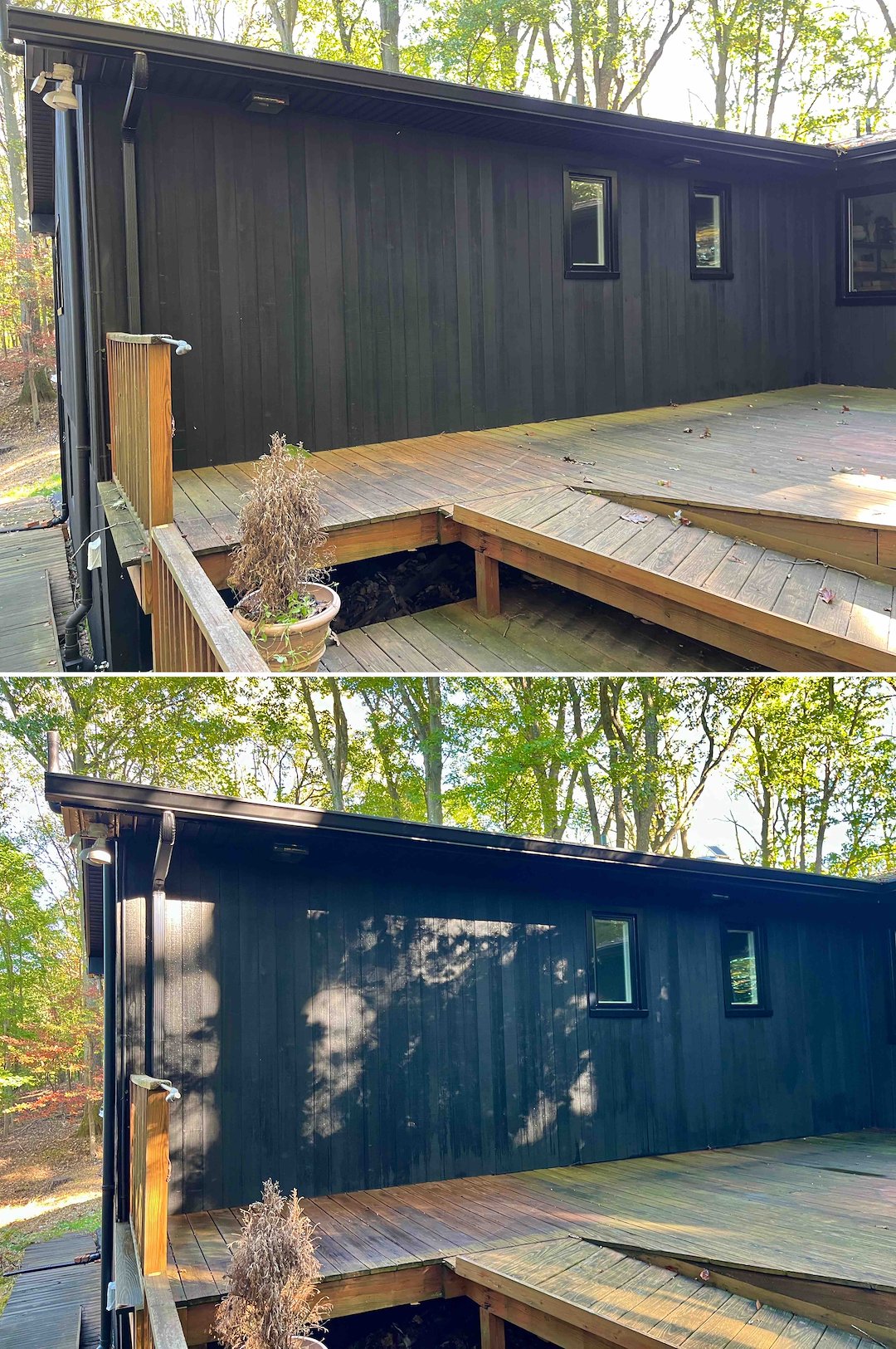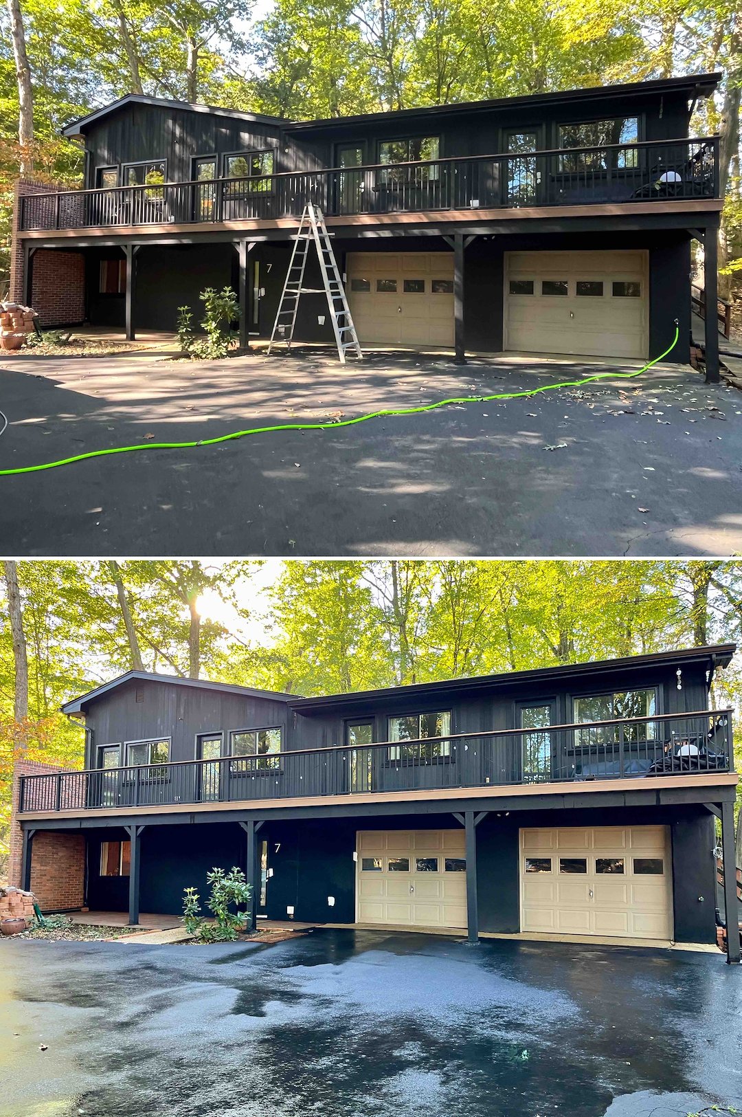 Decks on this property needed extensive attention. An elevated balcony and an overhanging deck were trapping moisture and turning green, which can lead to slippery boards and wood rot. We treated all decking with our soft wash solution to kill algae at the root, then gently rinsed away the buildup so the wood looks refreshed and is safer to walk on.