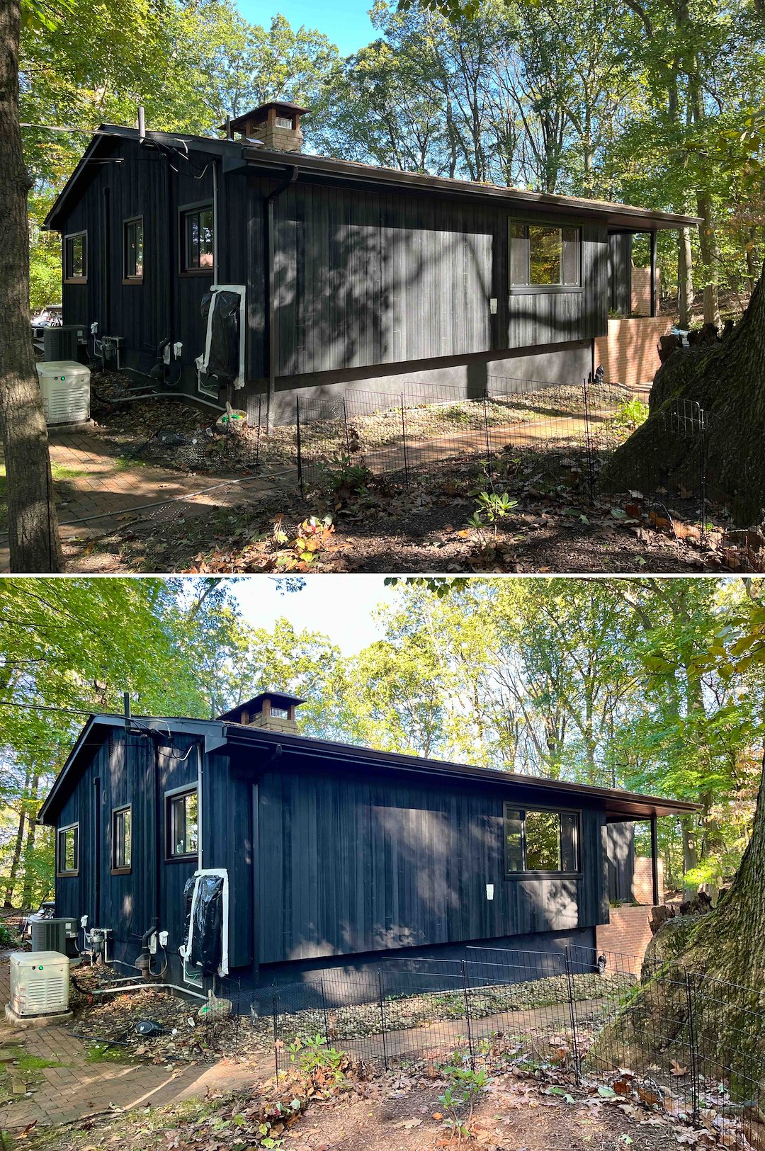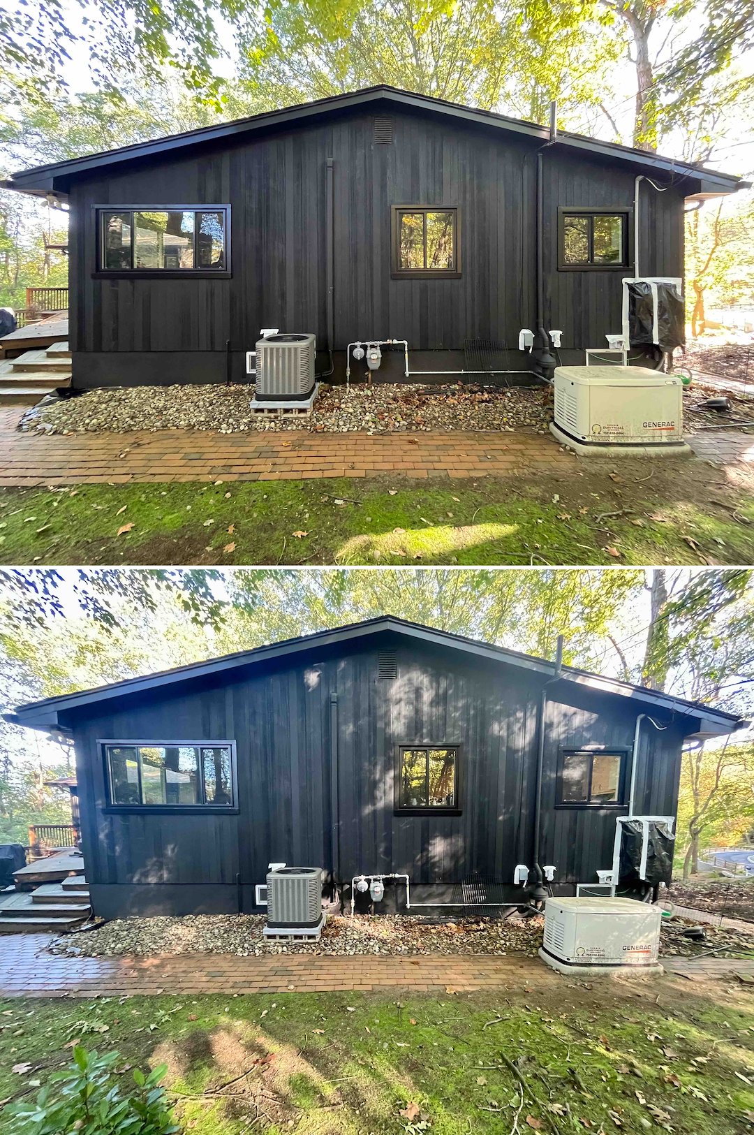 Because the house featured painted cedar siding, we used a deluxe house wash rather than high-pressure cleaning. We always start with a test spot in an inconspicuous area to confirm the chemistry is dialed in and safe for the surface. After the test confirmed it was safe, we soft washed the entire exterior including siding, windows, screens, trim, soffits, and eaves.