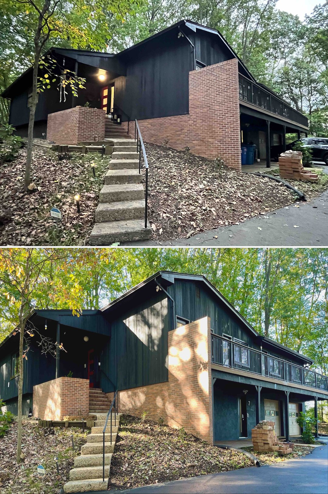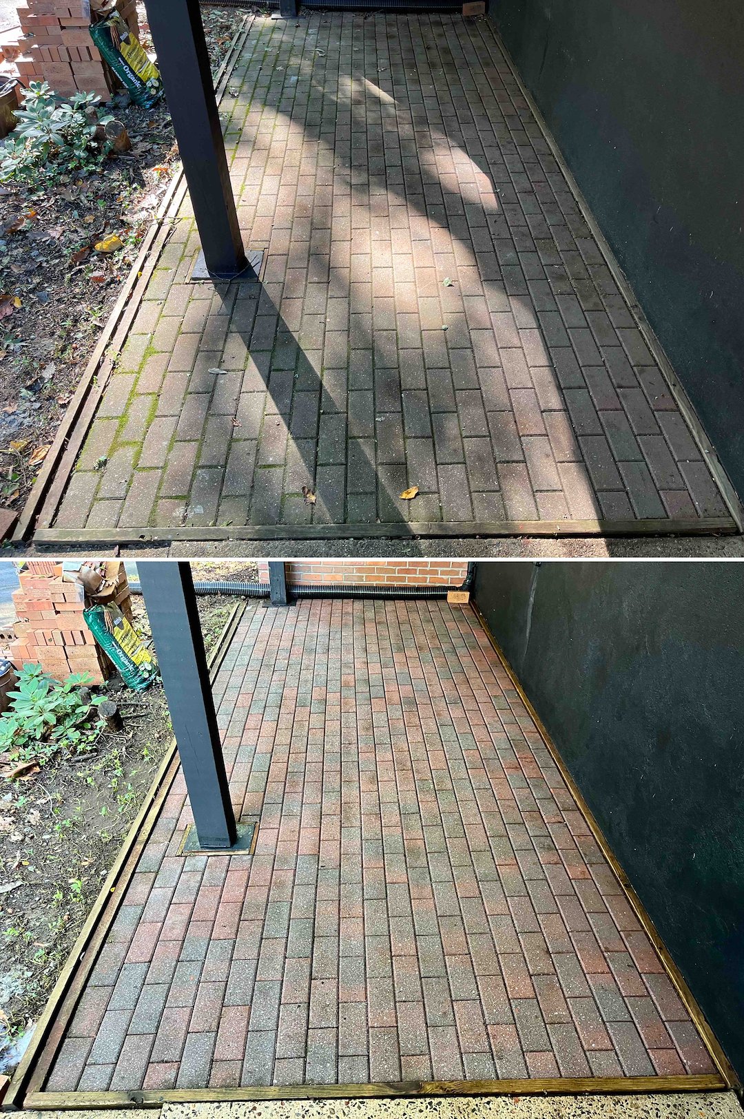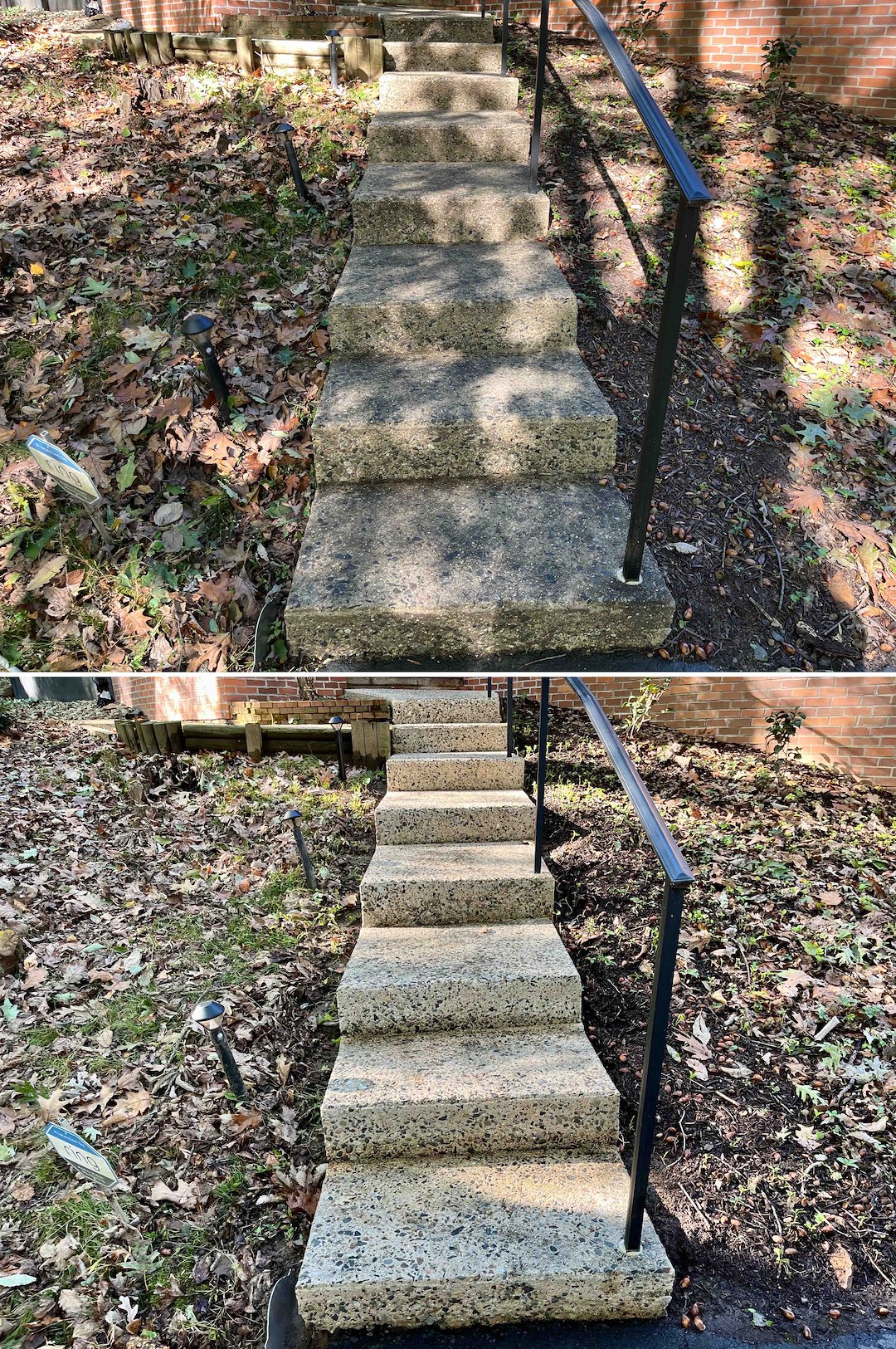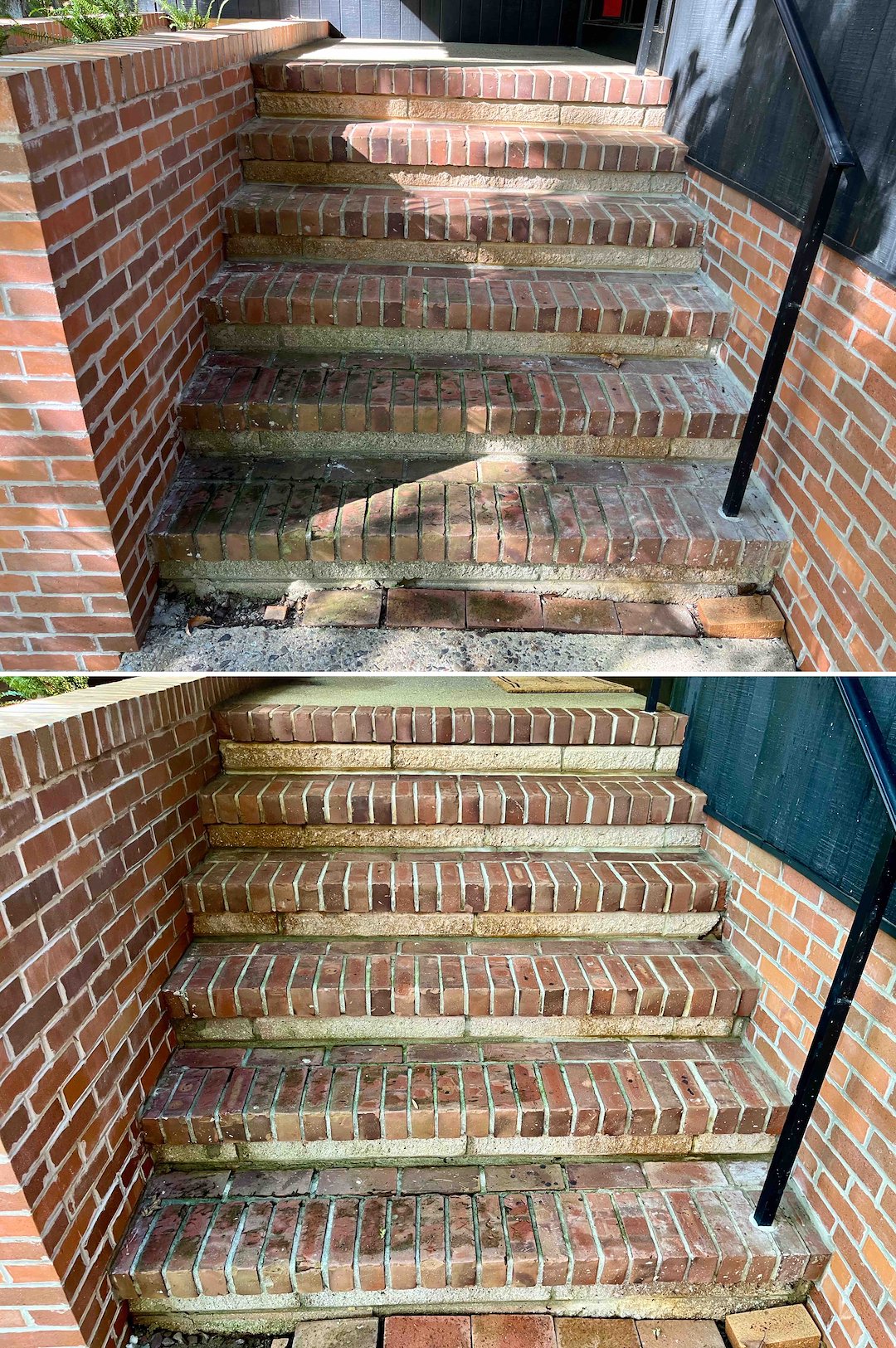 Concrete and brick areas required a different approach. The front steps, side patio, and brick pavers under the deck had thick organic material and old construction grime. We used a soft wash pre-treatment to loosen contaminants, then followed with professional high-pressure surface cleaning and turbo-tip work on the concrete and brick stairs to extract deep-seated grime from the masonry pores.