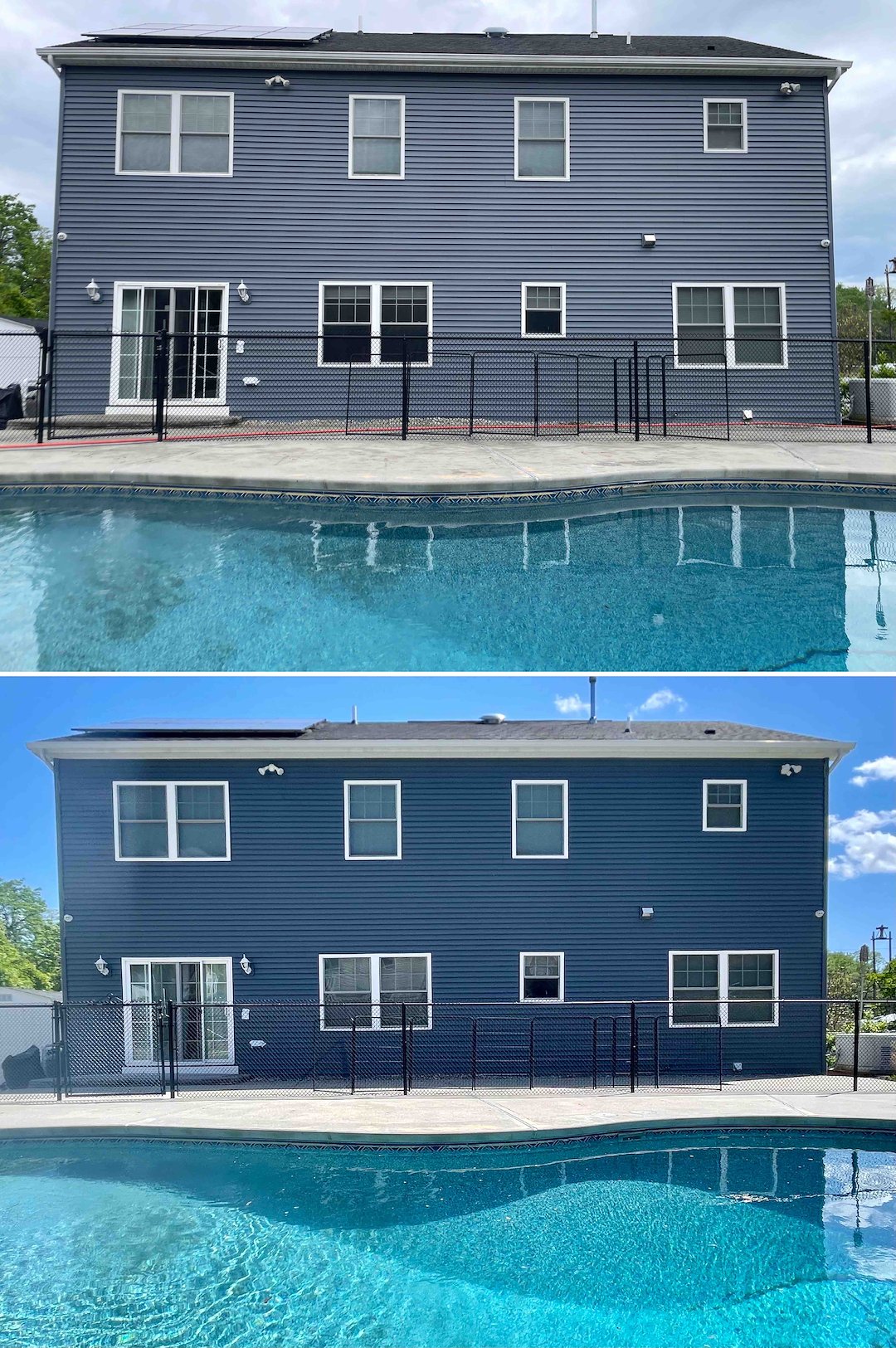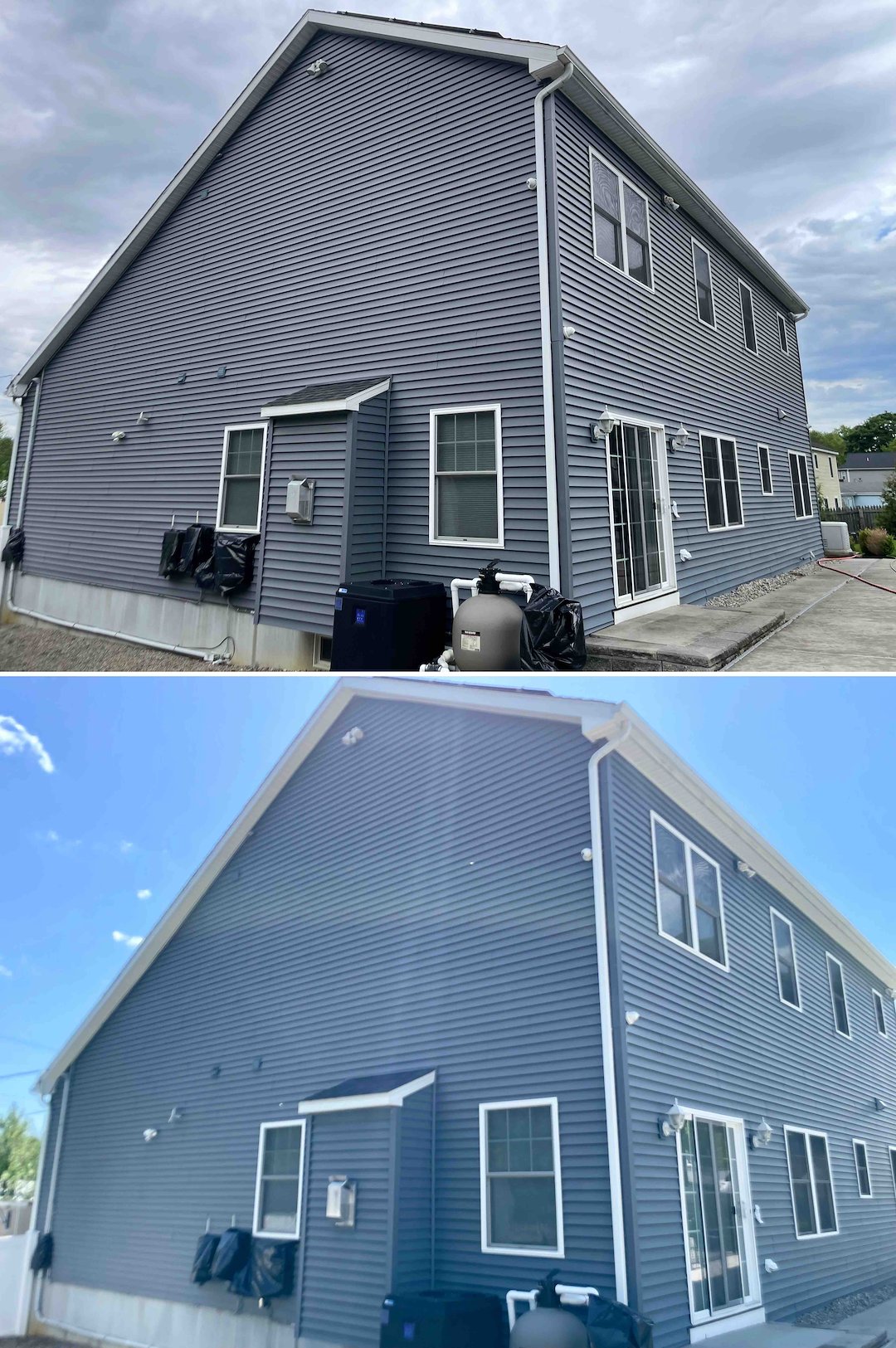 Before starting, we walked the homeowner through what oxidation is, and how it differs from mold and algae. If the siding leaves a white, powdery residue when you run your finger across it, that is oxidation. It is a chemical breakdown of the vinyl from UV exposure. We explained that a standard soft wash will sterilize and remove mold and algae, but it will not remove the chalky oxidation layer.