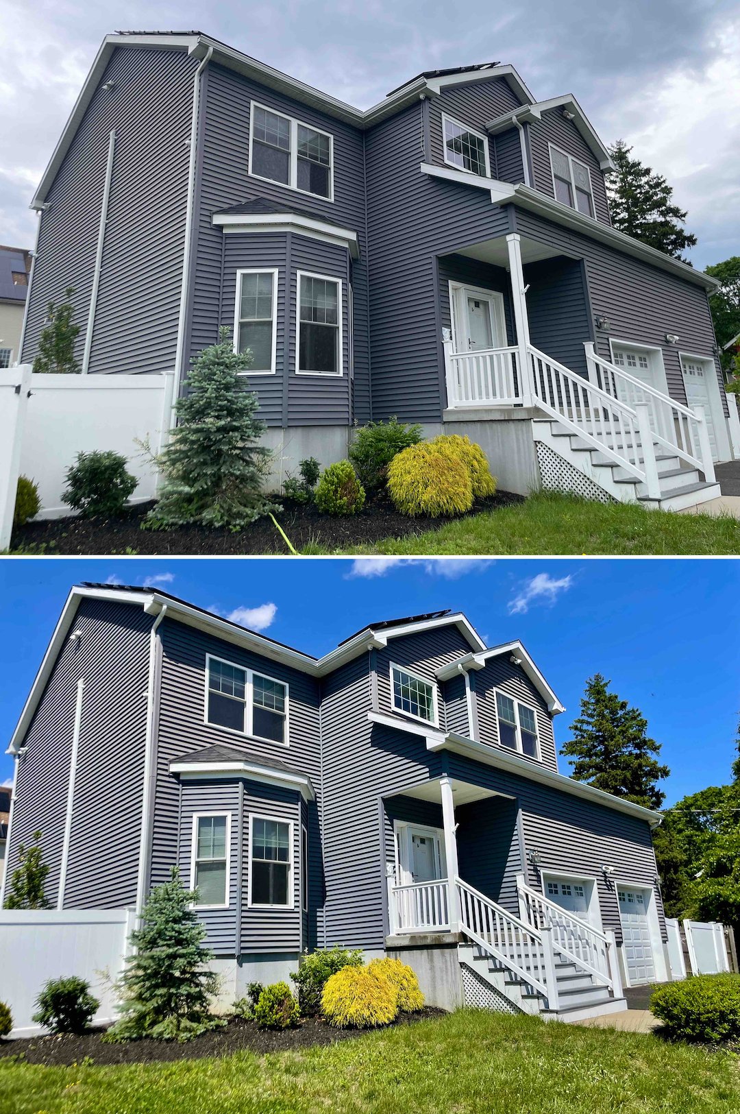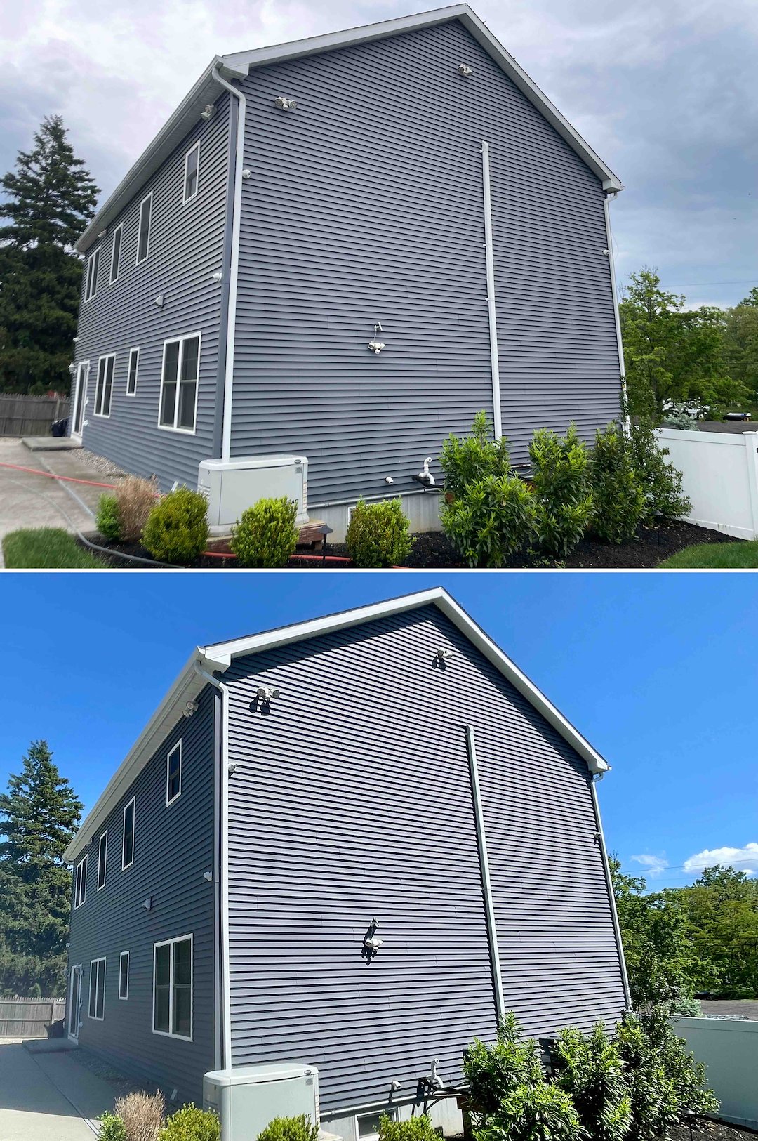 Above & Beyond Softwash recently completed a Professional Soft Wash House Cleaning in Leonardo, New Jersey, in Monmouth County. This two-story home showed the common coastal issues we see here, namely green algae buildup on vinyl siding and a chalky, faded look caused by oxidation. The scope of work focused on a safe, low-pressure sanitation to remove organic growth, plus window and concrete cleaning to restore appearance and safety.