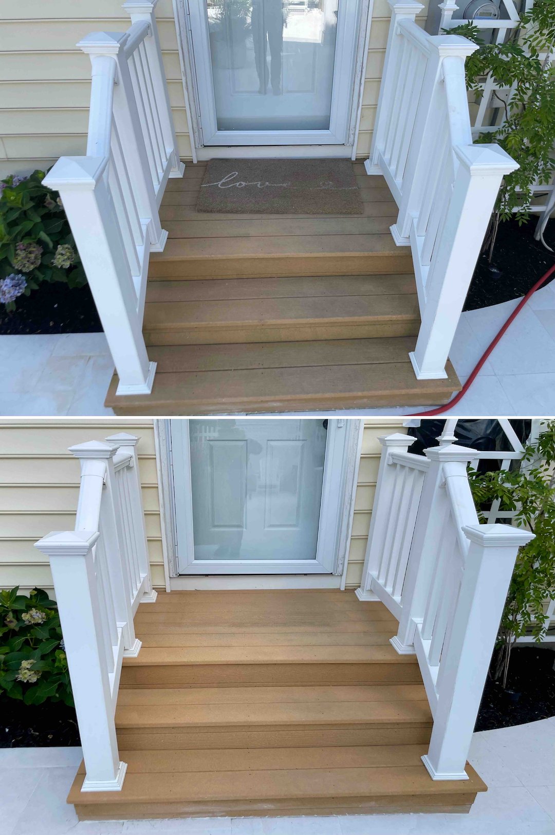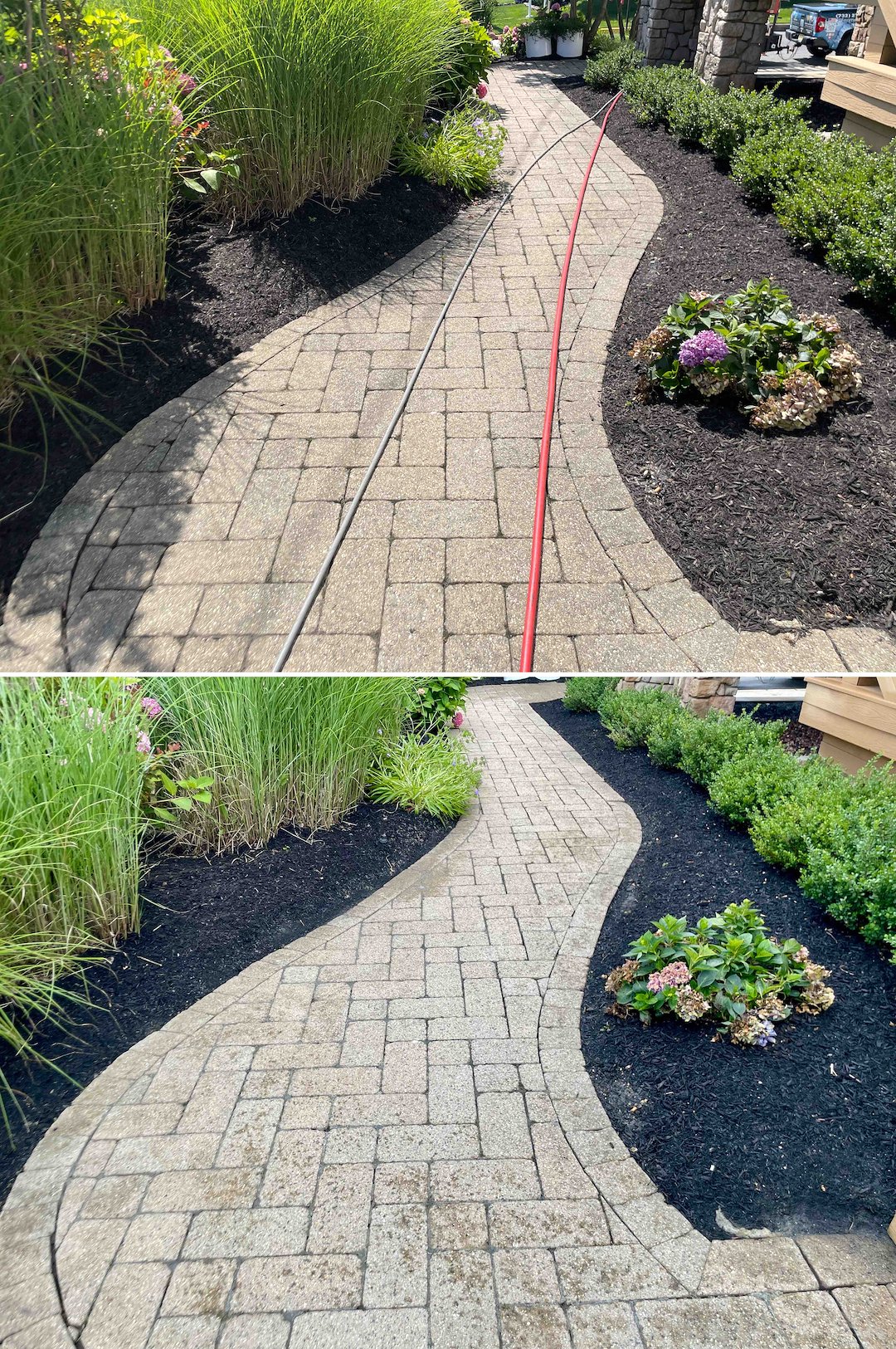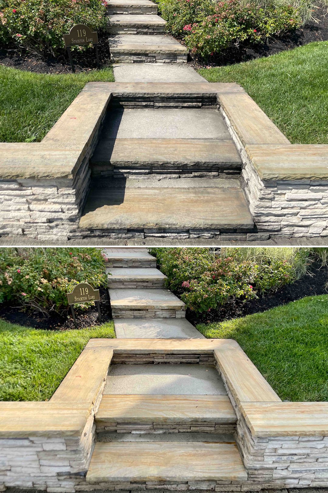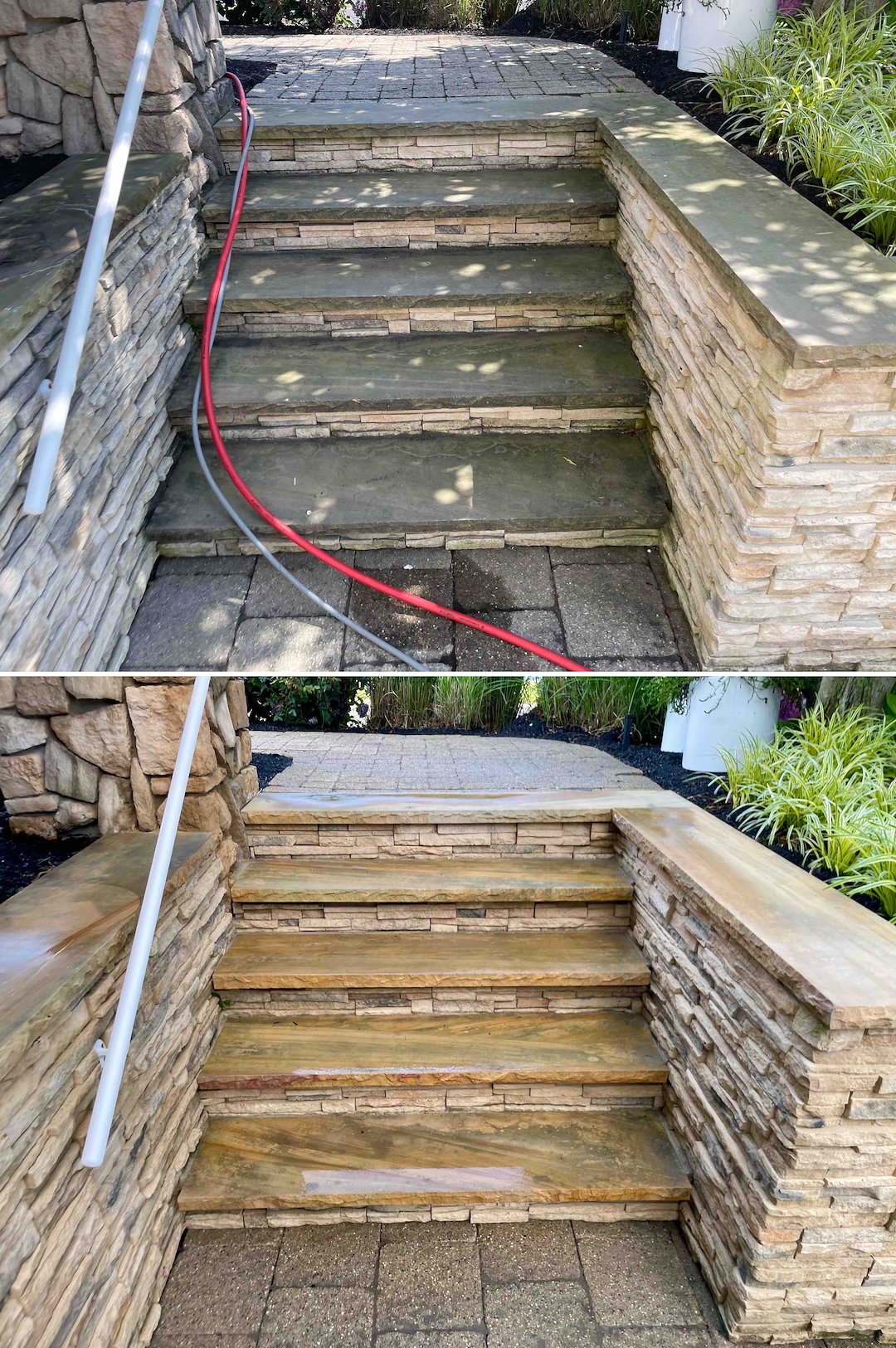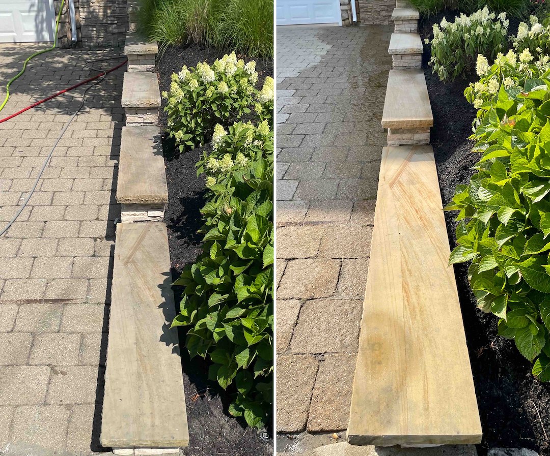 The front paver walkways and the stone and concrete stairs were covered in black mold. Older pavers are more porous and can be damaged by high pressure, so we treated the cap stones and driveway pavers with a Soft Wash that lifts organics out of the stone’s pores. That cleaning did more than clear the surface, it restored the original color of the stone, making a 15-year-old walkway look like it was laid last week.