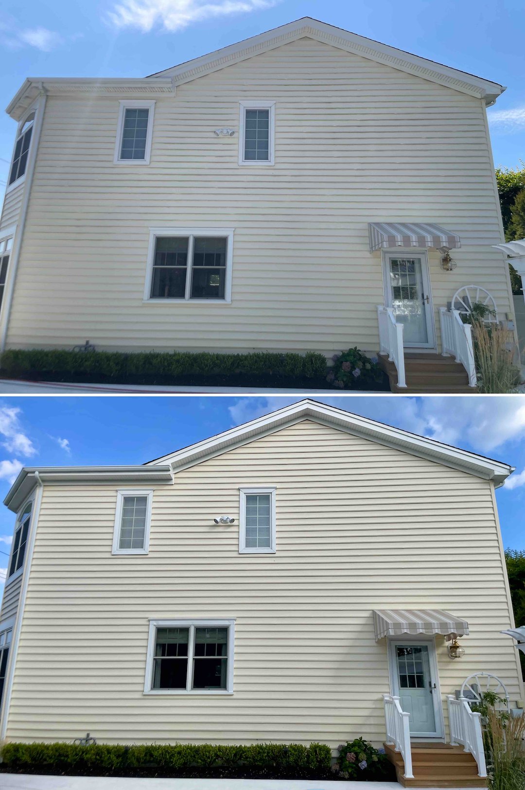 On this 15-year-old home we saw exactly that process at work. The salt and algae had dulled the navy awnings and affected the various siding surfaces. We performed a Soft Wash that neutralized the salt and killed mold at the root, so the finish could begin to recover. For a home of this age, a yearly reset is the best way to keep it looking "brand new" instead of letting it slowly take on a weathered "beach house" look that can lead to expensive repairs.