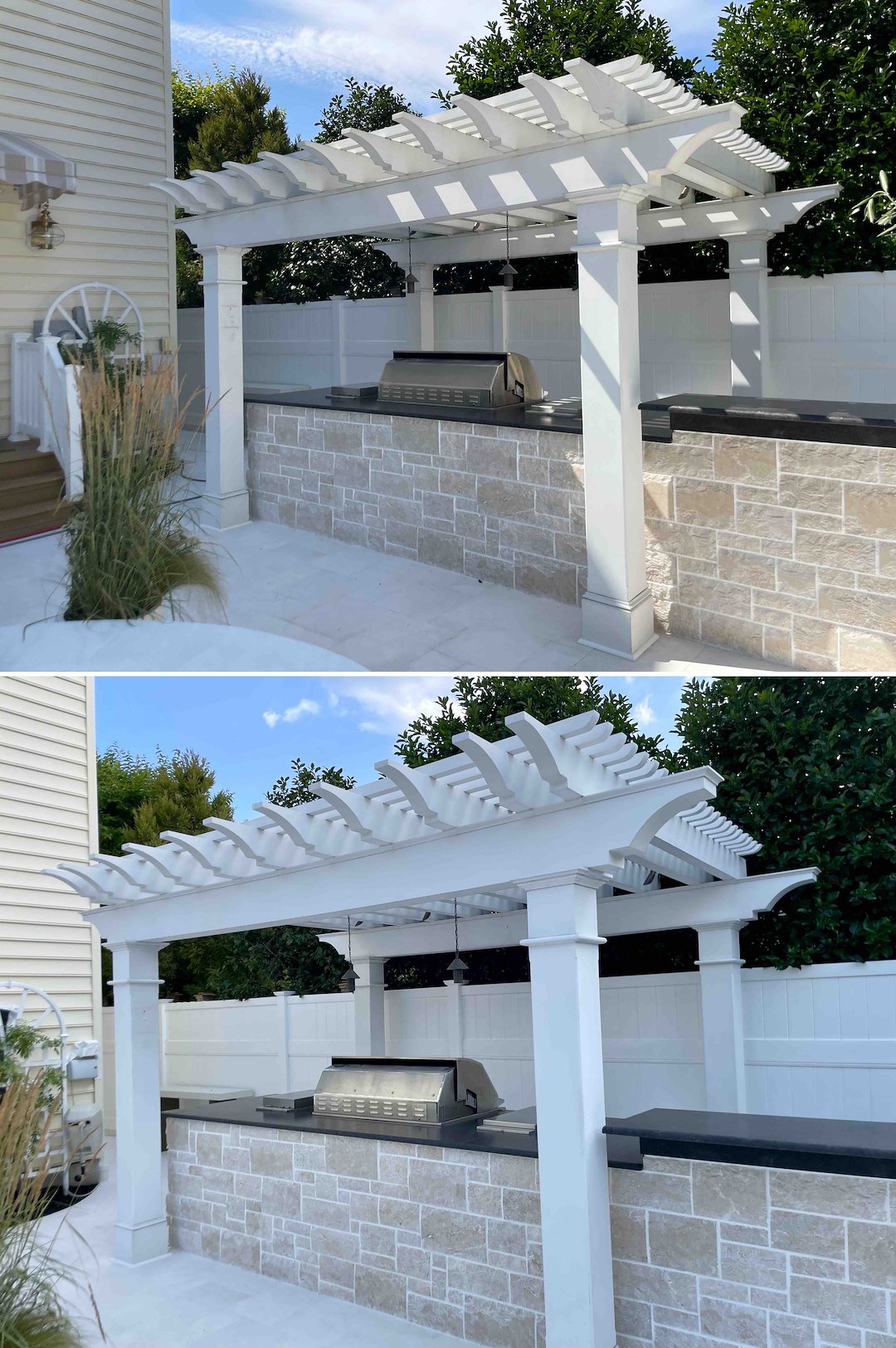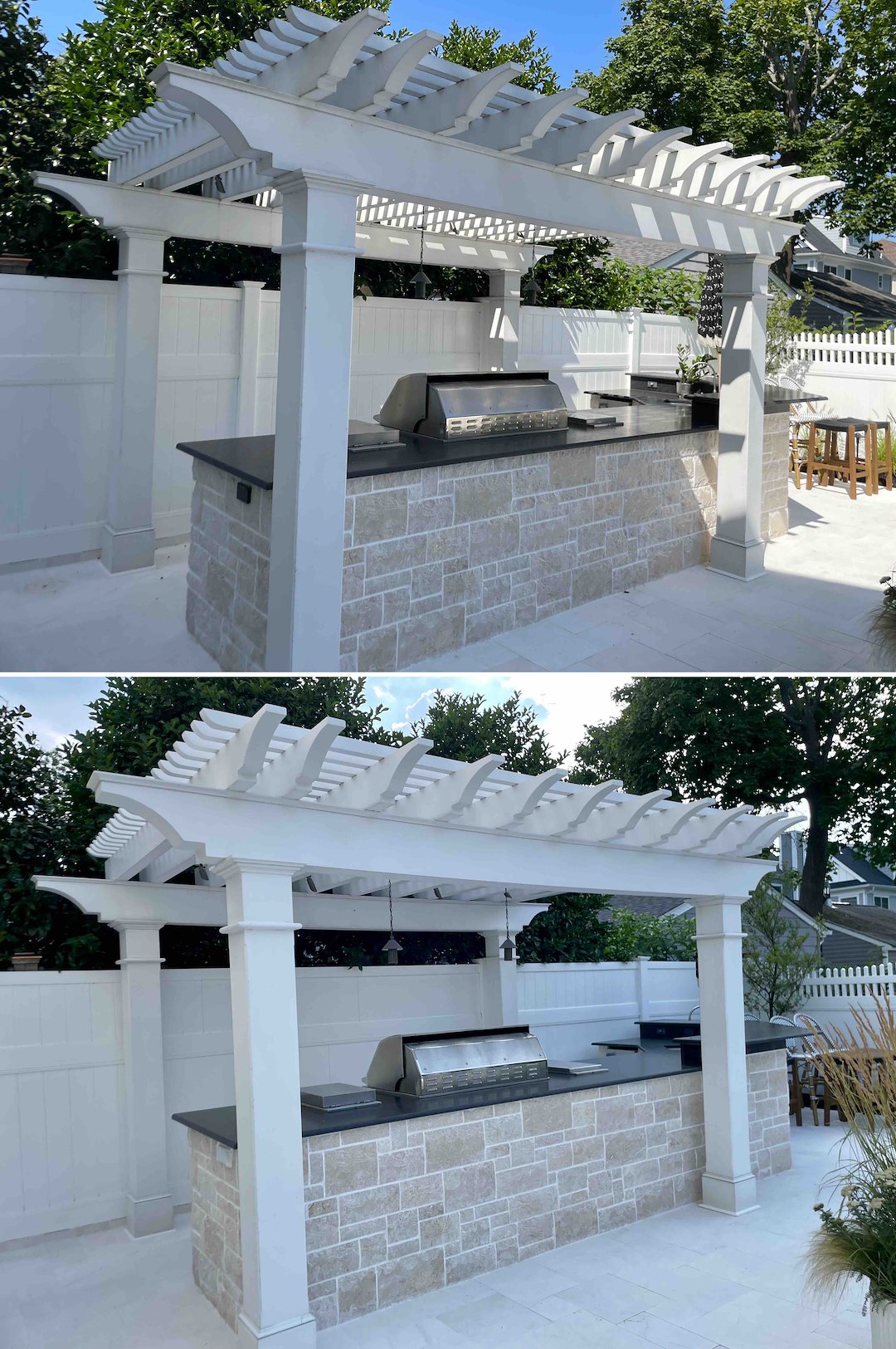 High-end outdoor spaces need careful attention. This property had a pergola over an outdoor kitchen, with lighting and exterior outlets nearby. Before any cleaning solution was applied, we tarped off the grill and kitchen area, secured the light strings, and protected the pergola’s electrical components. Protecting sensitive features comes first on every job.