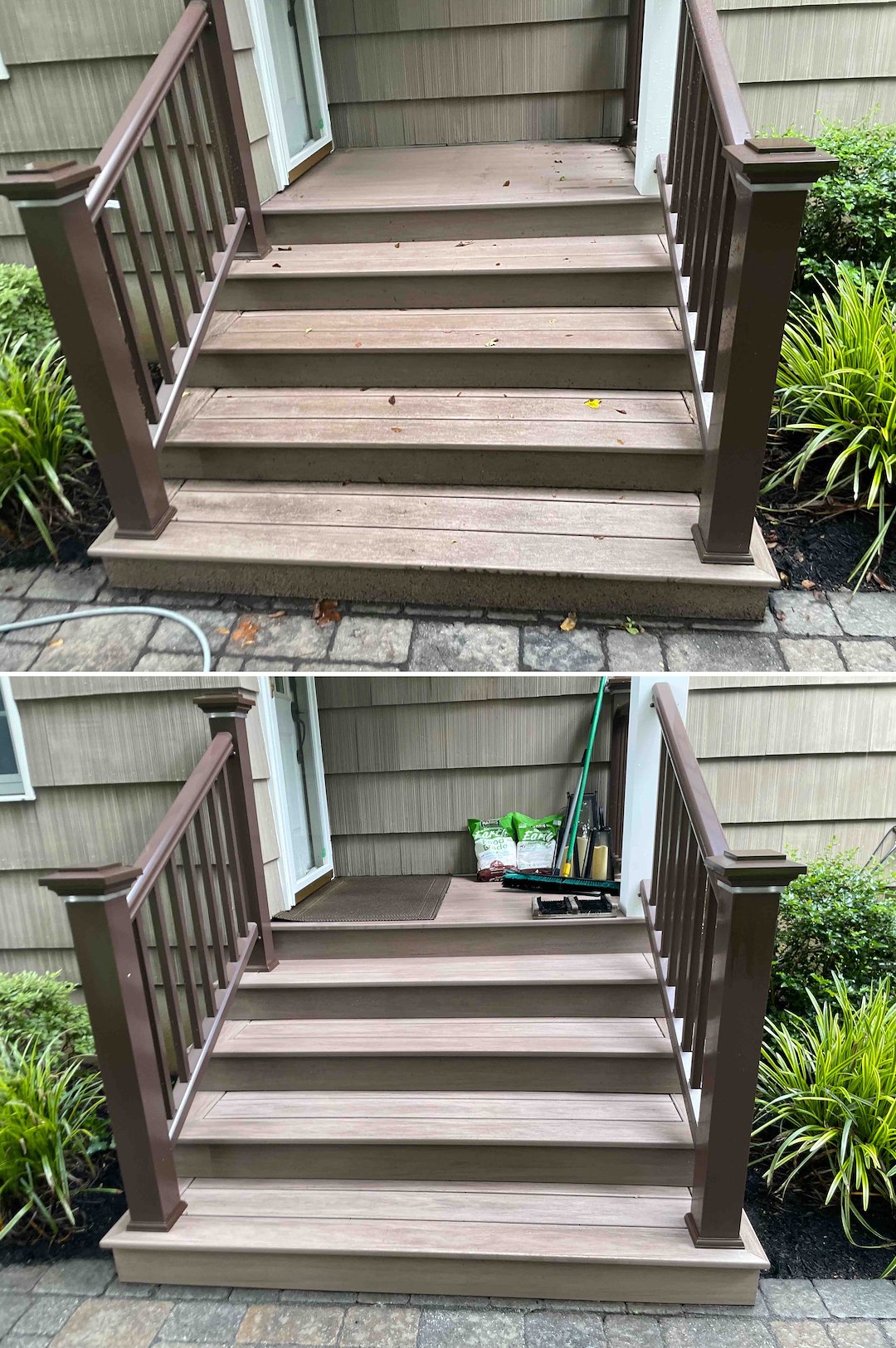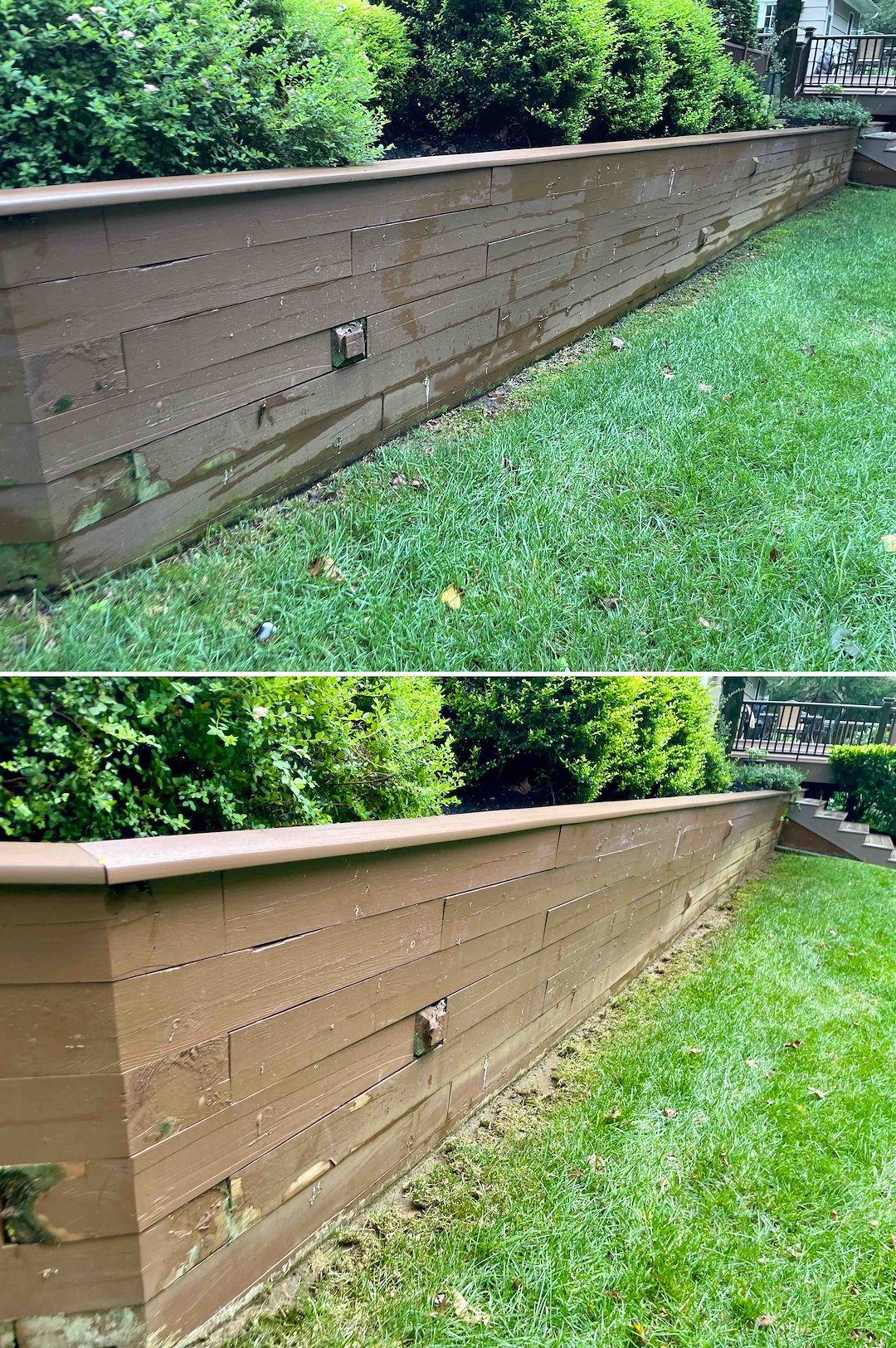 Cleaning the pool deck alone is not enough if surrounding surfaces stay dirty, so I completed a full backyard reset. The composite deck, including rails and spindles, was soft washed to remove green algae while protecting the synthetic grain and avoiding wand marks. For the bluestone walkway and adjacent retaining wall, I used a targeted treatment to lift moss and algae from the porous stone, restoring the natural look of the hardscape without damage.