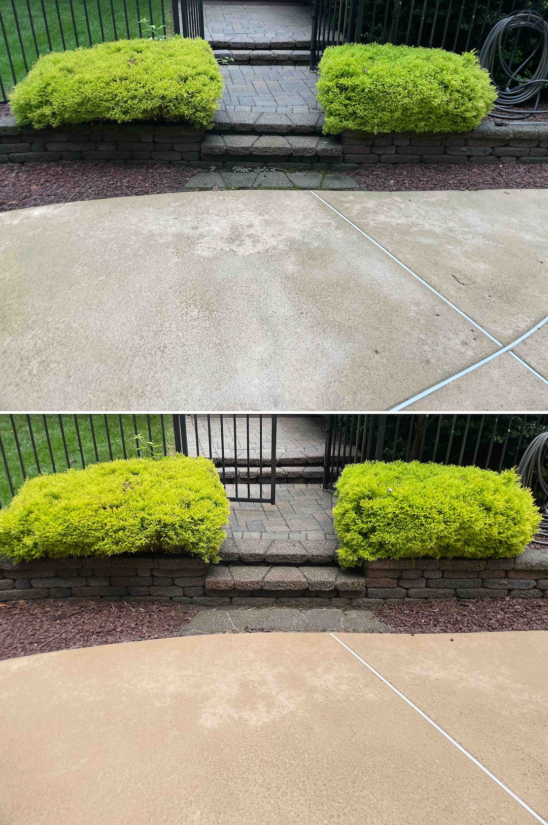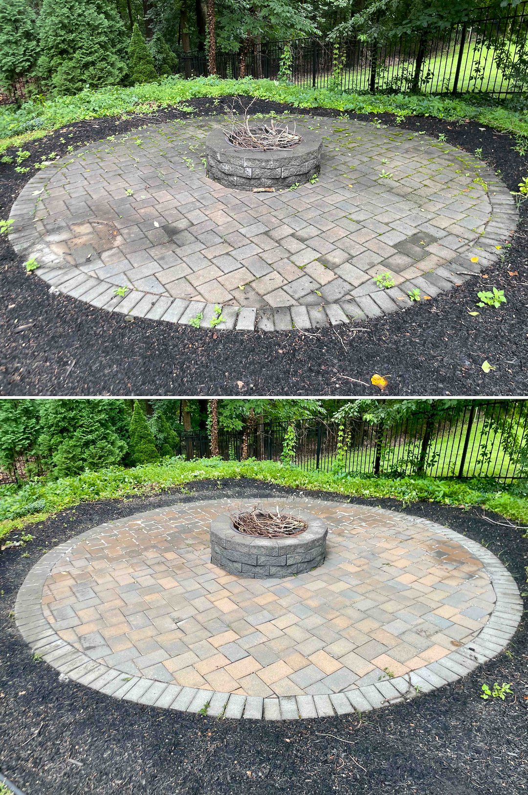 The paver fire pit received special attention after the homeowner mentioned they had forgotten about it. Paver joints rely on polymeric sand for stability, so high pressure can easily wash that out. I treated the fire pit to kill the moss and algae, then performed a gentle rinse so the pavers would look refreshed while the joint material remained intact.