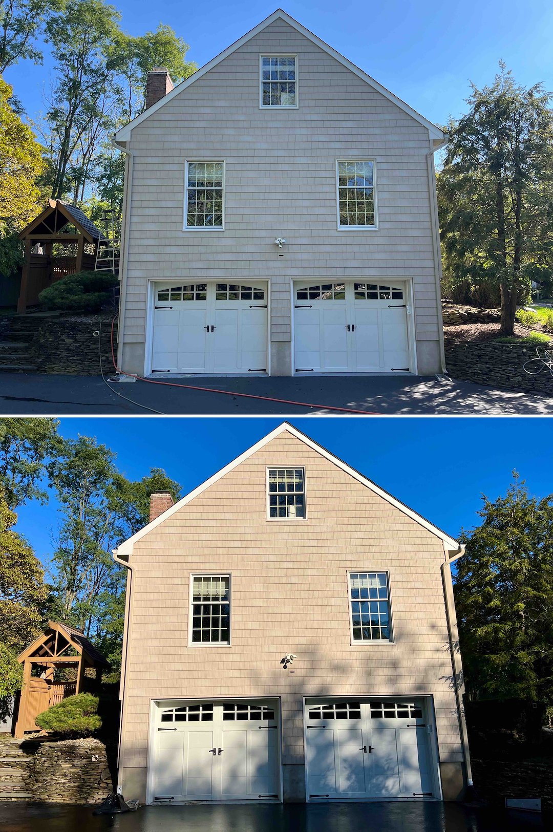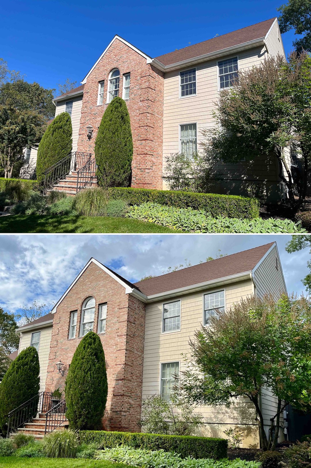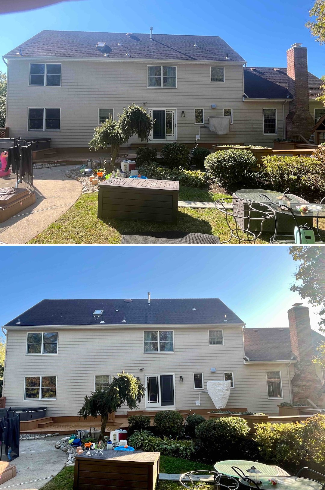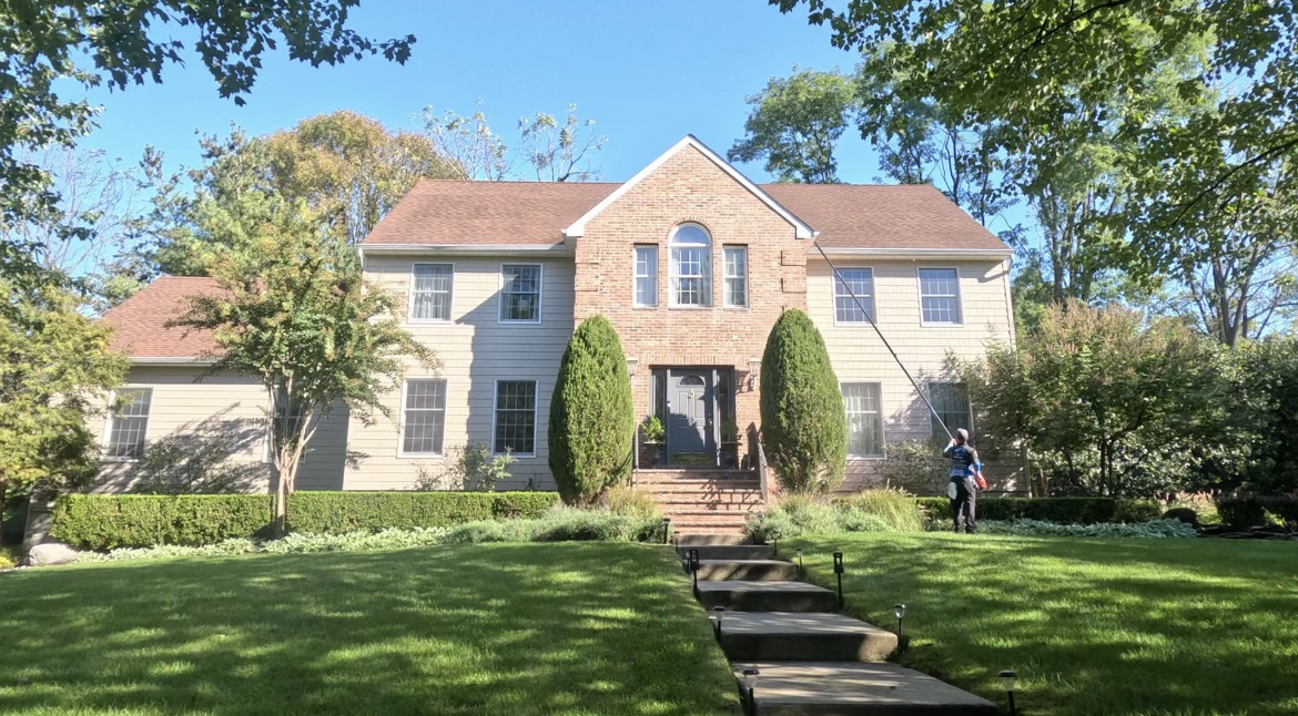 Because the roof work was already underway, the homeowners opted for a bundled house wash. We soft washed the siding, windows, trim, shed, and even cleaned around the jacuzzi. The north side of the house had been a solid wall of algae, which is common in Jersey, but our system removed it without damaging siding or forcing water behind walls.