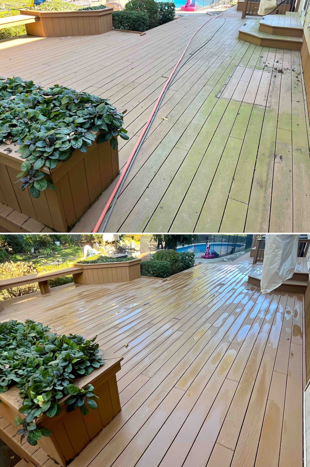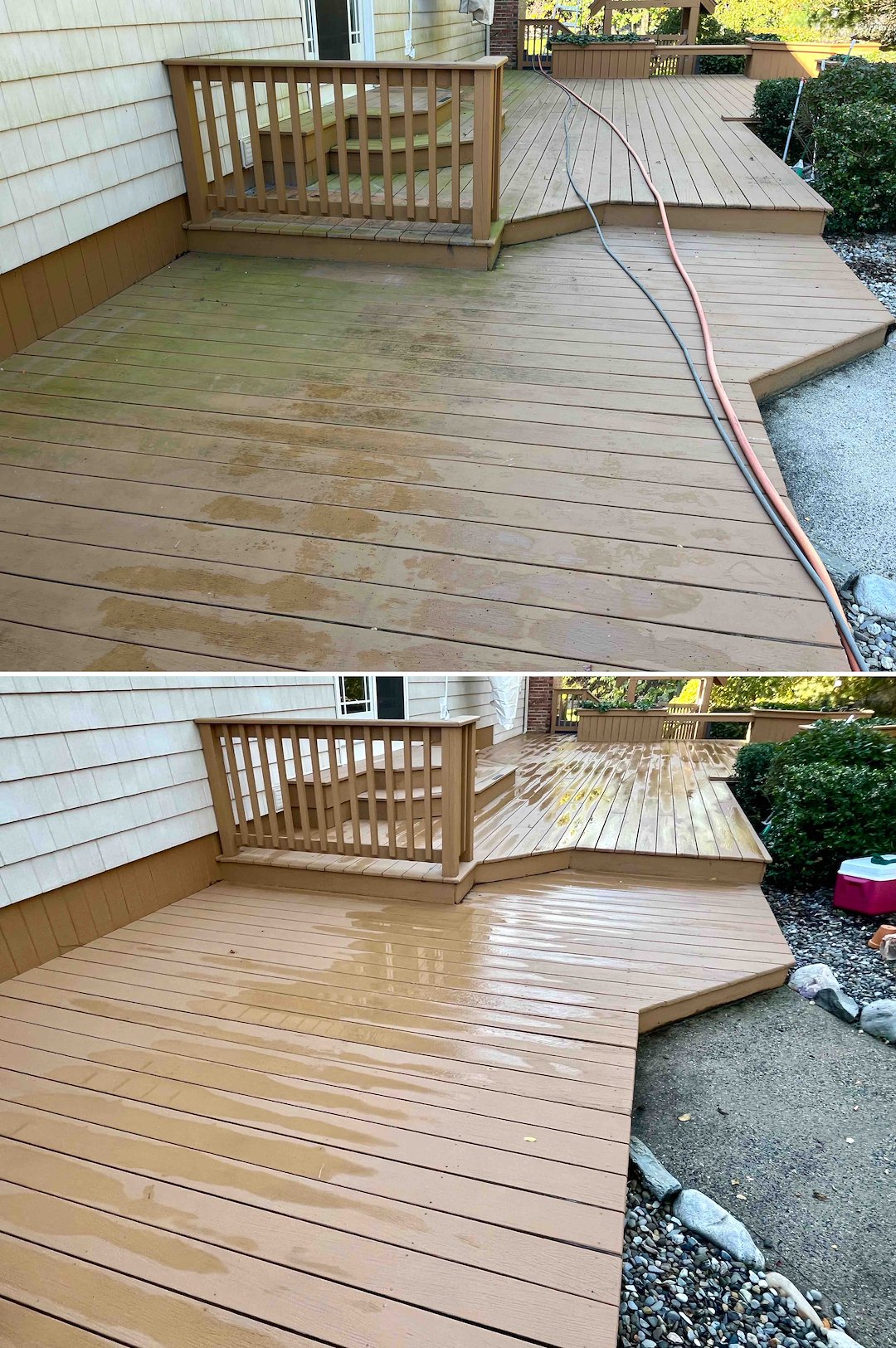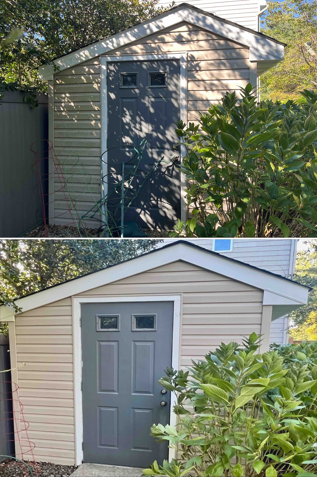 Because the roof work was already underway, the homeowners opted for a bundled house wash. We soft washed the siding, windows, trim, shed, and even cleaned around the jacuzzi. The north side of the house had been a solid wall of algae, which is common in Jersey, but our system removed it without damaging siding or forcing water behind walls.