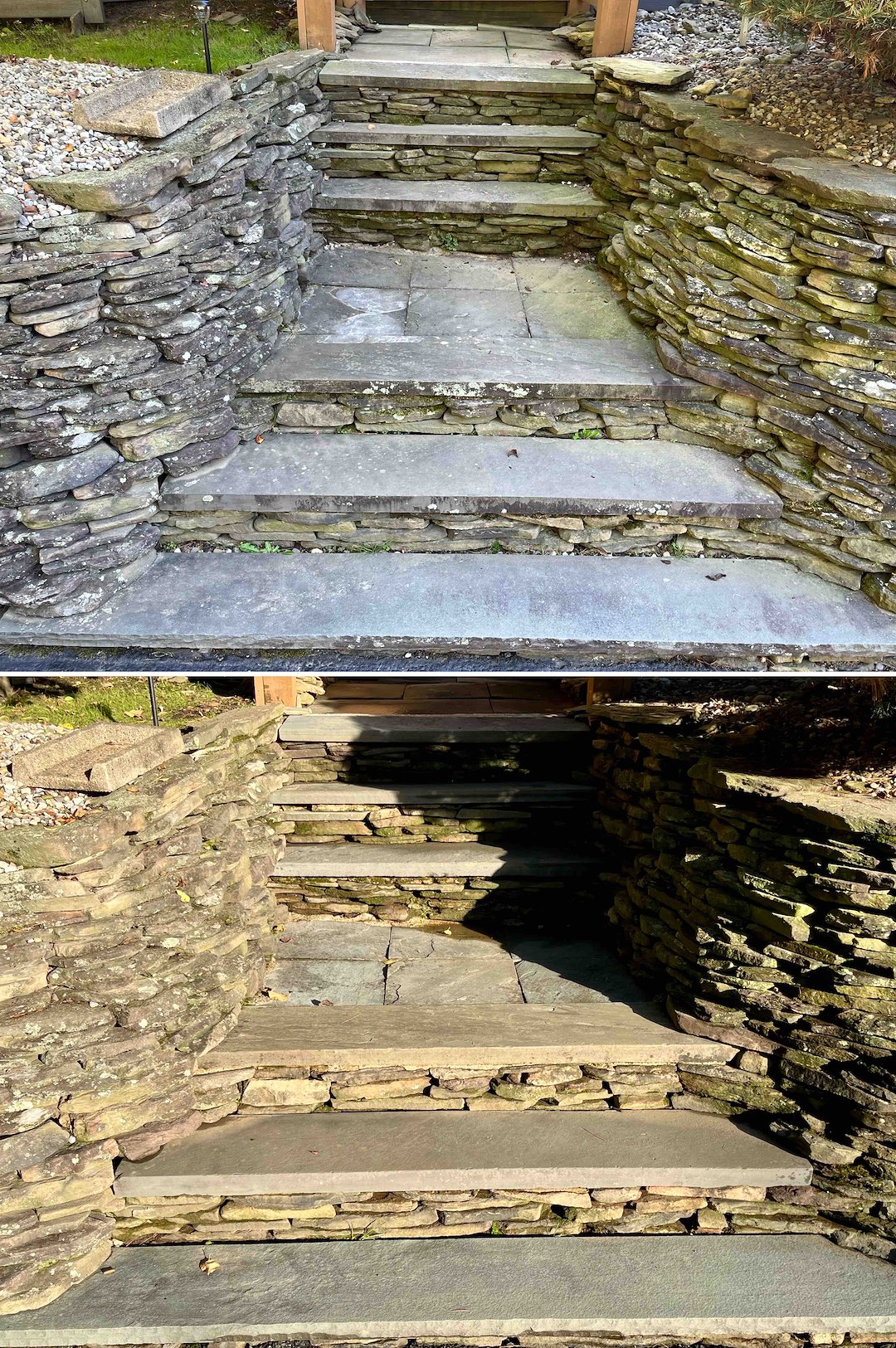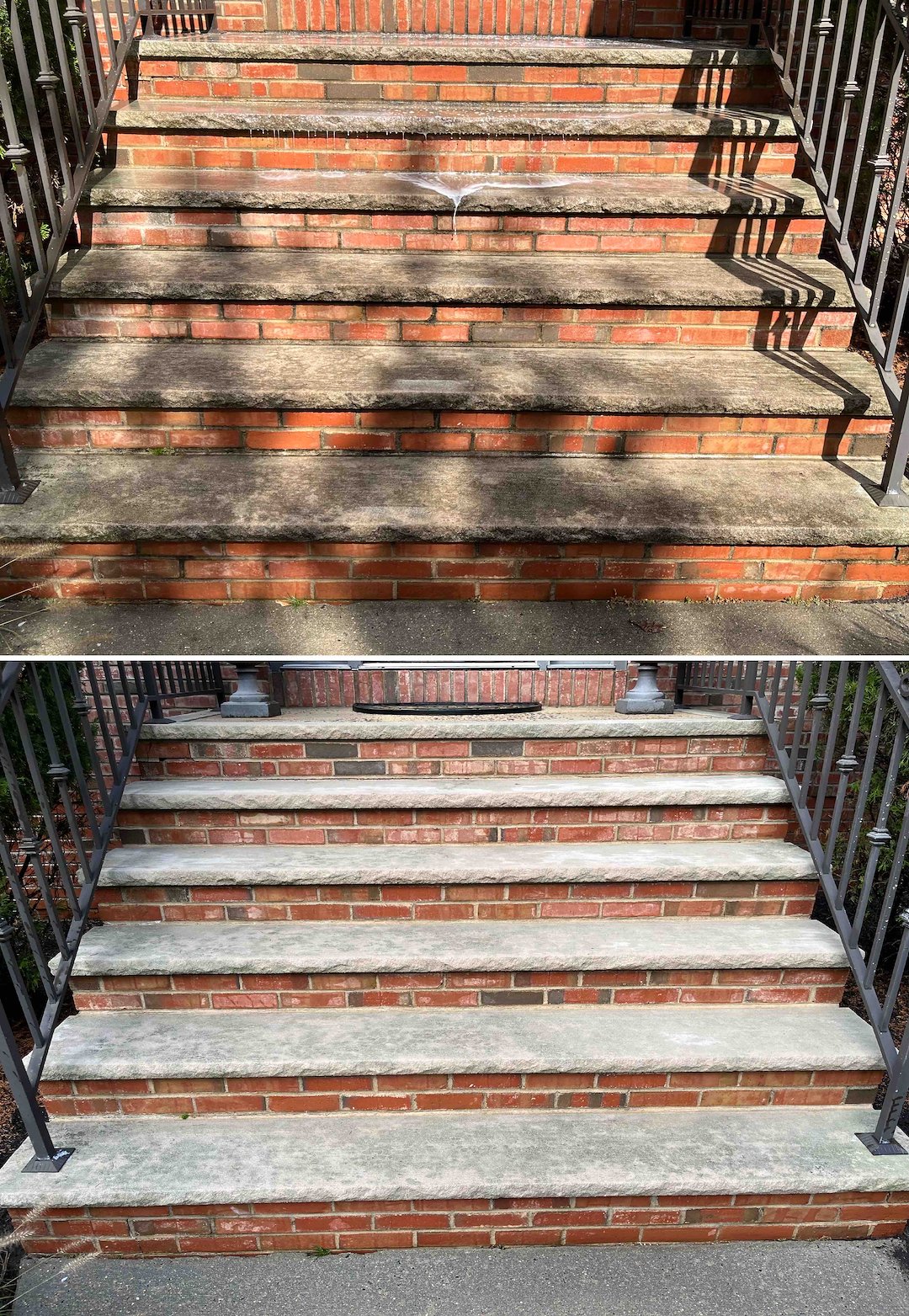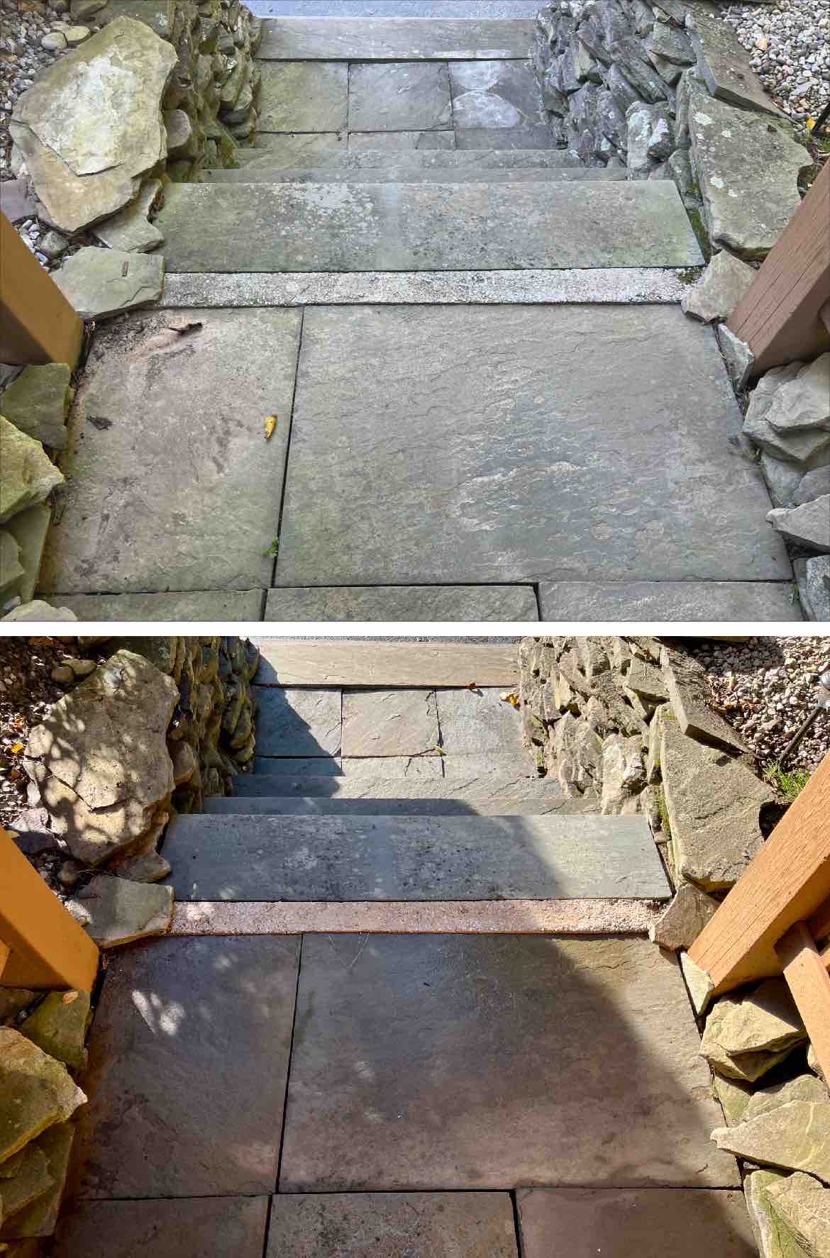 The back entrance had heavy algae build-up on the bluestone stairs, making them dangerously slick. We treated the bluestone and the small cedar roof beside it, removing the algae and eliminating the slip hazard. The natural look of the stone came back, and the entryway was safer when we were done.