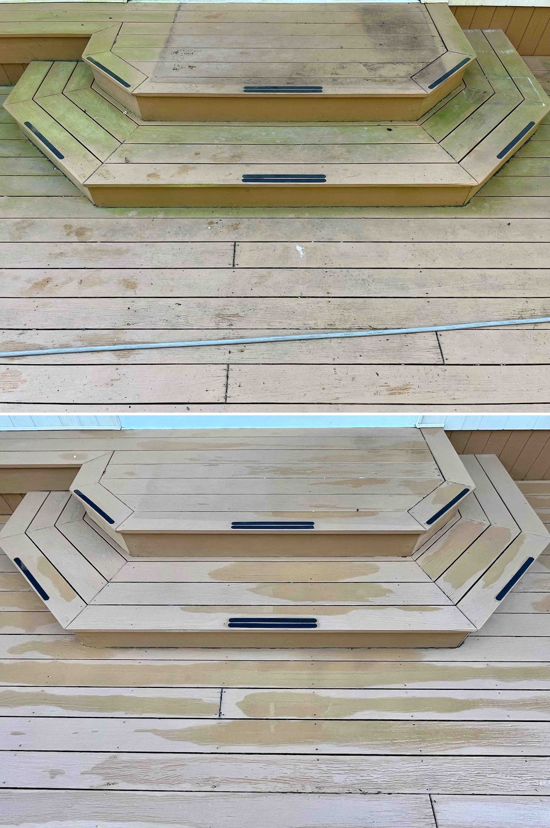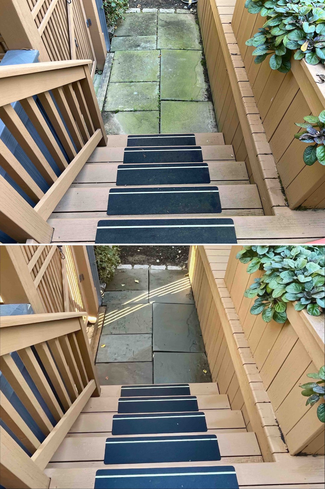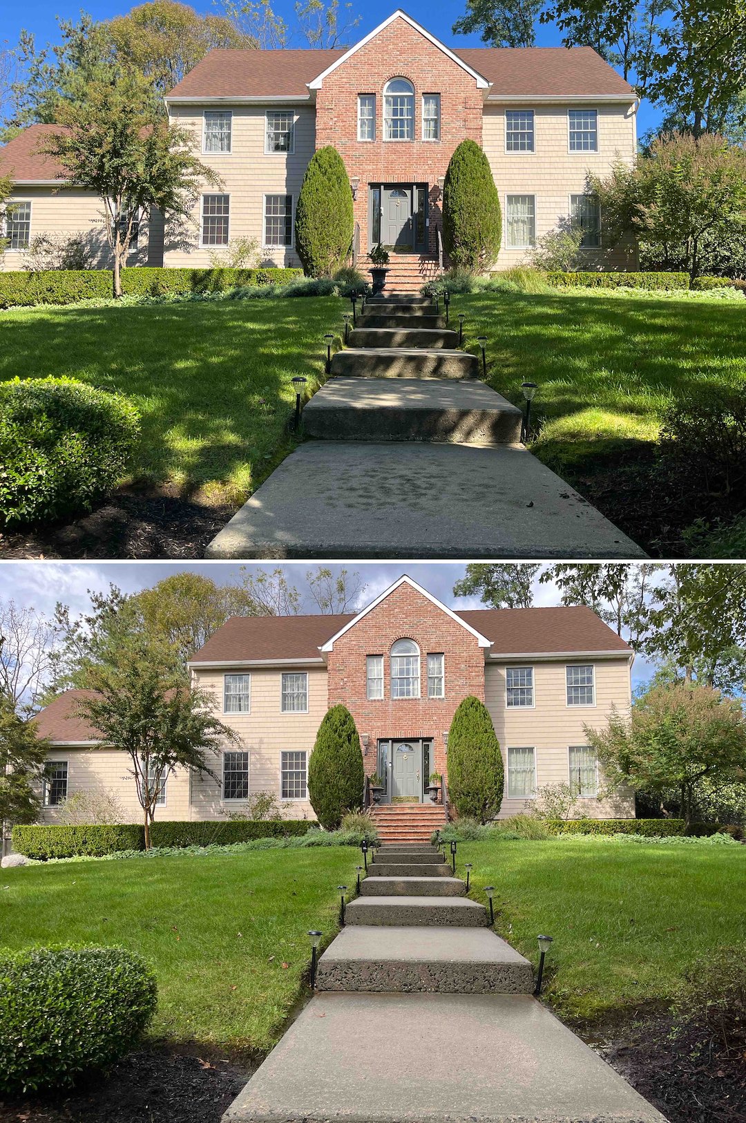 The back entrance had heavy algae build-up on the bluestone stairs, making them dangerously slick. We treated the bluestone and the small cedar roof beside it, removing the algae and eliminating the slip hazard. The natural look of the stone came back, and the entryway was safer when we were done.