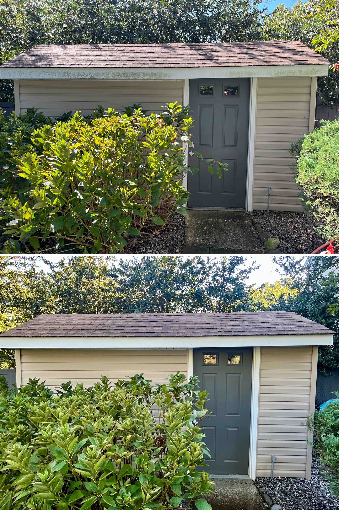 For the roof we used a low-pressure soft wash, never a pressure washer. As I told the homeowners, a pressure washer on shingles is a fast track to needing a new roof. Our soft wash kills moss and lichen at the root, and you can actually see the growth turn white when it is dead, then wash away safely with the next rain. This restores the roof color while protecting the manufacturer warranty.