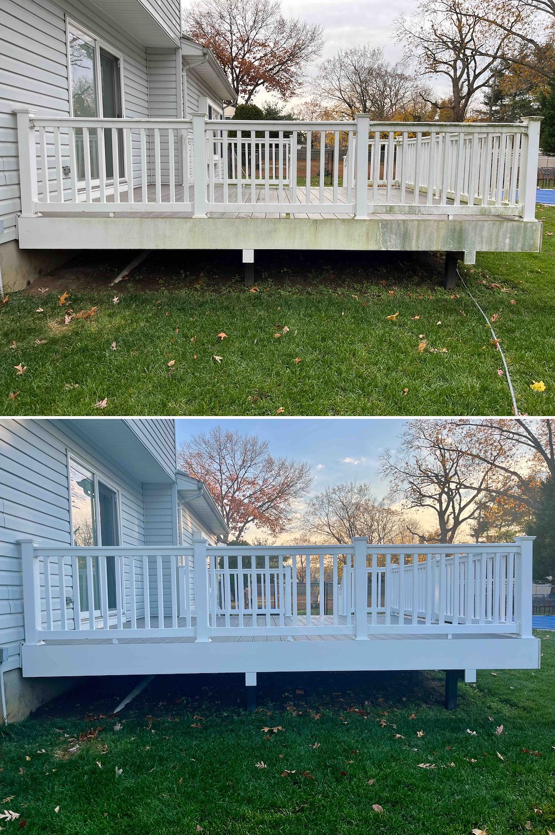 Composite decking can look great until the sun and Jersey air work against it. For this project we used a dedicated soft wash to get deep into the grain of the decking and into the vinyl railing surfaces. Soft washing kills mold spores underneath the surface so the deck stays clean longer. We did not use high pressure, because that will fuzz or scar composite boards and can void the manufacturer warranty.