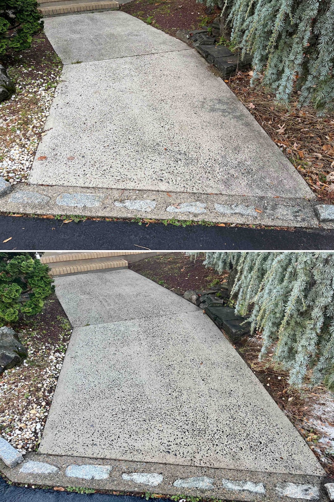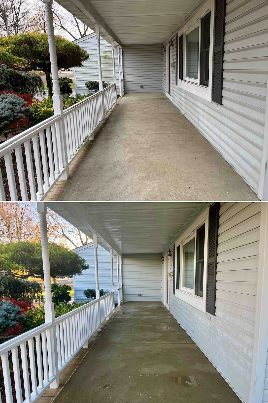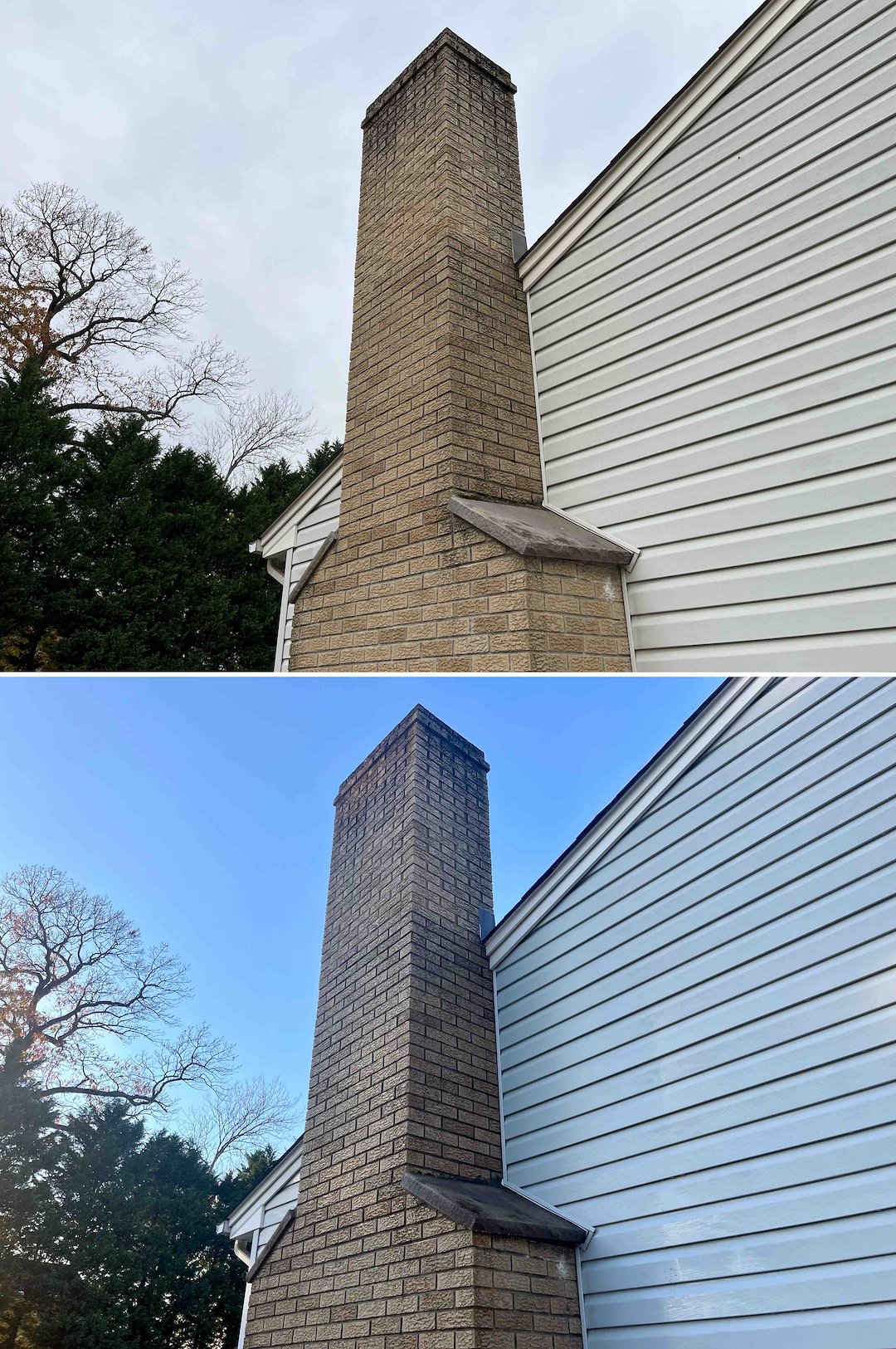 On the front concrete walk and the chimney we applied a specialized solution to strip organic growth from the masonry. The concrete and chimney showed a night-and-day difference after treatment. I always tell clients that soft washing is the king of killing mold, but it is not going to pull 20 years of soot off a chimney. I give realistic results, not a sales pitch, so the homeowner knows what to expect.