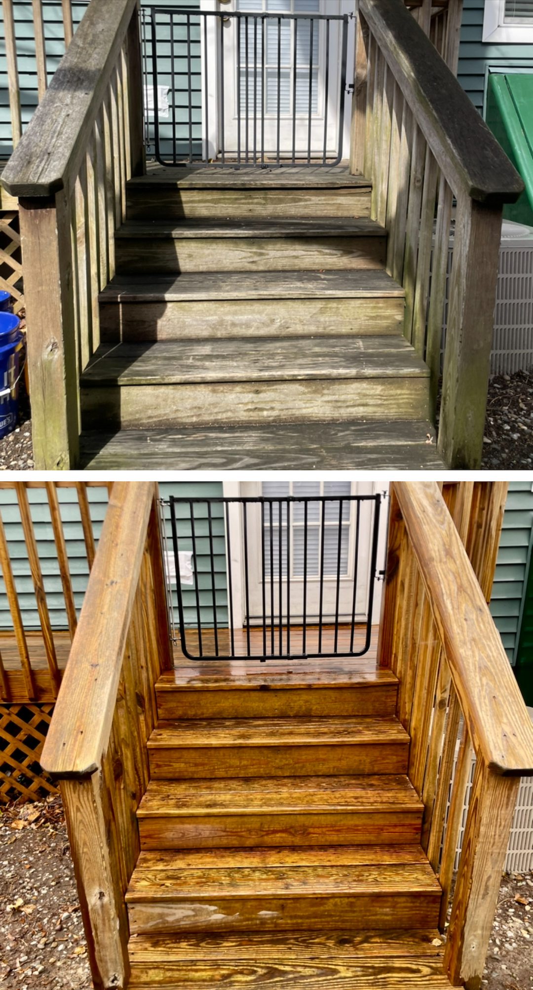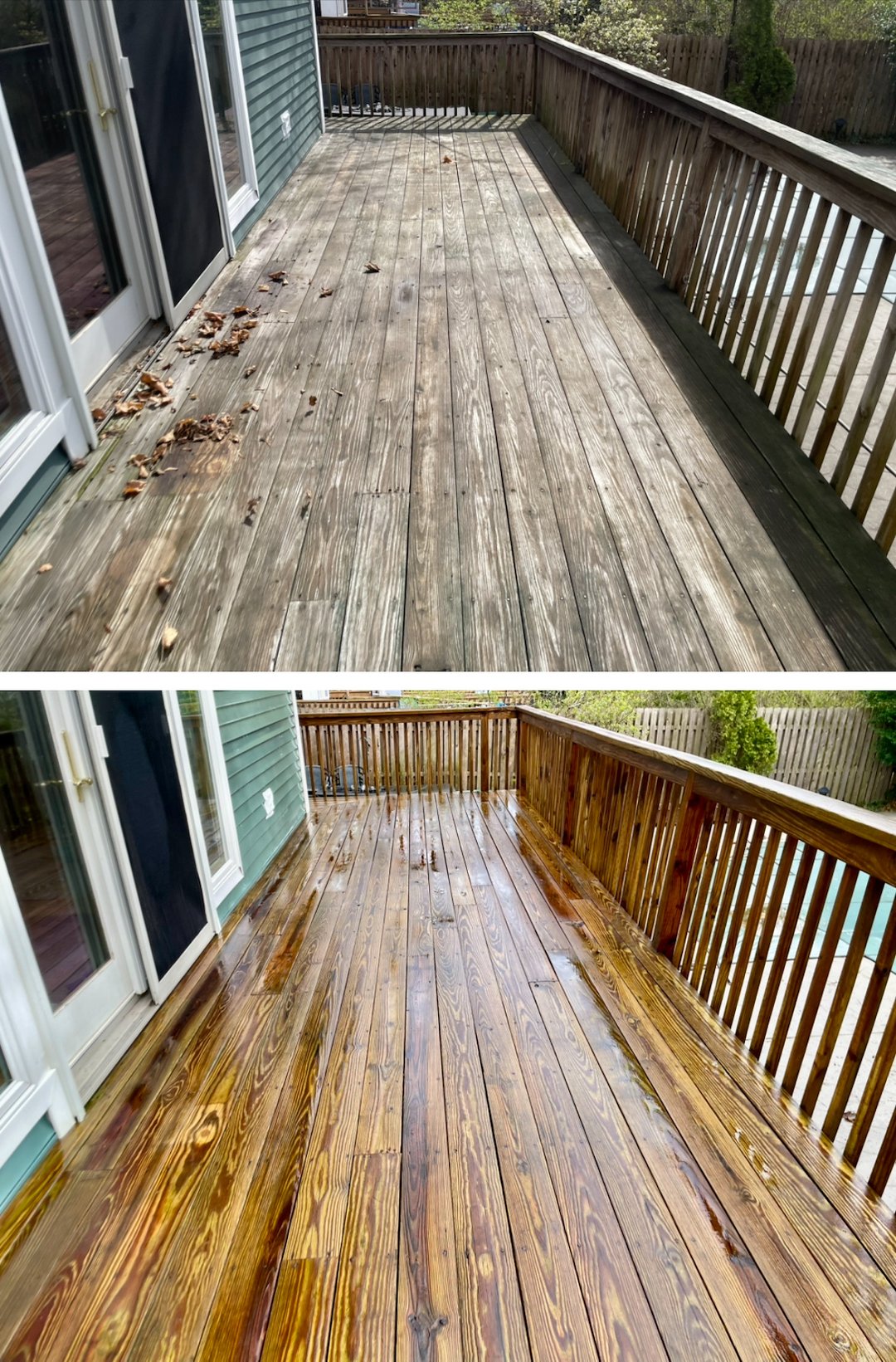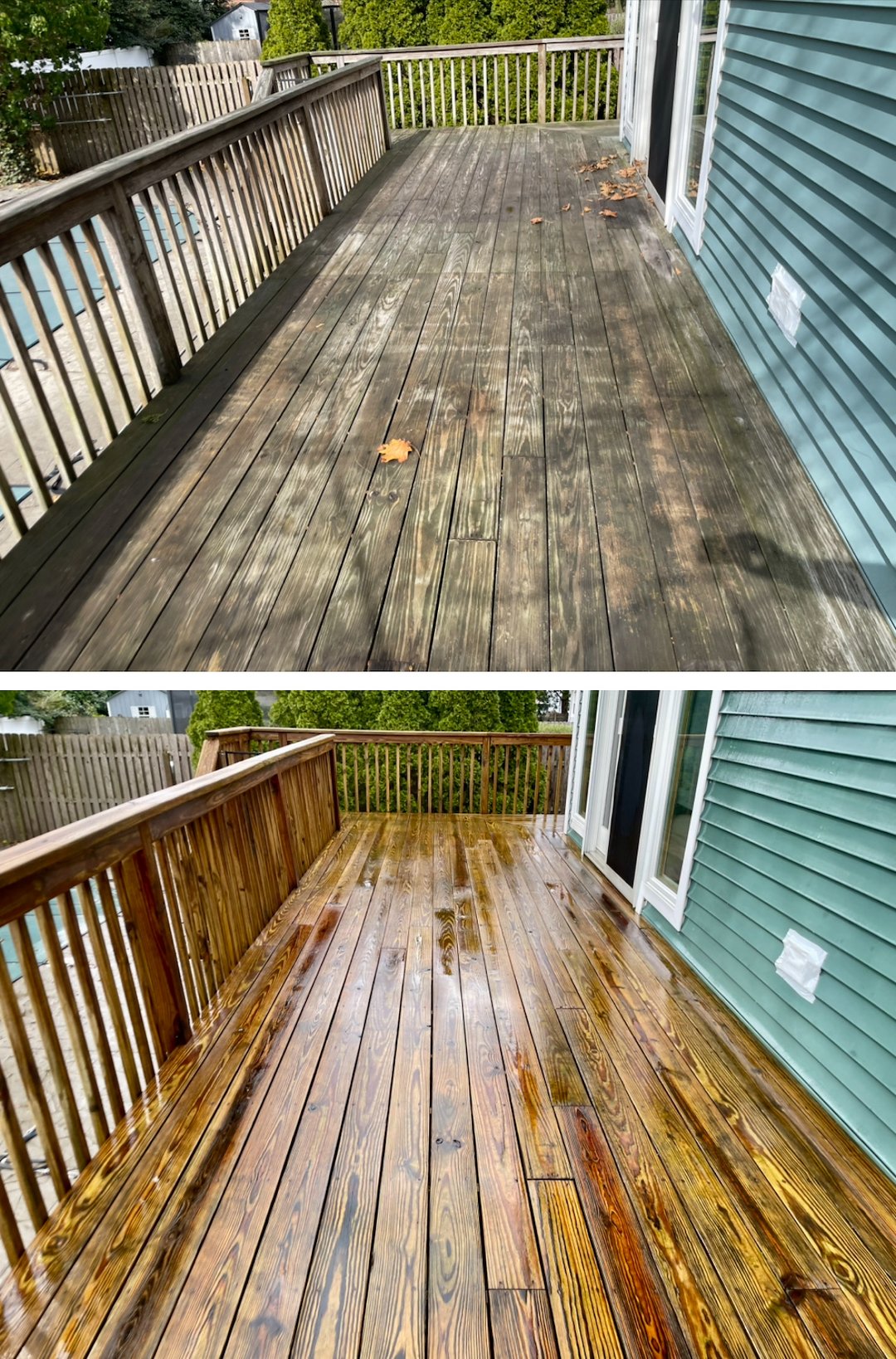 This work covered a range of surfaces, from standard backyard decks and privacy fences to delicate exotic hardwoods like Ipe. Exotic hardwoods need a gentler, informed approach, and our process accounts for the unique needs of those species so their grain and color return as intended.