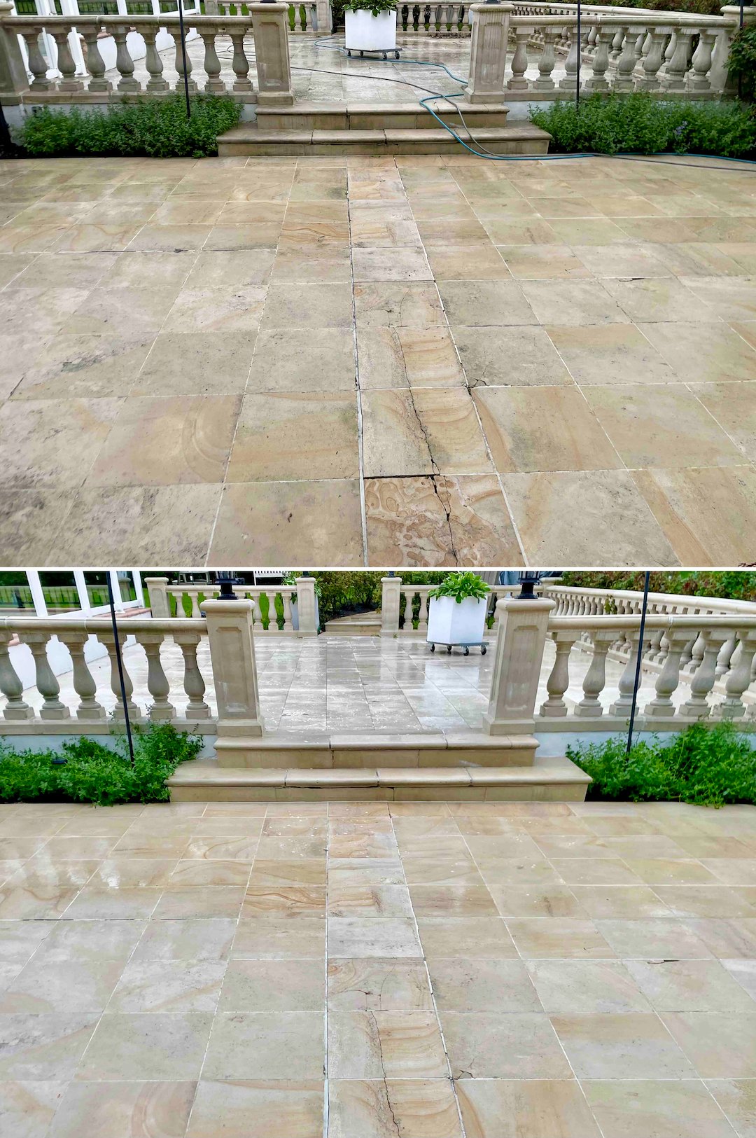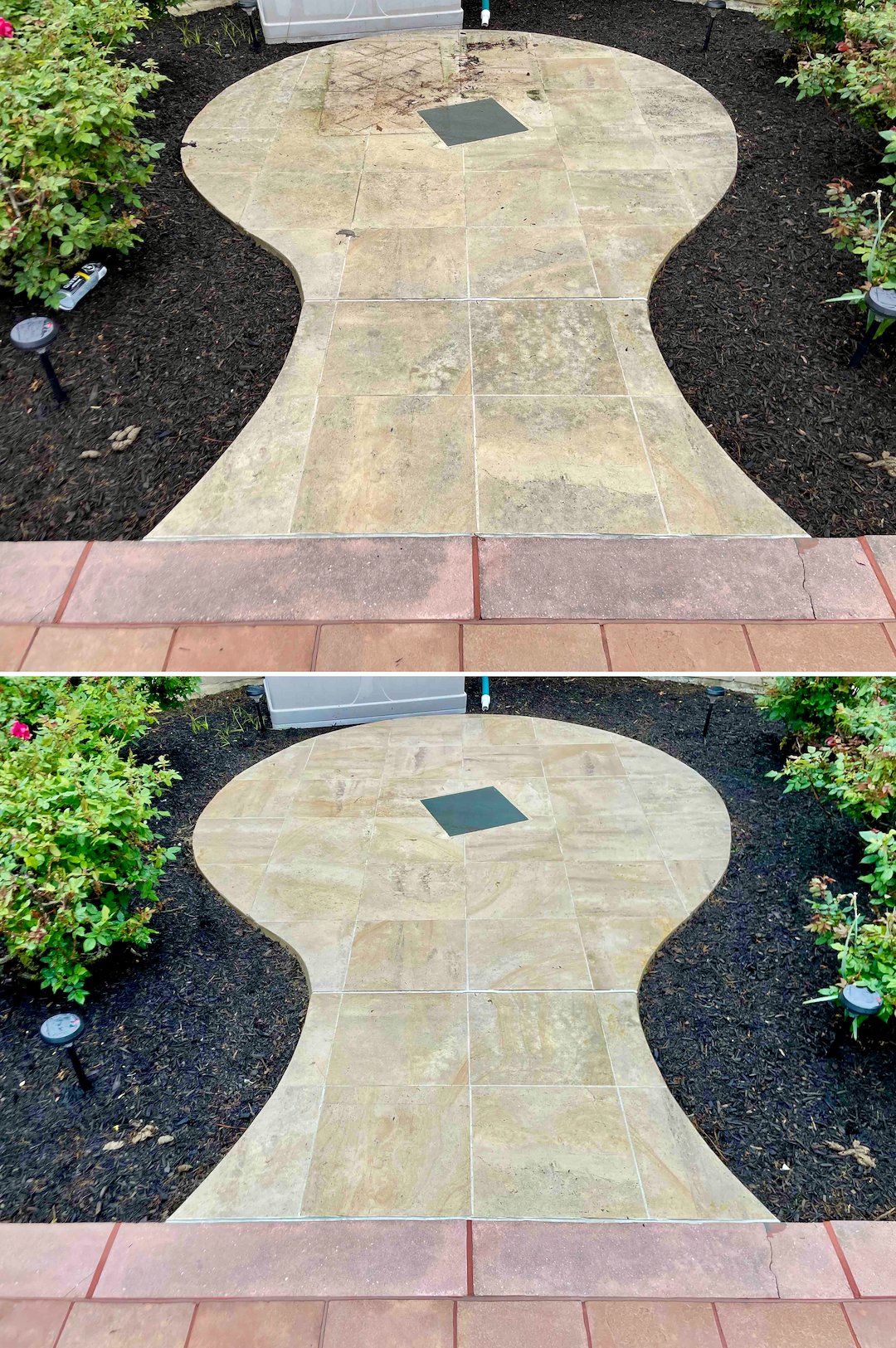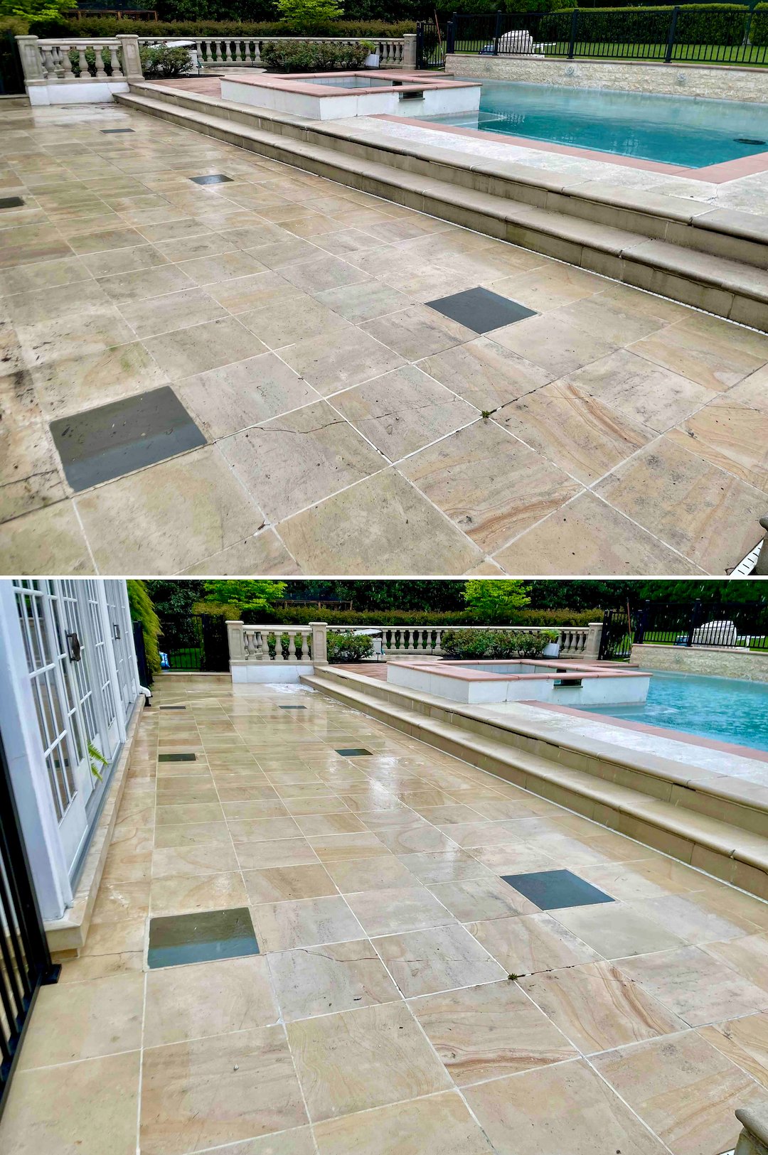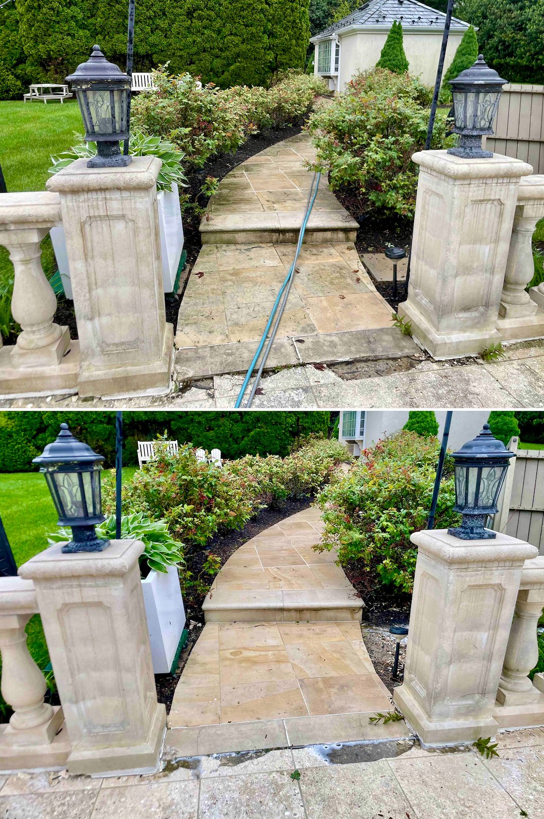 Next we focused on the property’s hardscapes, including the travertine walkways and the pool deck. In Rumson’s shaded corridors, travertine and seashell pavers develop a slick, invisible biofilm that creates a severe slipping hazard. We treated these delicate stone surfaces with products and techniques suited to natural stone, removing the biofilm and restoring the stone’s natural traction in time for the family’s summer season.
