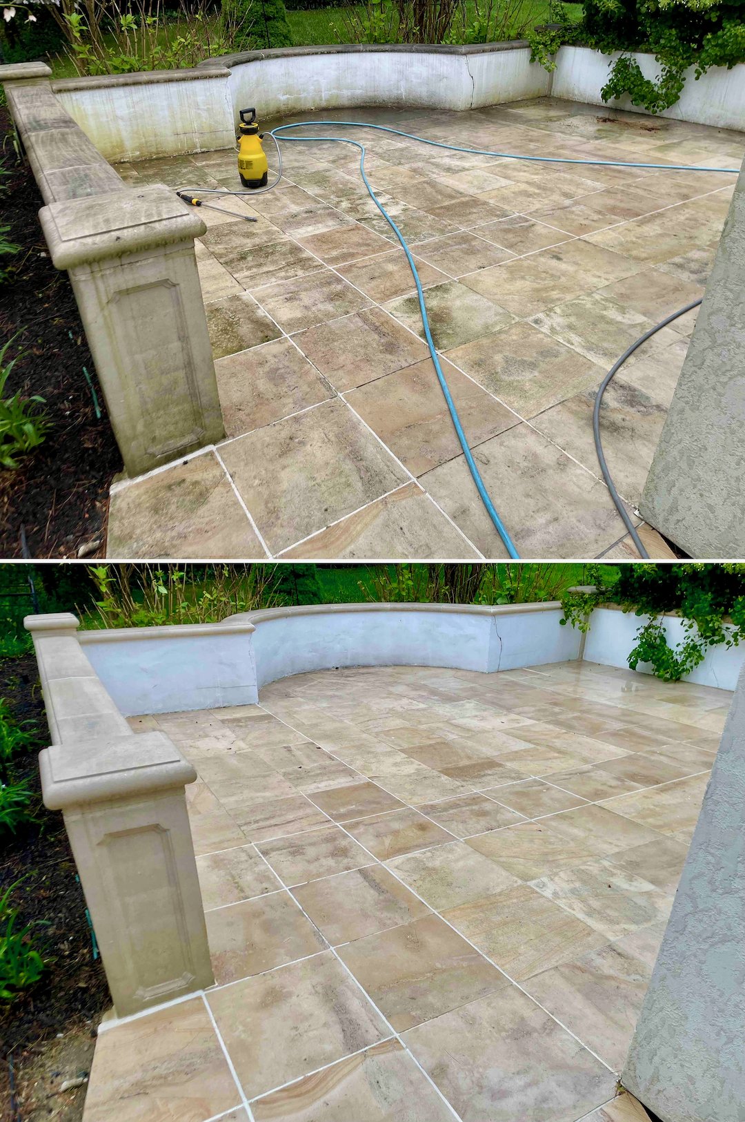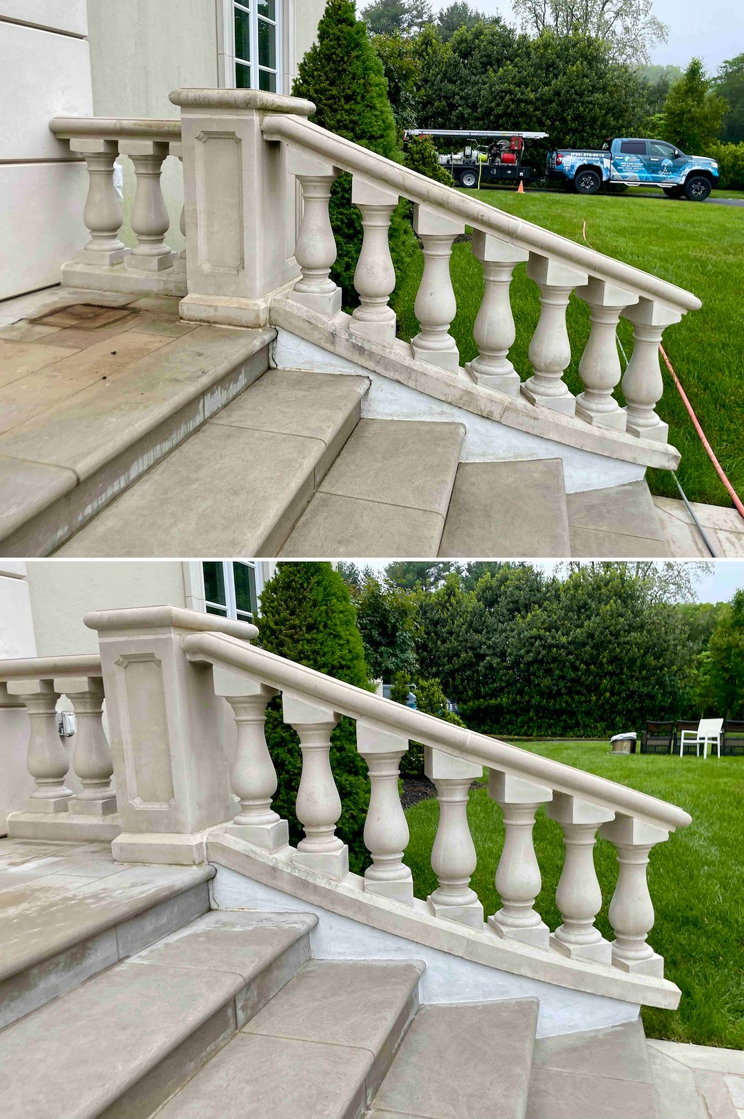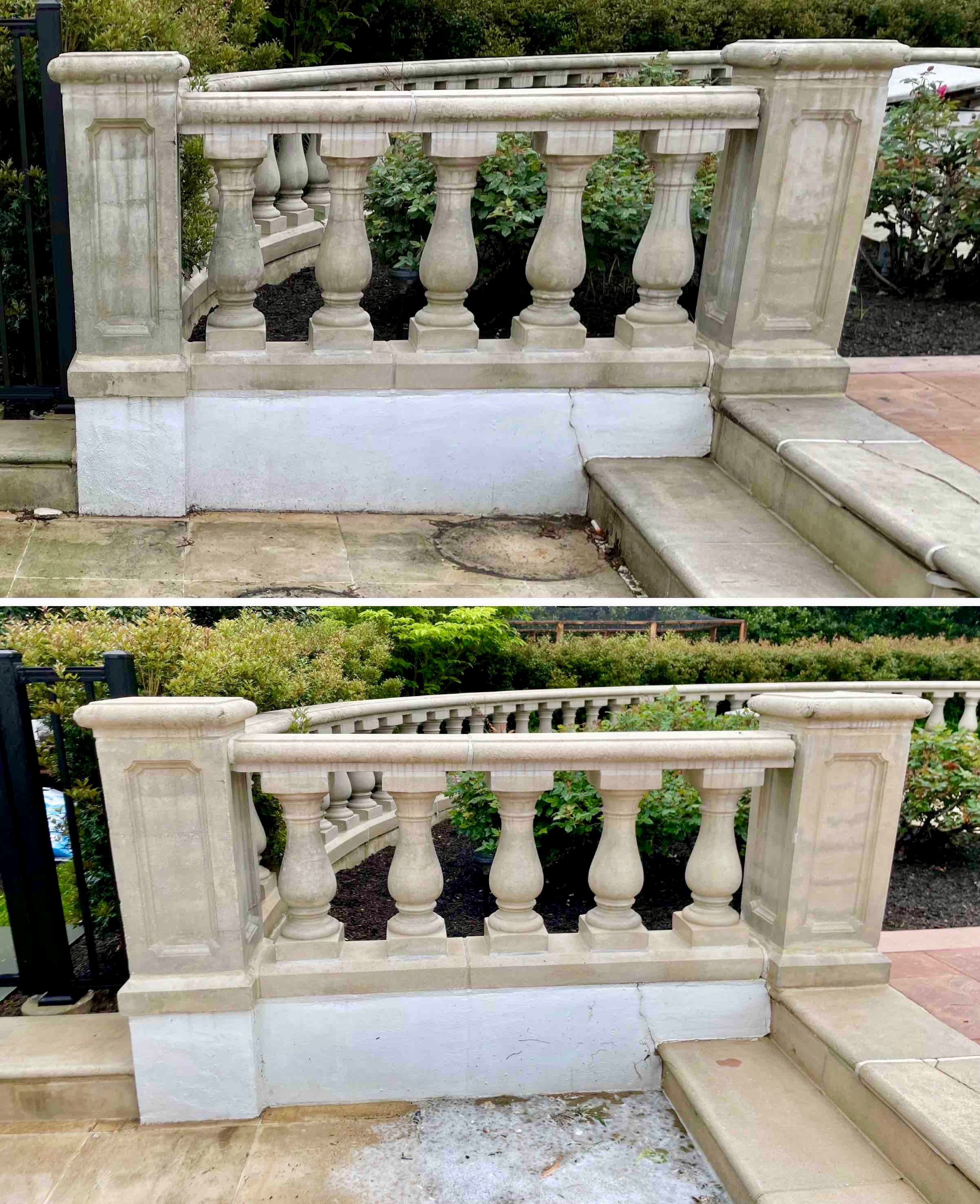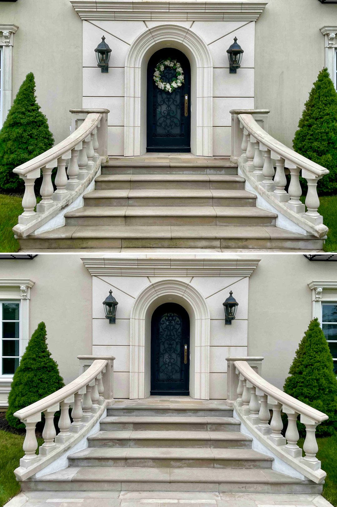 Next we focused on the property’s hardscapes, including the travertine walkways and the pool deck. In Rumson’s shaded corridors, travertine and seashell pavers develop a slick, invisible biofilm that creates a severe slipping hazard. We treated these delicate stone surfaces with products and techniques suited to natural stone, removing the biofilm and restoring the stone’s natural traction in time for the family’s summer season.