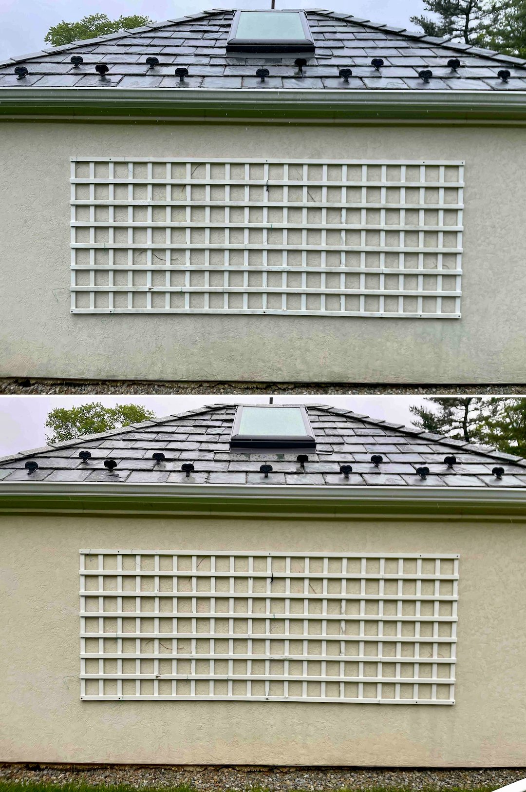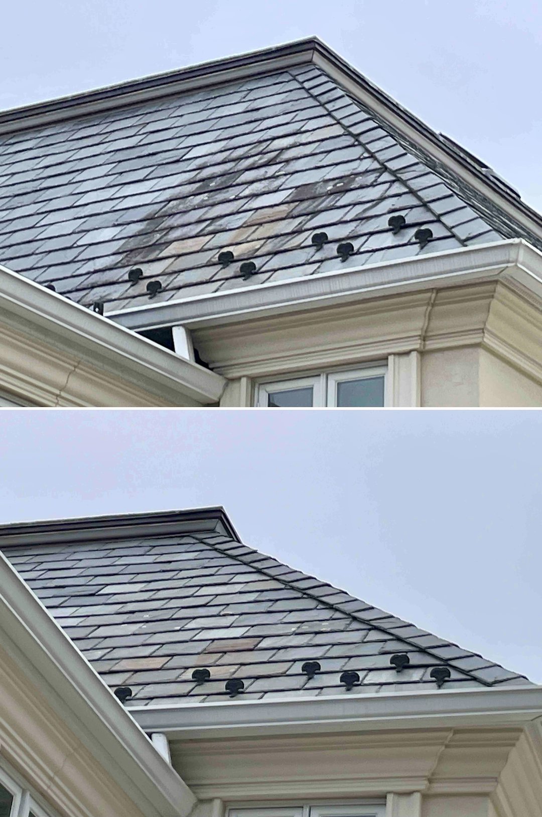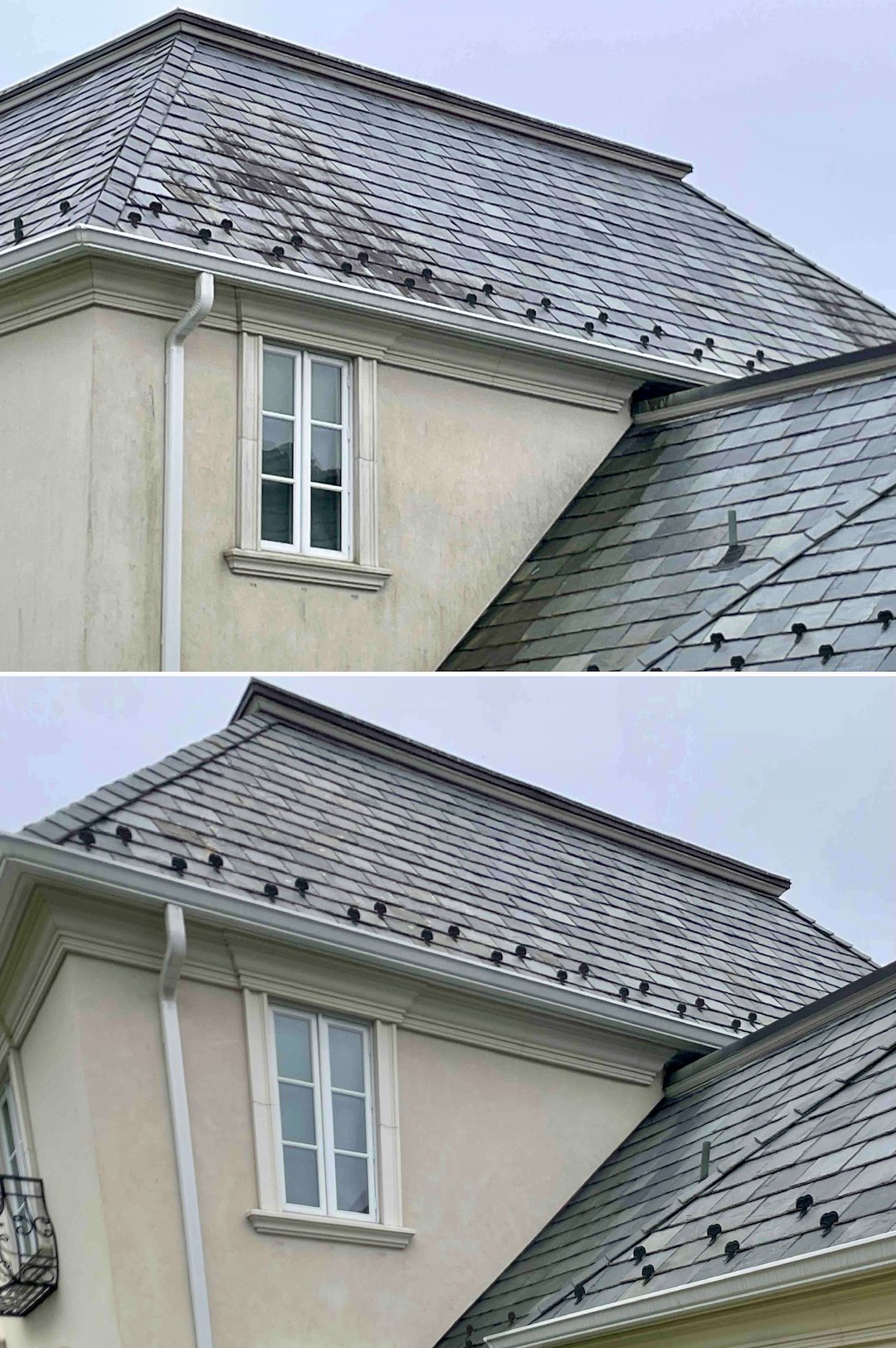 For a Rumson homeowner, a slate roof is more than shelter, it is a lifetime investment. On this two-day project in Rumson, NJ, Above & Beyond Softwash addressed heavy black streaking and organic growth on the home’s north-facing slate sections. The streaks were identified as Gloeocapsa magma, a hardy bacteria that feeds on moisture and gradually degrades a roof’s appearance.