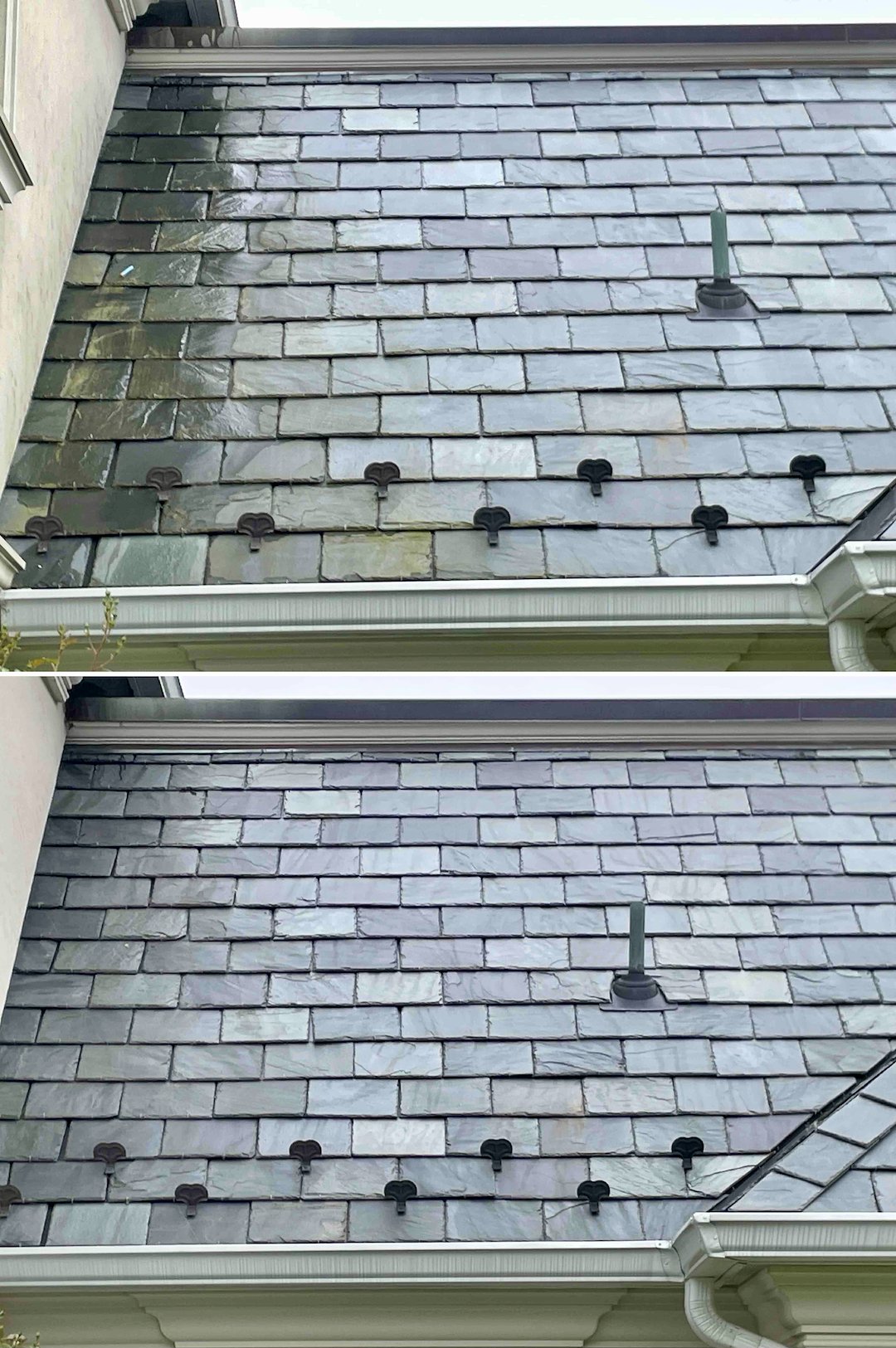 Slate requires a specialist’s touch because it is fragile and porous. We used a calibrated, low-pressure soft wash solution designed to remove organic growth at the root. That no-pressure approach removes black mold and biological staining while avoiding cracked tiles or any compromise to the roof’s structural integrity. Allowing the slate to return to its original architectural brilliance through natural weathering was a key goal of the roof washing service.