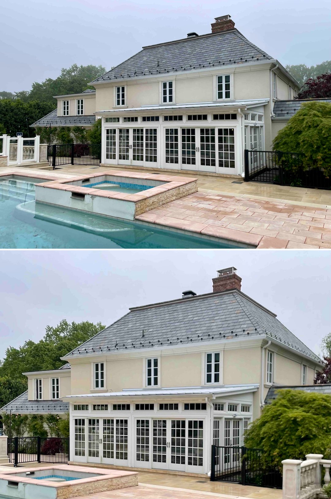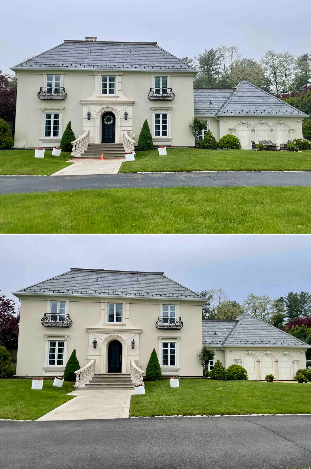 Rumson Estate Exterior Restoration: Slate Roof Wash, Stucco House Cleaning & Travertine Restoration