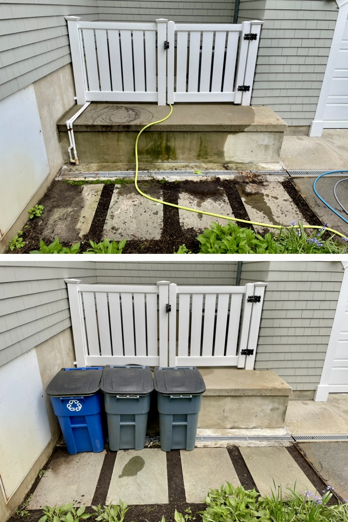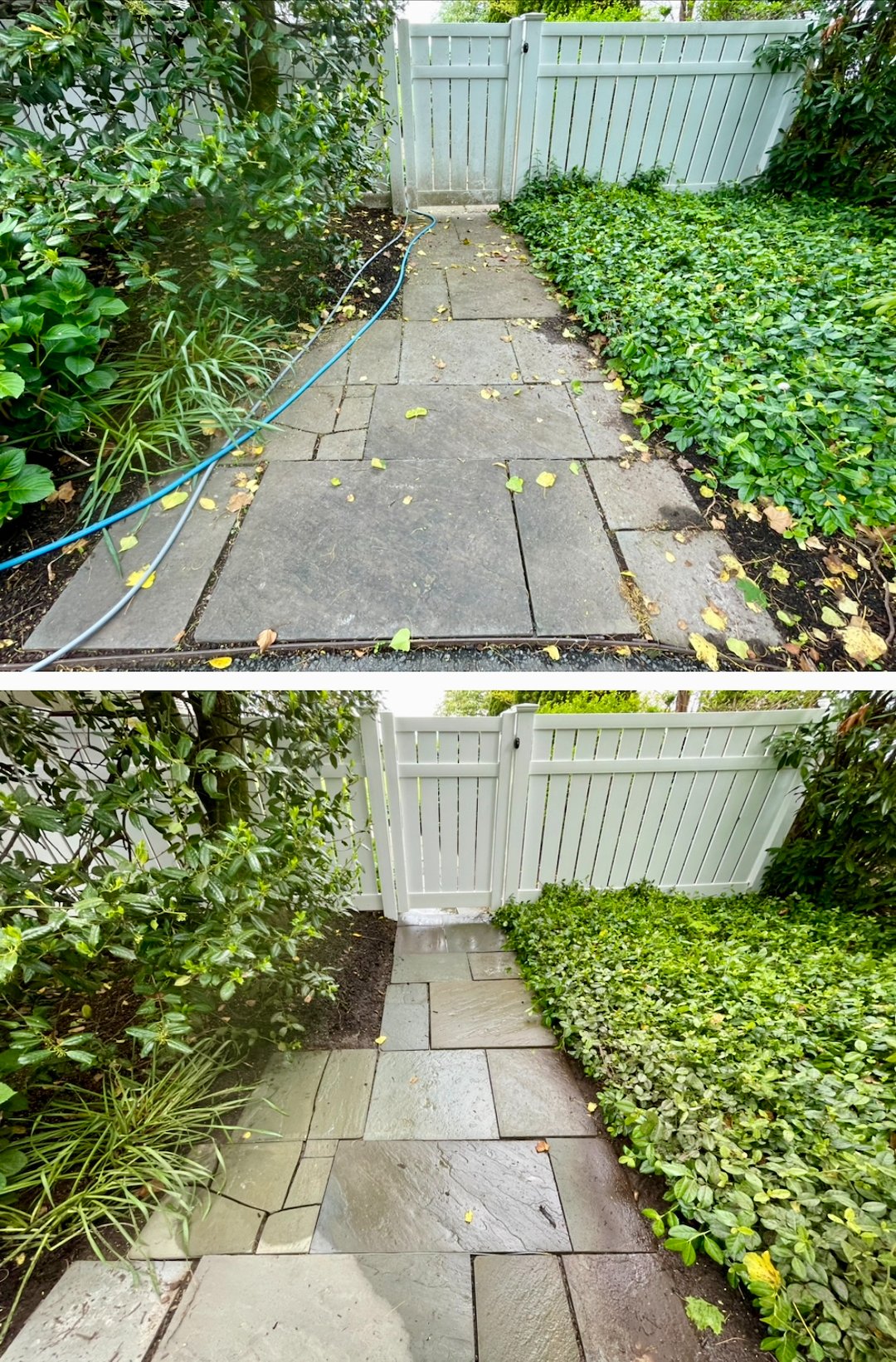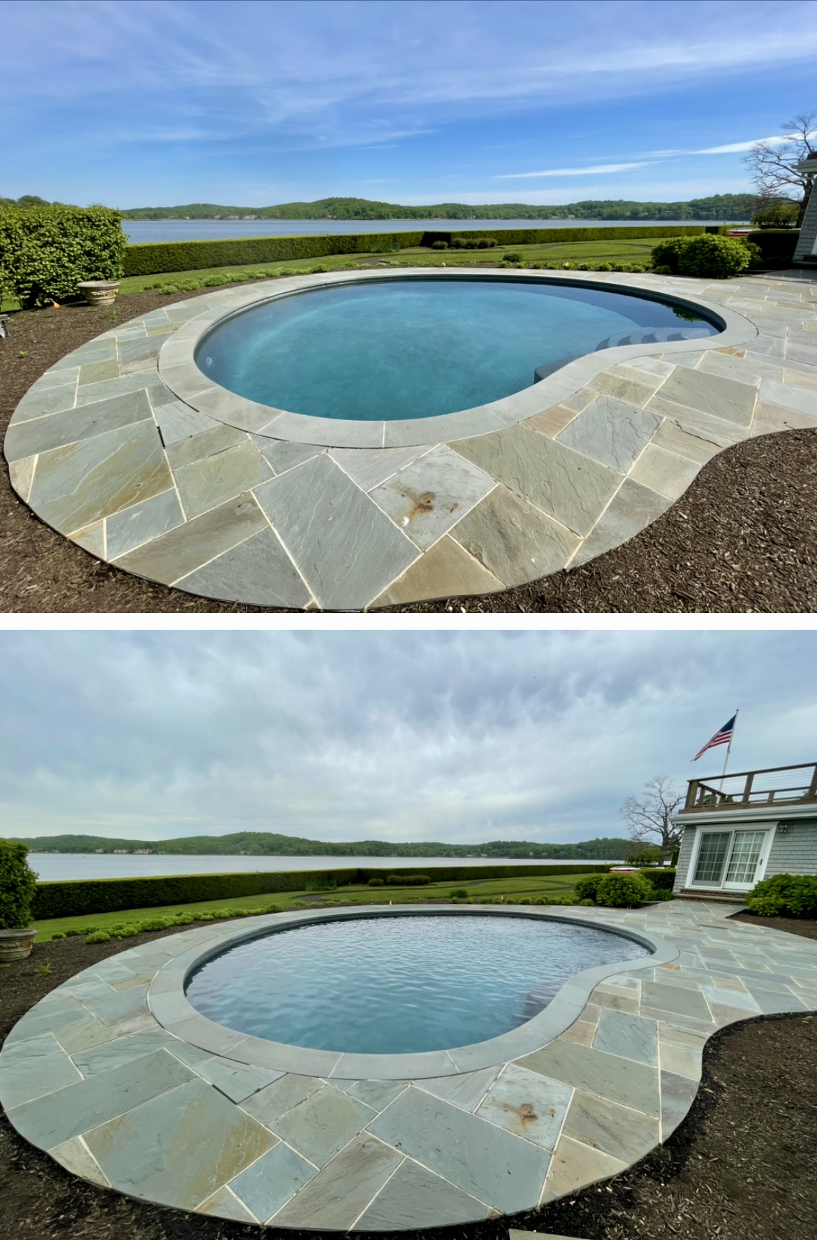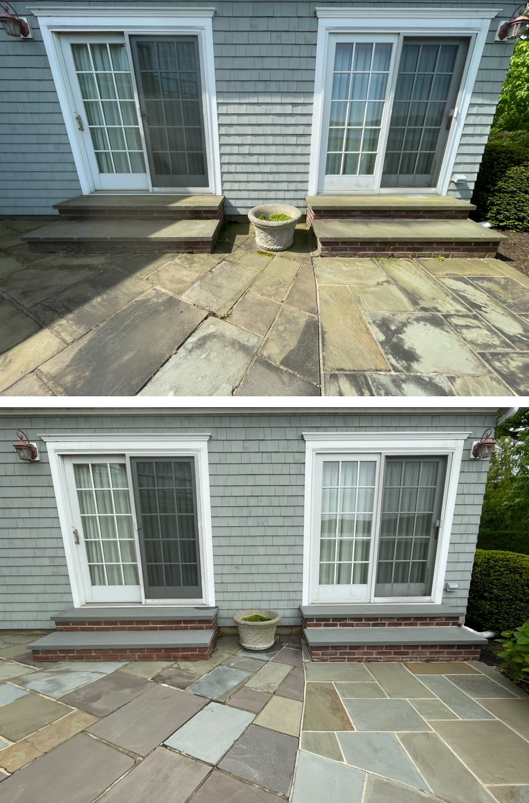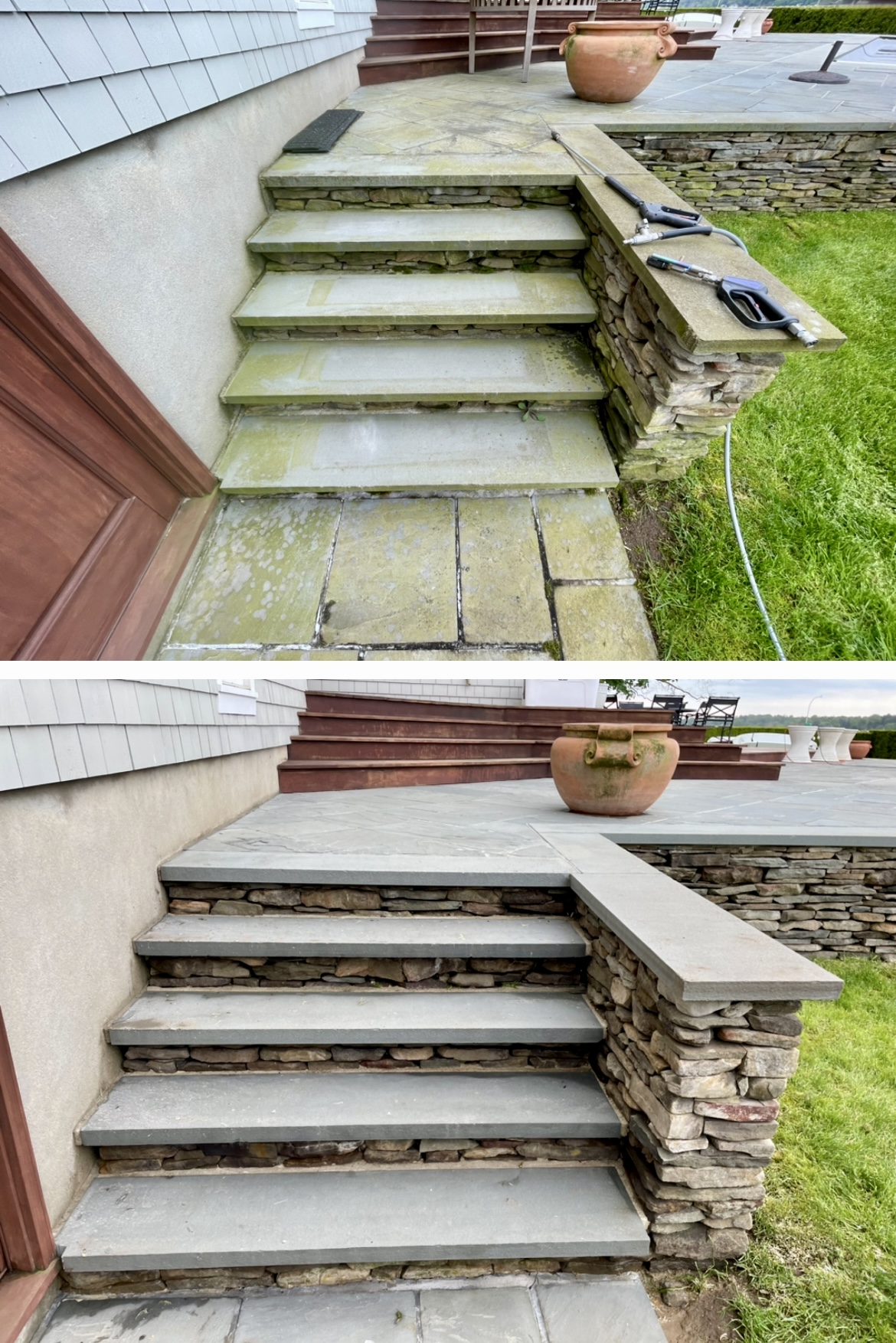 The backyard living spaces required a specific approach because Bluestone is highly porous and tends to trap black algae near pools and shaded patios. For the bluestone patios and pool deck, we used a soft wash to lift organic growth and then followed with a high-pressure rinse to remove remaining deposits and revive the stone's natural color. We also spot-treated the stonework around the pool façade where algae had taken hold, ensuring a consistent look across all backyard stone surfaces.