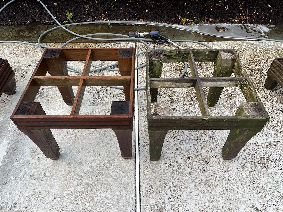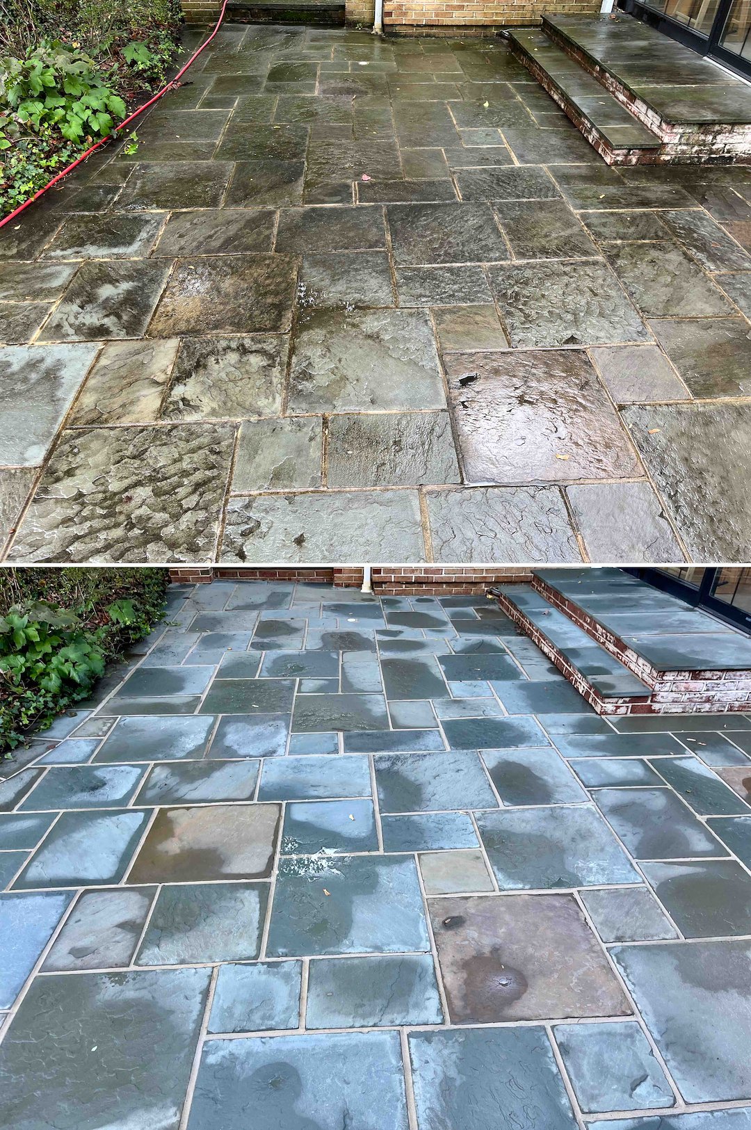 Moving to the ground level, the bluestone and brick cleaning was a real transformation. Walkways that had become slick and dark with thick mold were restored using a low-pressure chemical reset. High pressure can etch premium stone and destroy joint sand, so we avoided it and instead dissolved the mold at the root to reveal the original blue and grey tones. Brick areas with persistent ivy ghosts were treated carefully to remove the tiny black suction marks left by vines, and elevated balconies and poolside wood furniture were fan-rinsed to ensure complete, gentle cleaning.