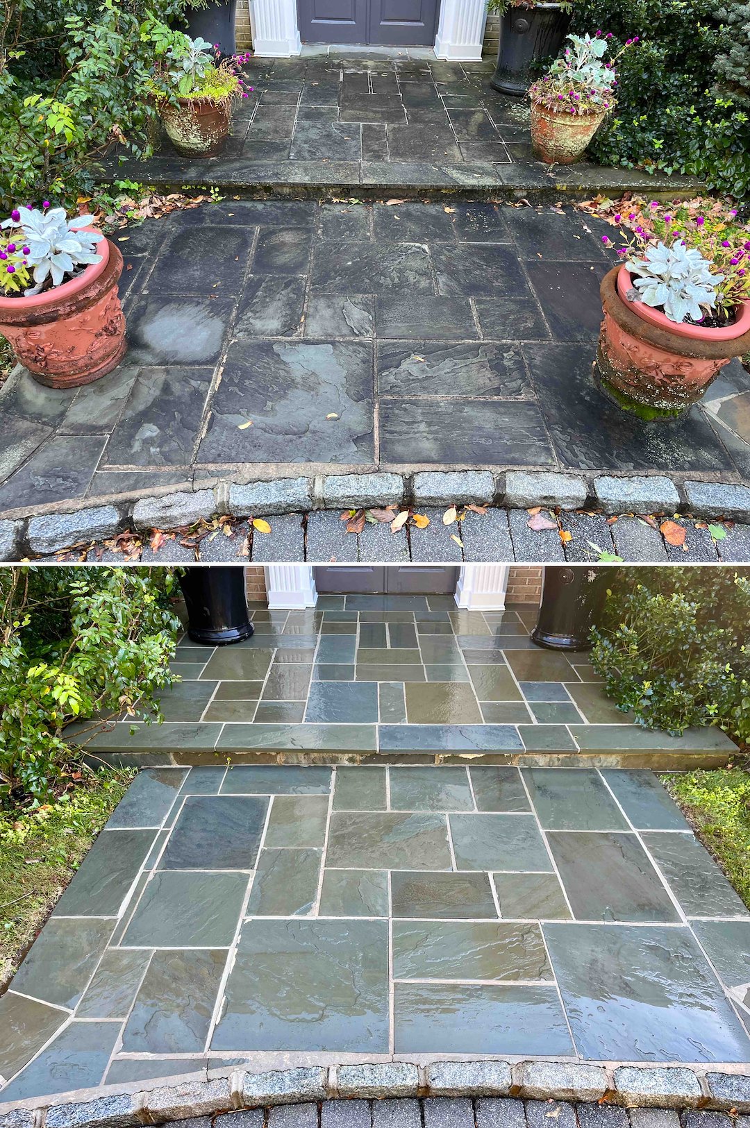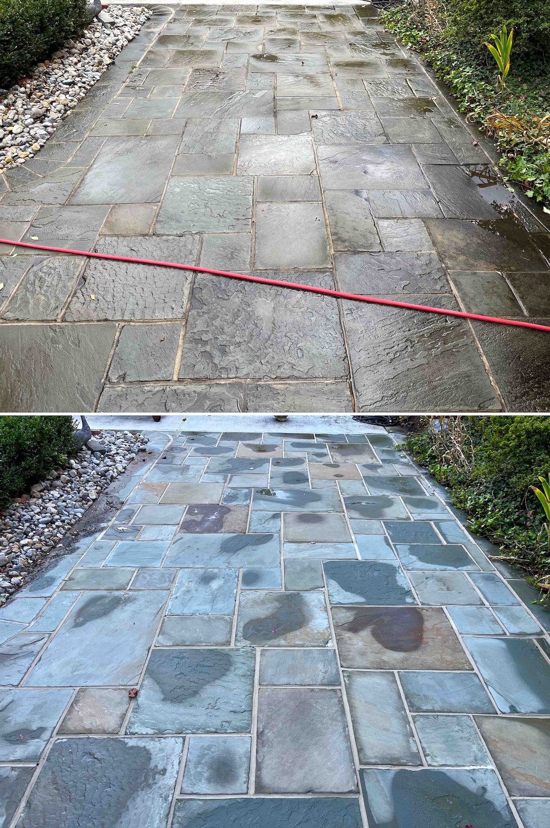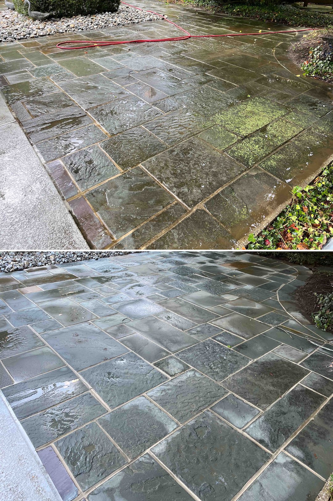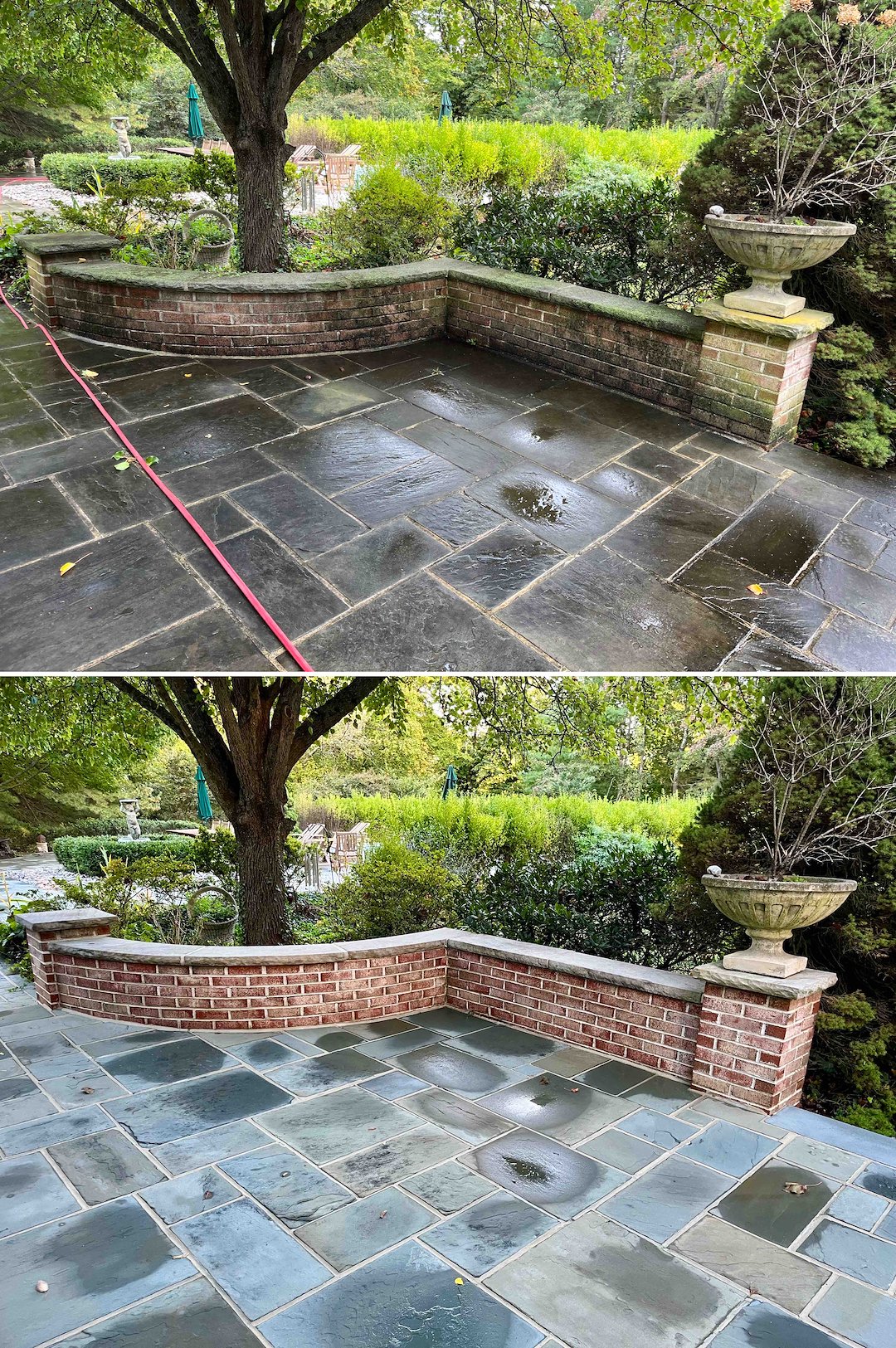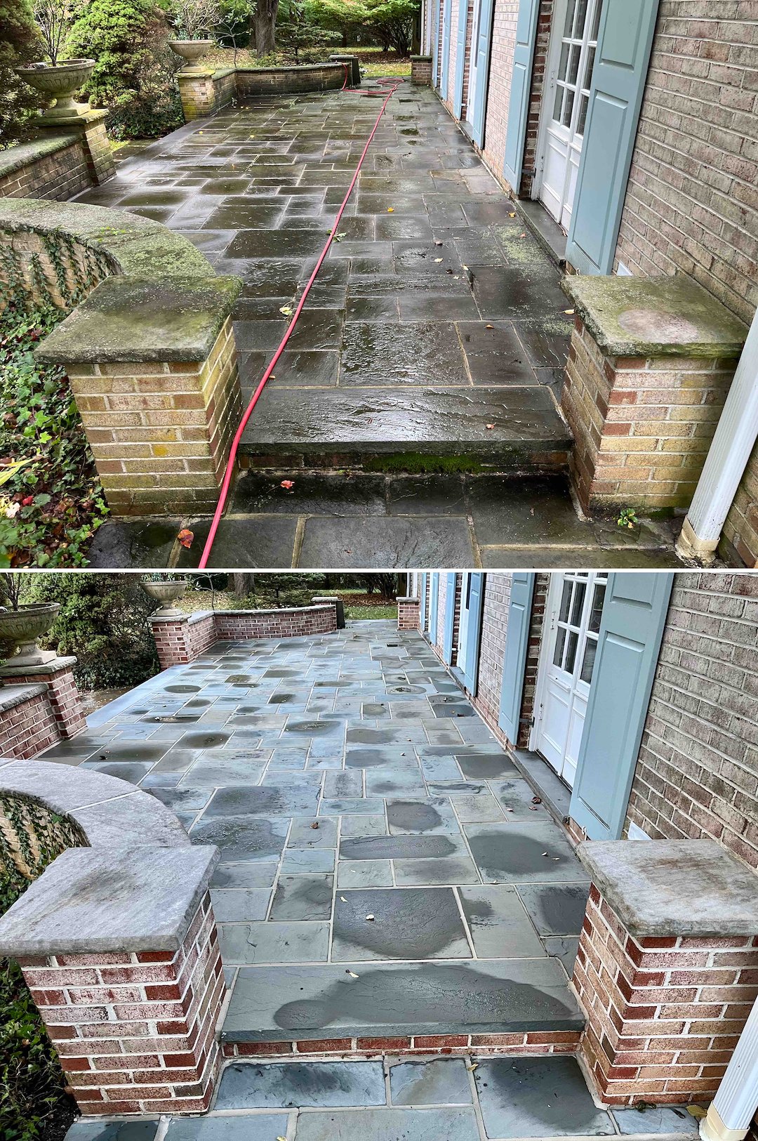 On a grand Rumson, NJ estate, Above & Beyond Softwash completed a full exterior restoration that went far beyond a standard house wash. Years of shade had turned the property into a living example of how moss, bacteria, and old ivy can steal an estate's identity. The roof, siding, bluestone walkways, and detailed outdoor surfaces all needed careful, expert attention to bring the home back to its intended look.
