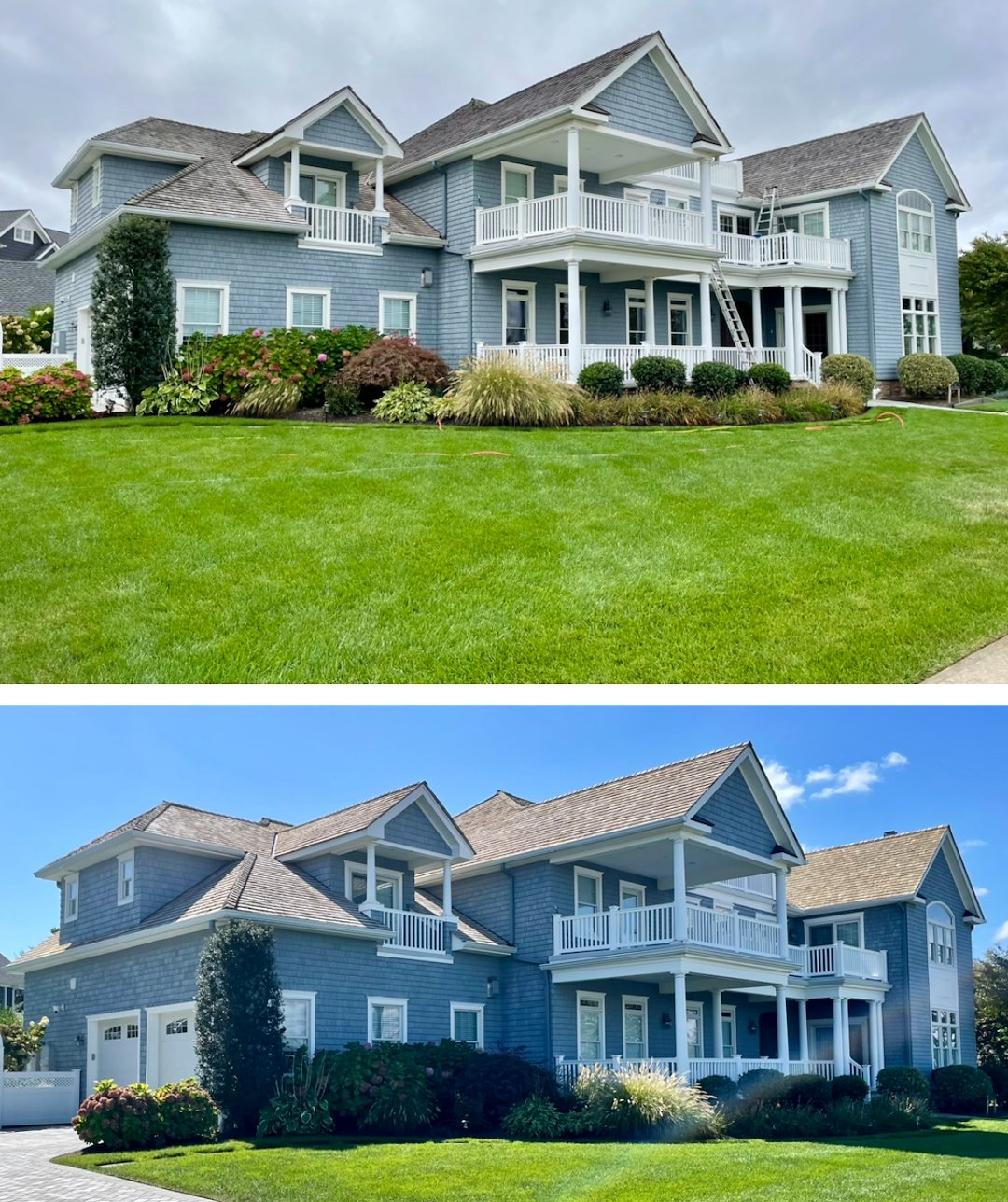 From the four-story roofline down to the concrete sidewalks out front, this Spring Lake mansion received a total exterior reset that both looks better and helps protect building materials from the coastal climate. The combination of a gutter blowout, soft wash roof treatment, full house wash, brick, bluestone, and paver restoration was the right approach to preserve value and avoid future costly repairs.