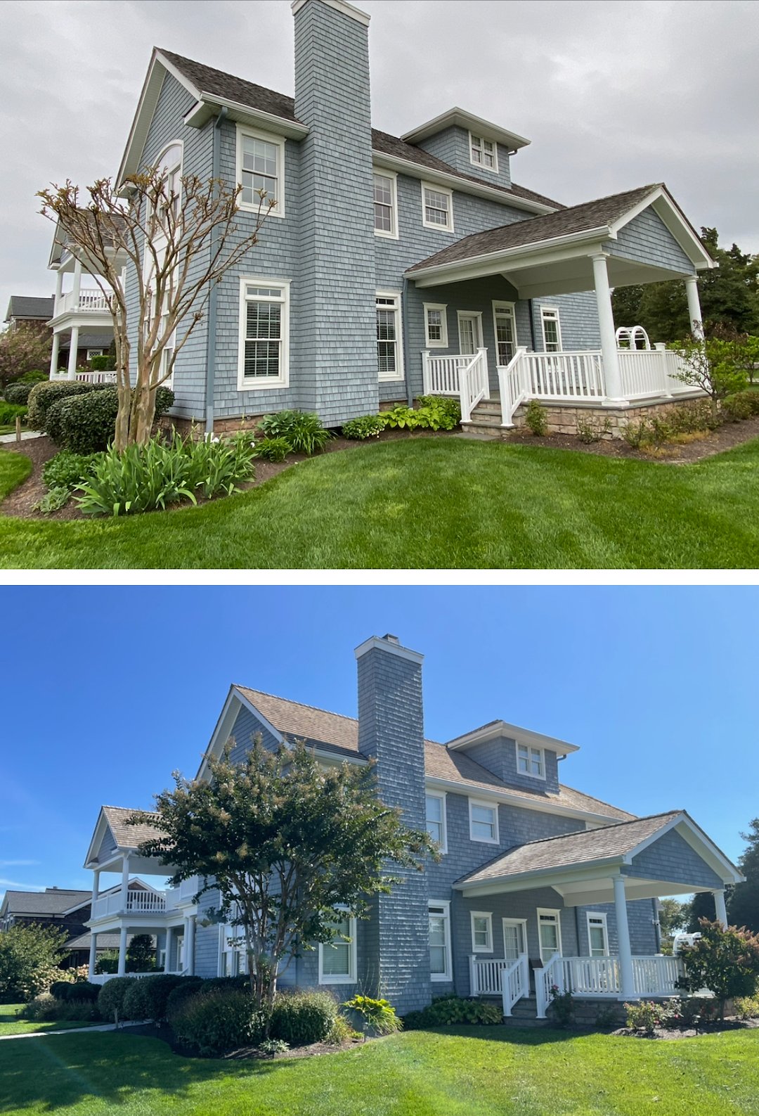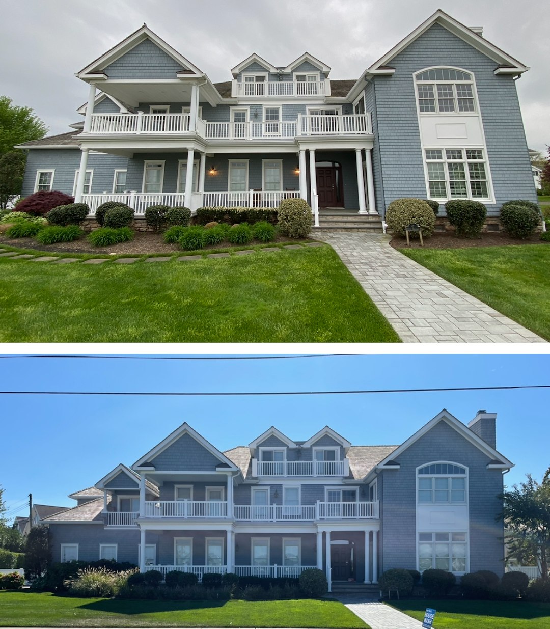 After treating the roof, we completed a Full House Wash across the exterior siding, brick, bluestone, and pavers. We cleaned all of the exterior windows, multi-level balconies and porches with special attention, removing the corrosive film that builds up on waterfront properties. The soft wash treatments sanitized surfaces and lifted organic staining, leaving siding and trim in a condition that reduces ongoing material breakdown.