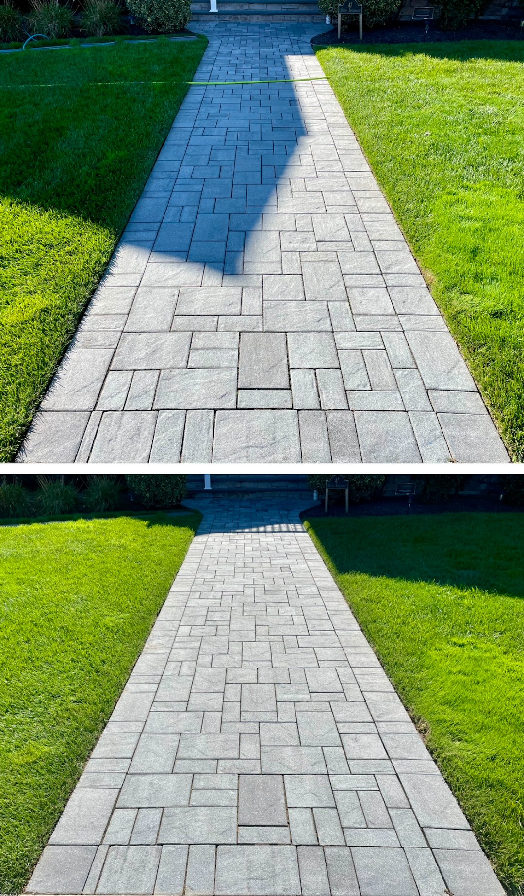The final phase was Professional Paver Restoration for the expansive exterior hardscape. We deep-cleaned the paver driveway, front walkways, and the large rear pool deck and bluestone patio. Using industrial-grade surface cleaners & neutralizers together with pro soft wash treatments, we eradicated heavy organic growth that made stone surfaces slippery and unsightly. Restoring these surfaces improved safety around the pool and walkways and refreshed the overall property appearance.