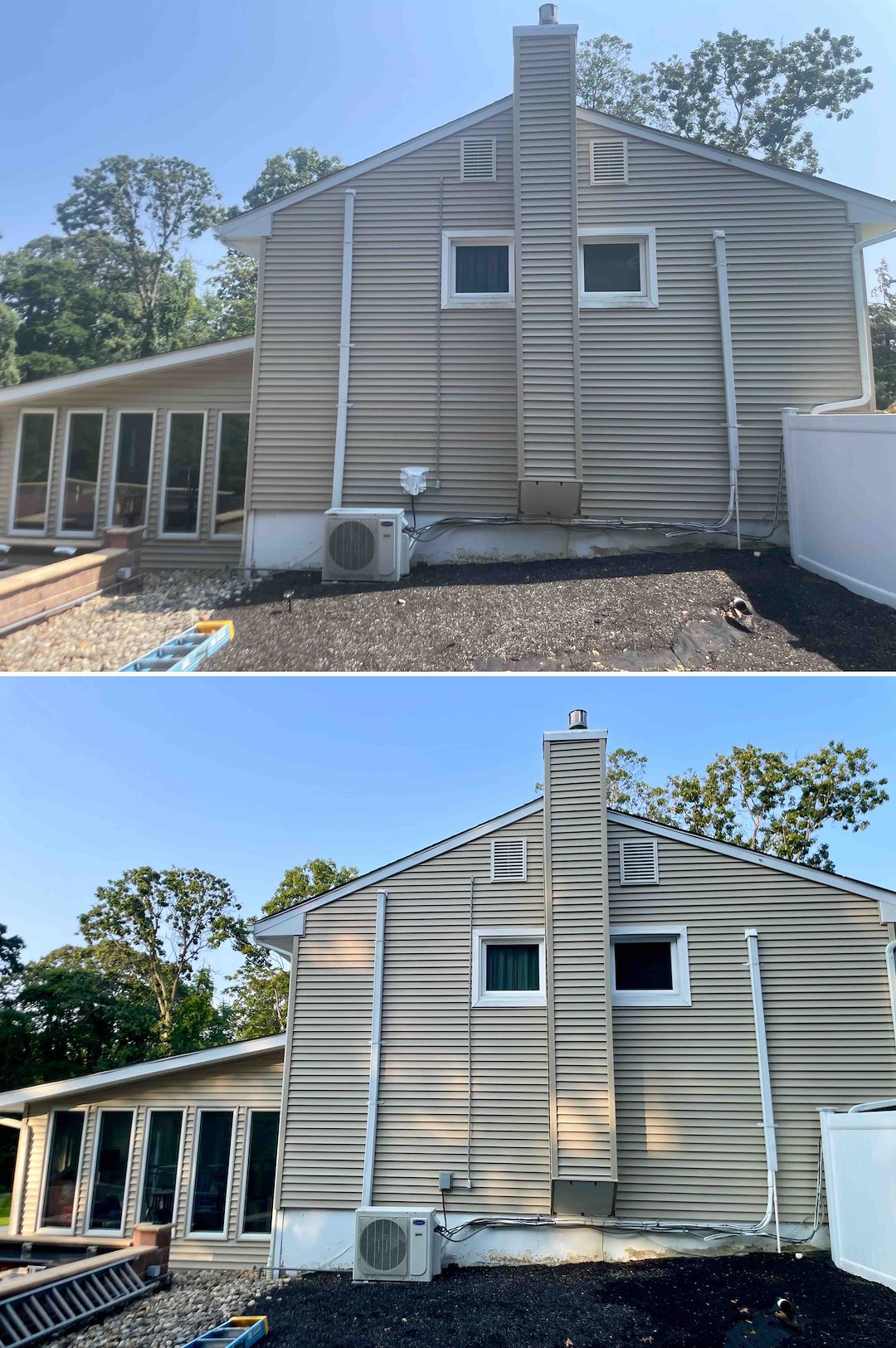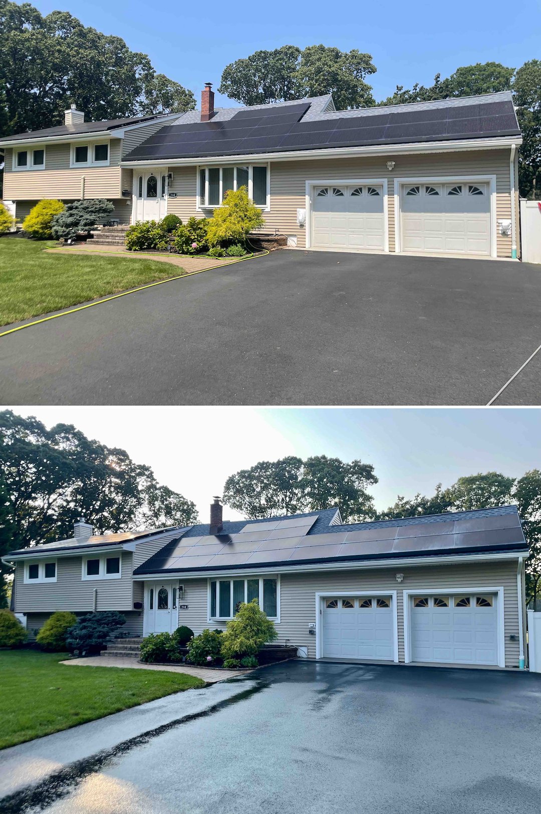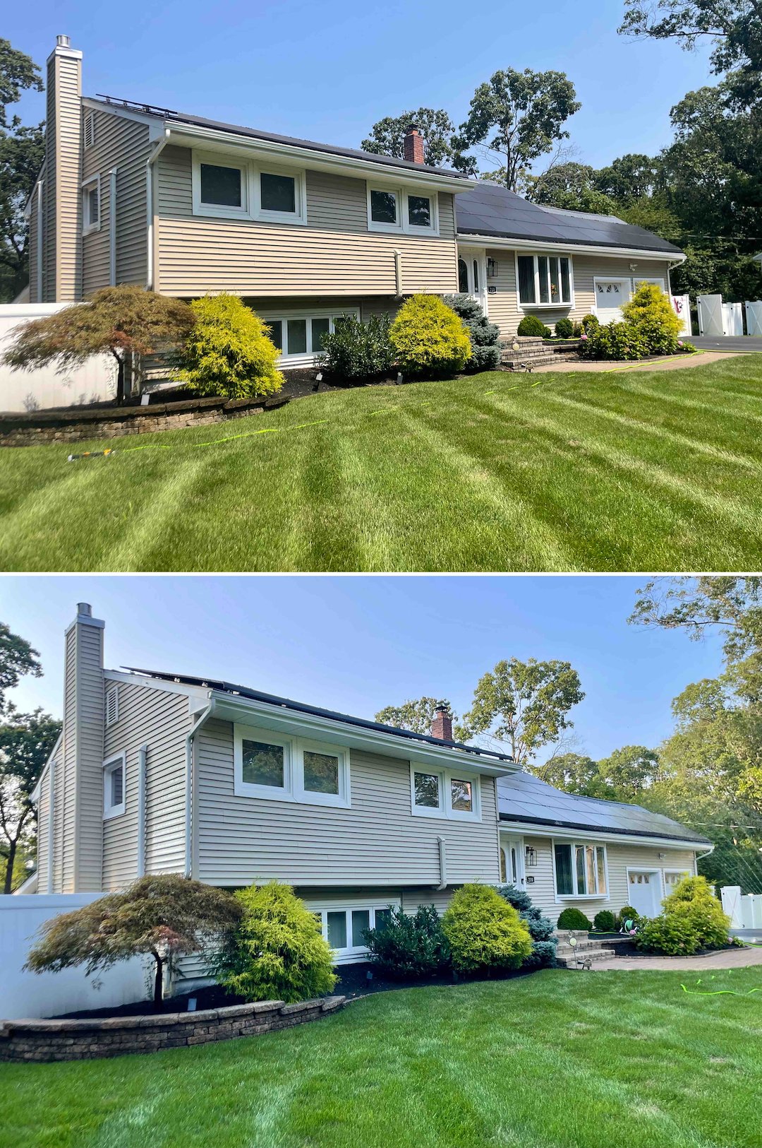 We extended the same careful treatment to the two-story vinyl home. The north side suffered heavy algae buildup, so we treated the siding, soffits, eaves, and even the skylights to restore appearance and reduce biological staining. For the solar panels we performed a low-pressure fan rinse to remove dust and pollen, which helps maintain panel efficiency without risking damage.
