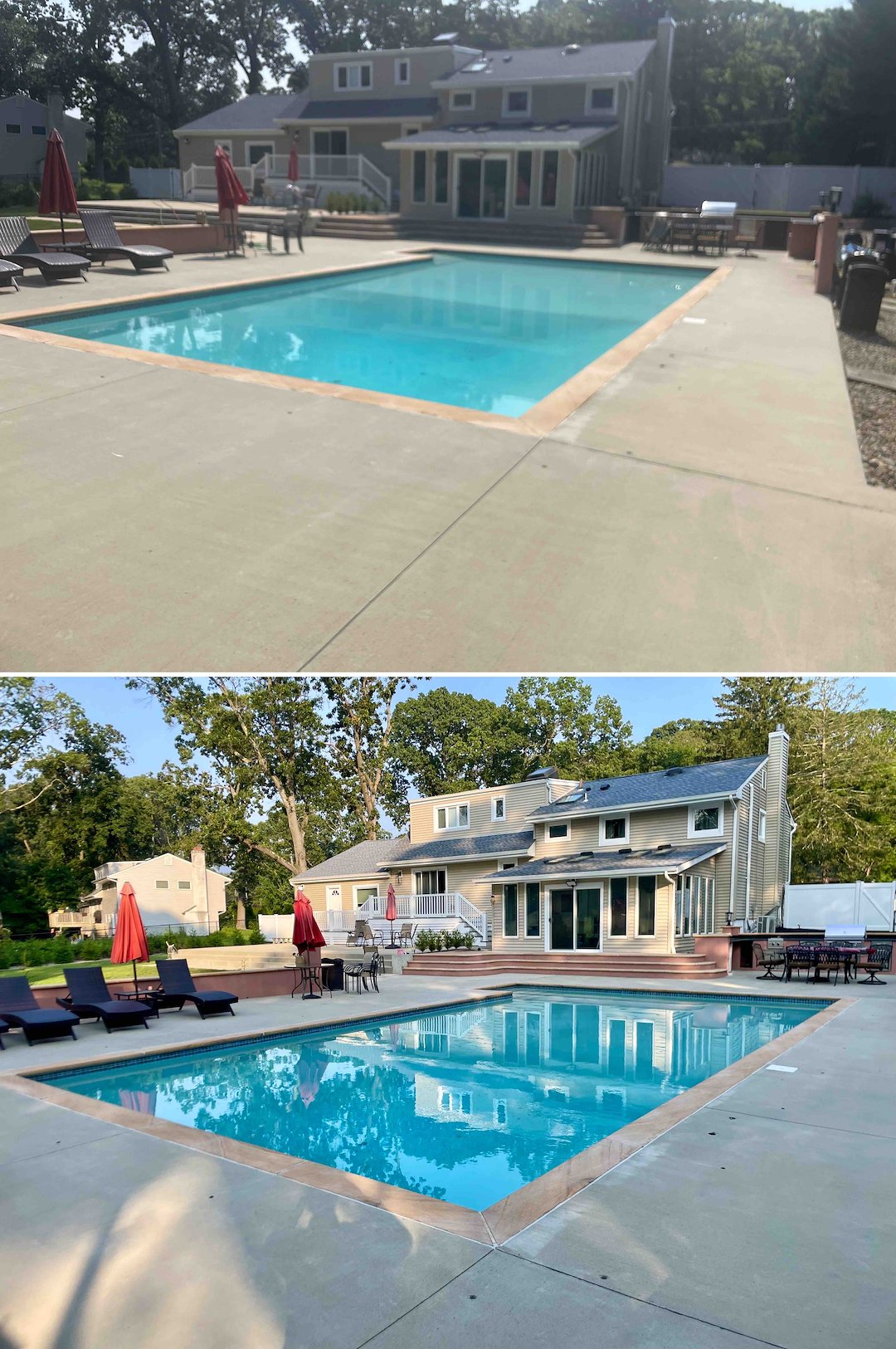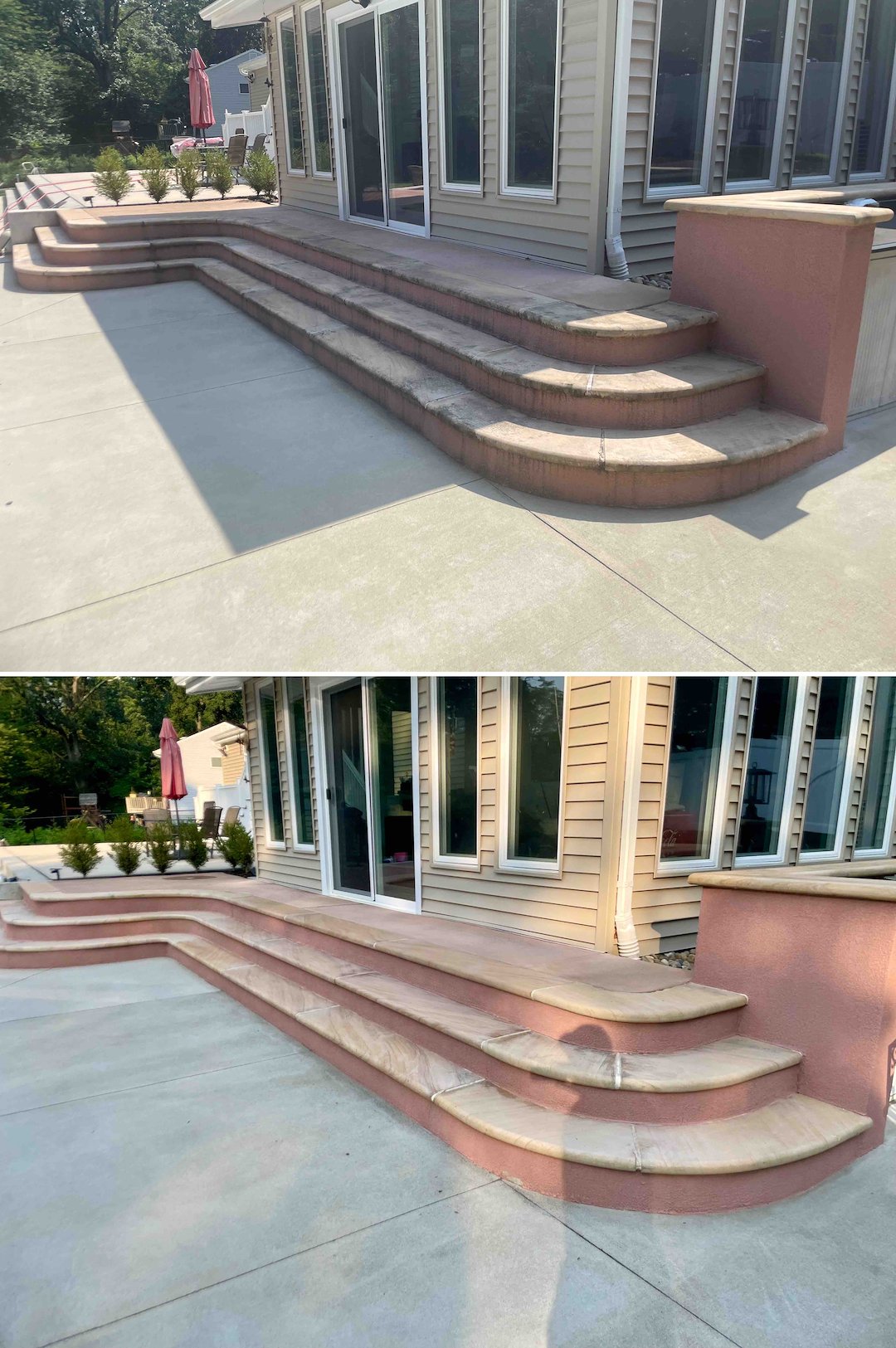 When a two-story estate in Tinton Falls, NJ came to us with a backyard turned green and dangerously slippery, Above & Beyond Softwash handled the full restoration using Soft Washing and paver cleaning techniques designed for high-end hardscapes. The property had extensive paver walls, travertine and paver walkways, a concrete pool deck, front brick stairs, and a large composite rear deck, all affected by severe algae growth and heavy organic staining on the north-side siding.
