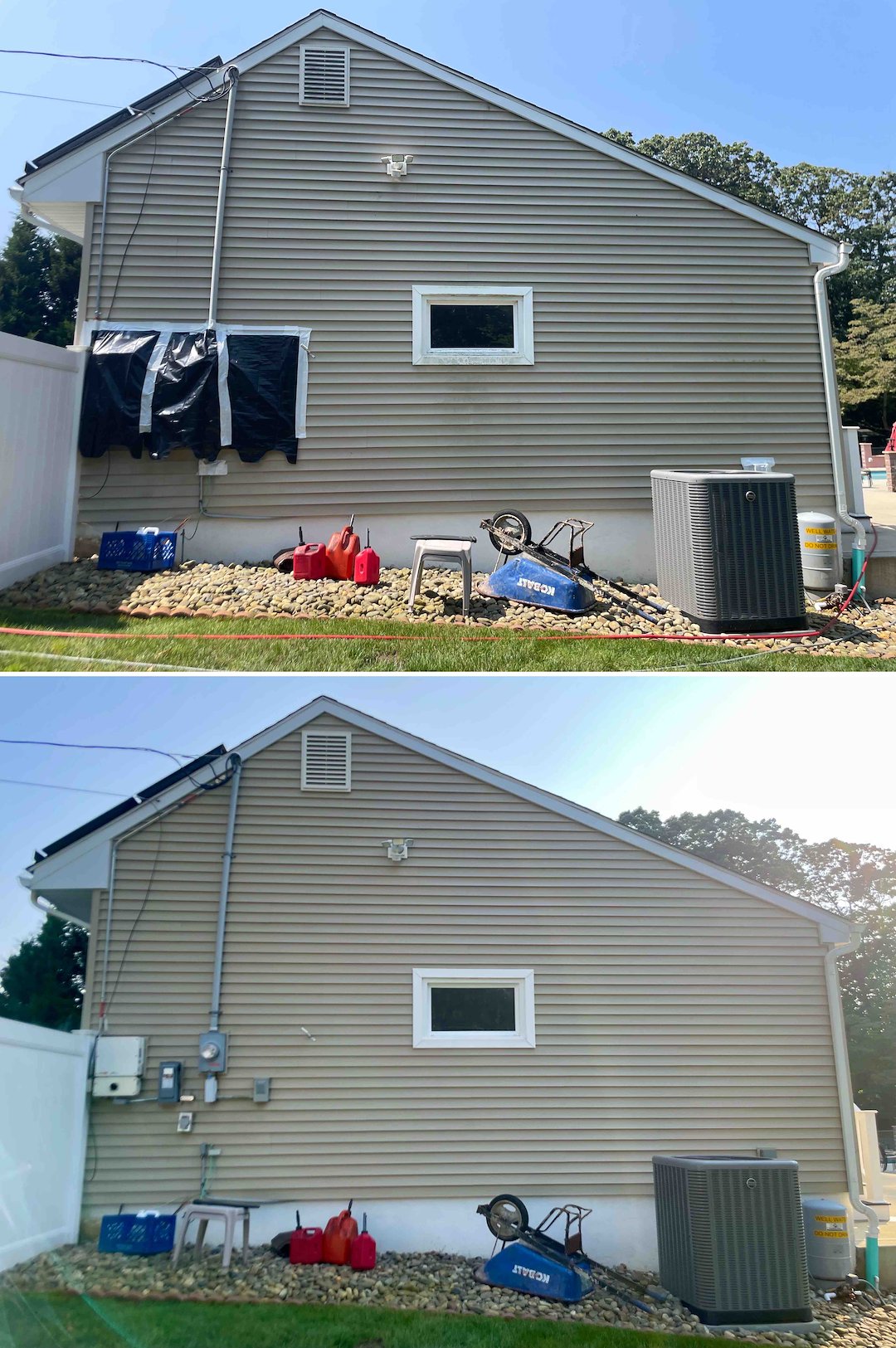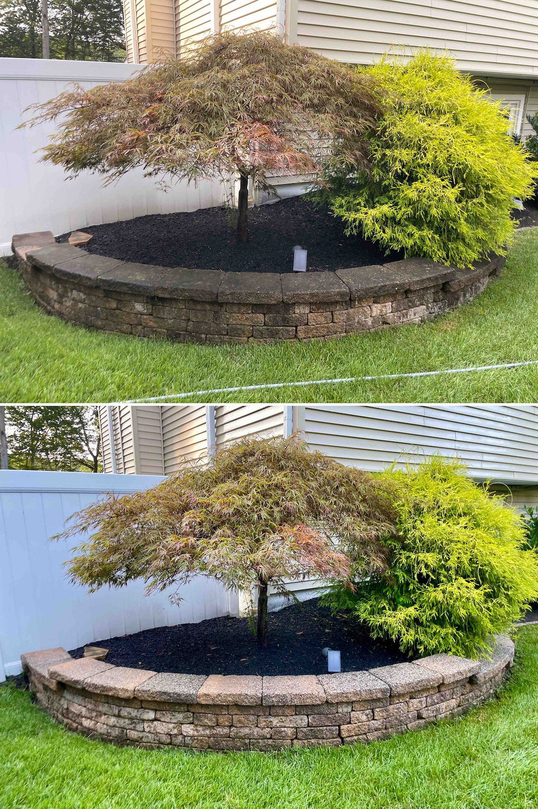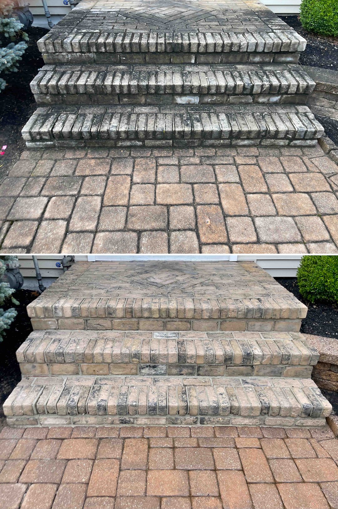 Plant care and safety were part of the plan. The property featured delicate Japanese Maples and extensive landscaping, so we followed a strict plant protect and neutralizer protocol to keep the gardens safe and vibrant during cleaning. We also flushed the driveway for a crisp exit and brushed a stubborn gutter stain above a second-story window to complete the white glove finish.