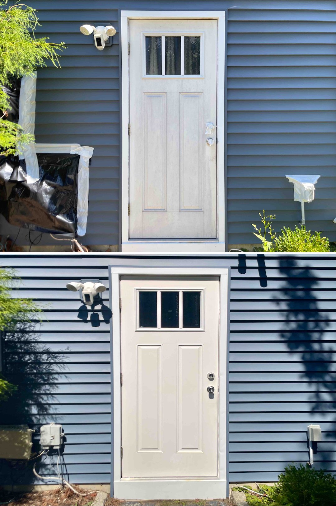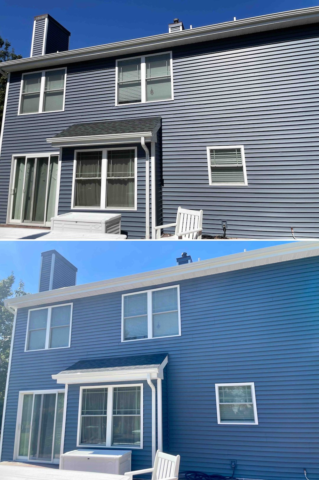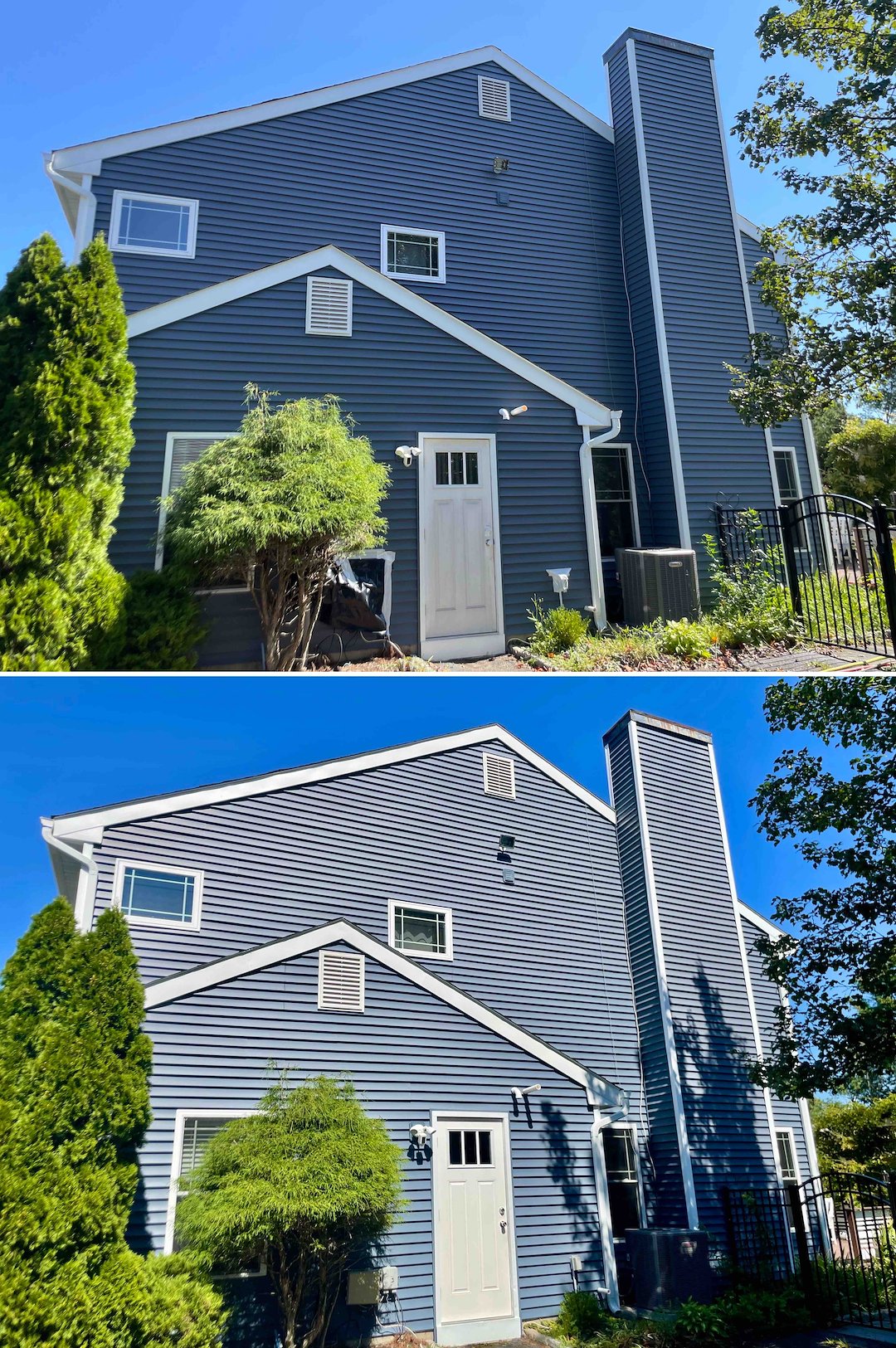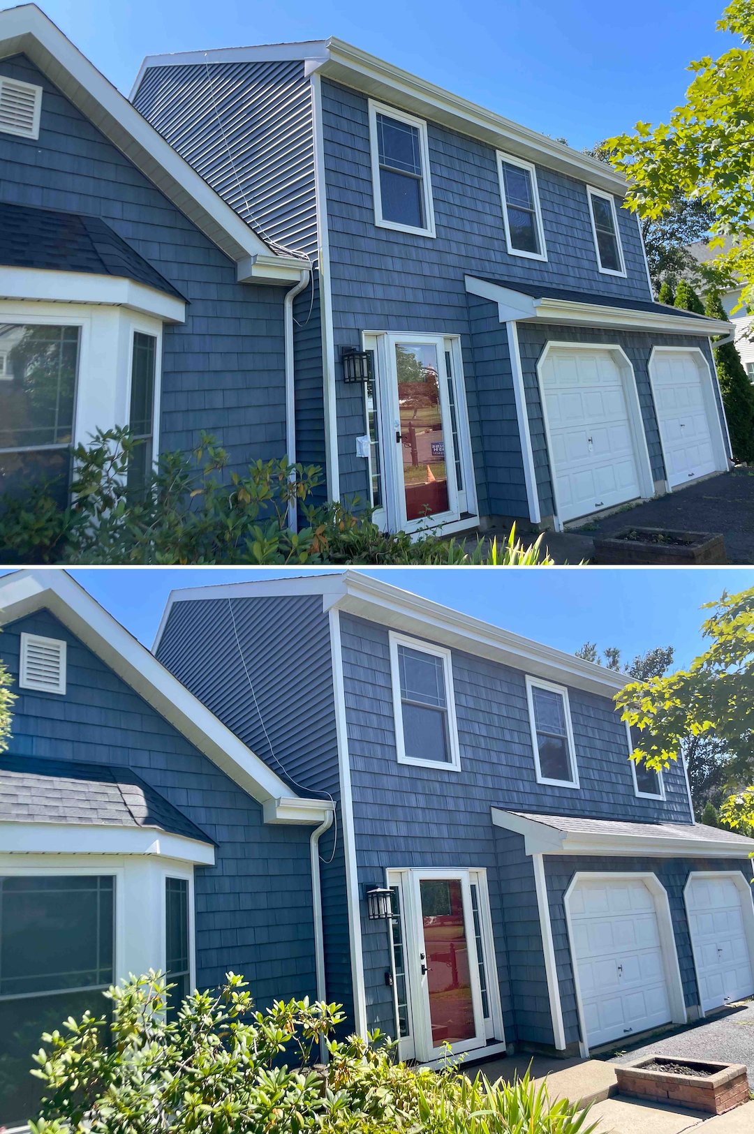 This Tinton Falls, NJ project involved a two-story vinyl sided home where mature tree canopies and shaded areas encouraged aggressive organic growth. The north side trim had turned green from algae, the front walkway was black with mold and dangerously slick, and the vinyl showed UV oxidation during our pre-inspection. Above & Beyond Softwash completed a full exterior restoration using our Soft Wash System to address these issues safely and effectively.