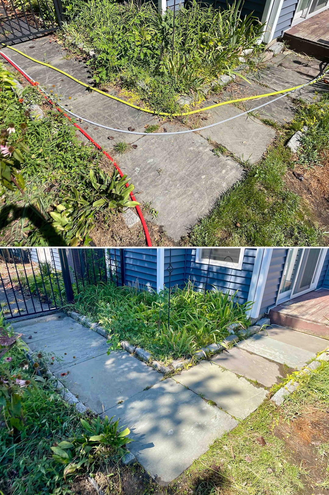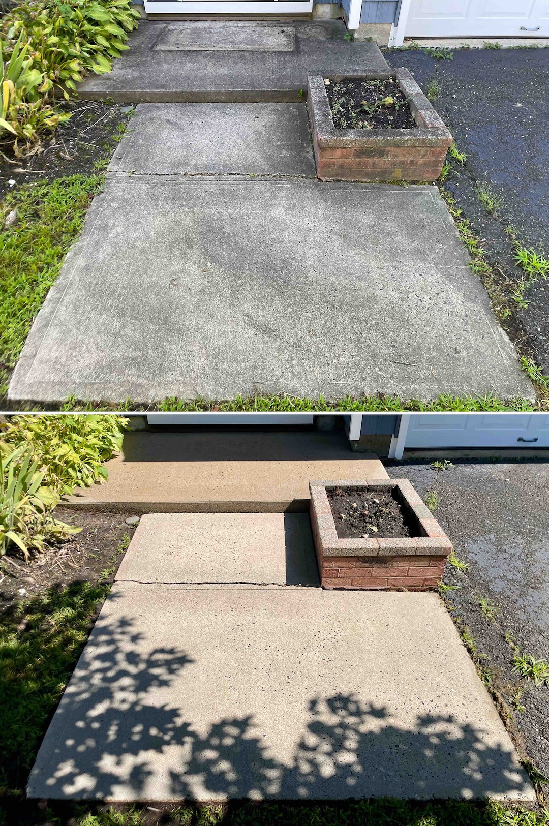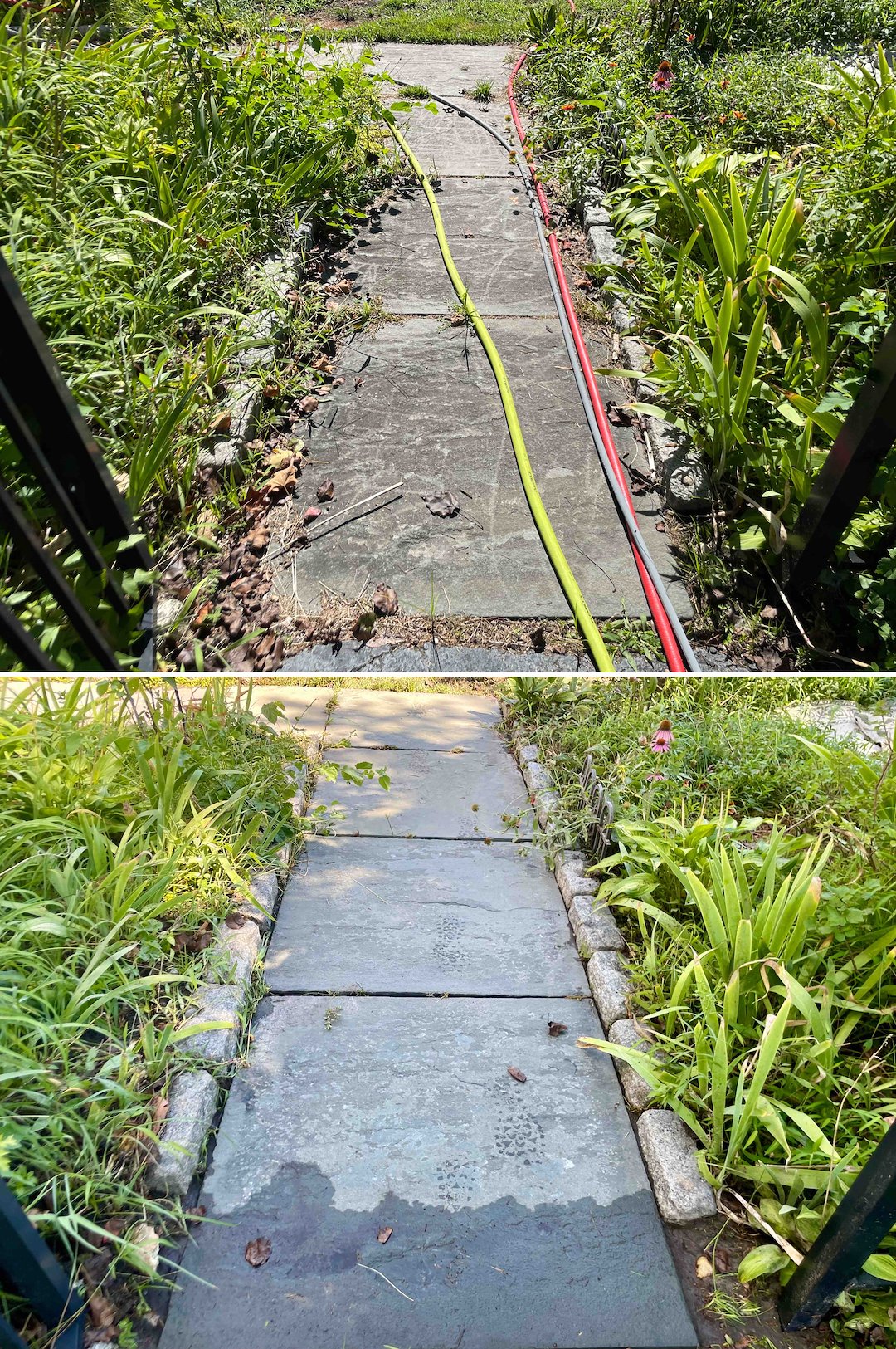 The concrete walkway required a different approach because its pores had been overtaken by black mold. When damp, that black mold is an extreme slipping hazard. We treated the concrete with a deep-cleaning biocide that strips organic growth from the pores, restoring the walkway to a bright, slip-resistant condition. The homeowner said the "walkway looks completely different," which confirmed the safety and aesthetic improvement we achieved.