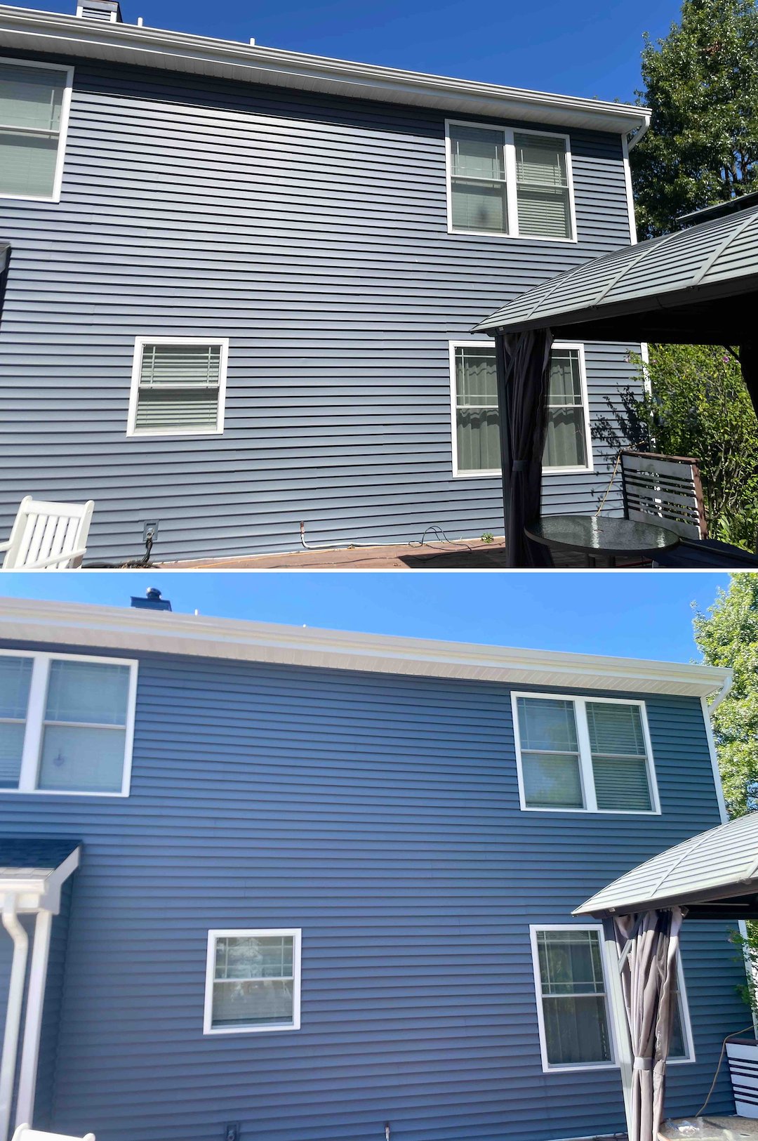 For the trim and siding, we applied a customized cleaning solution with low pressure to neutralize the algae at the root without damaging painted surfaces. The work included soffits, eaves, garage doors, and the white painted furniture on the rear deck. As the homeowner noted, "My not-so-white trim is white again," which reflects the sanitation and brightening result our Soft Wash System delivers without harsh pressure.